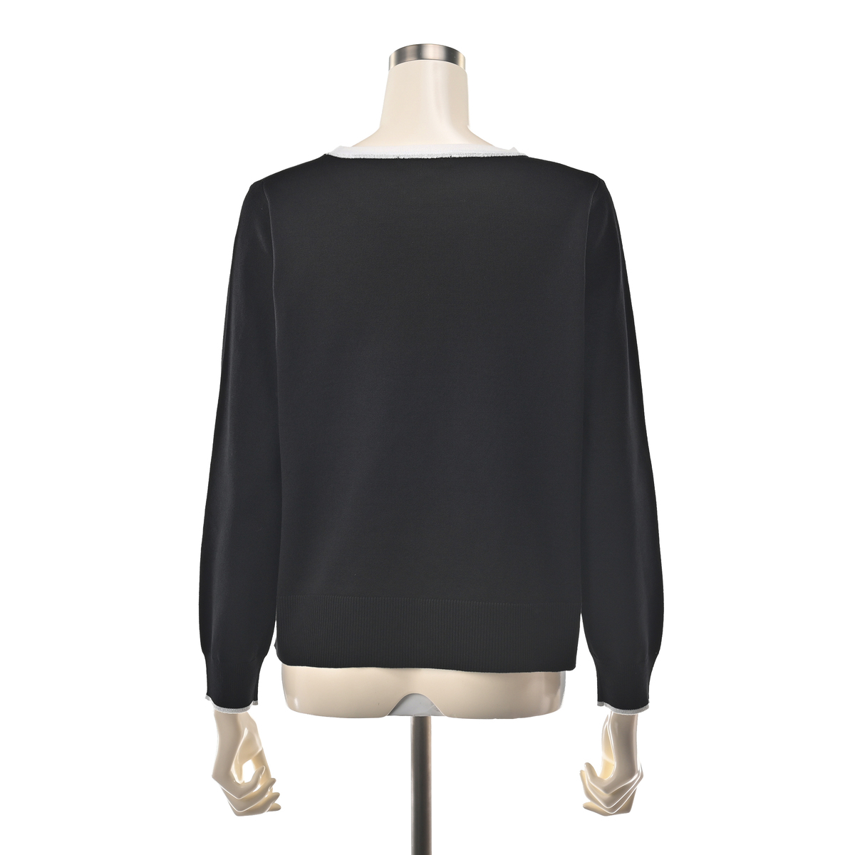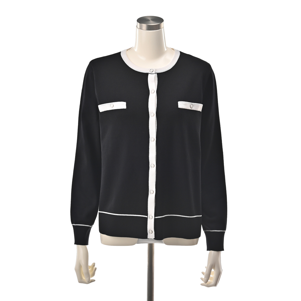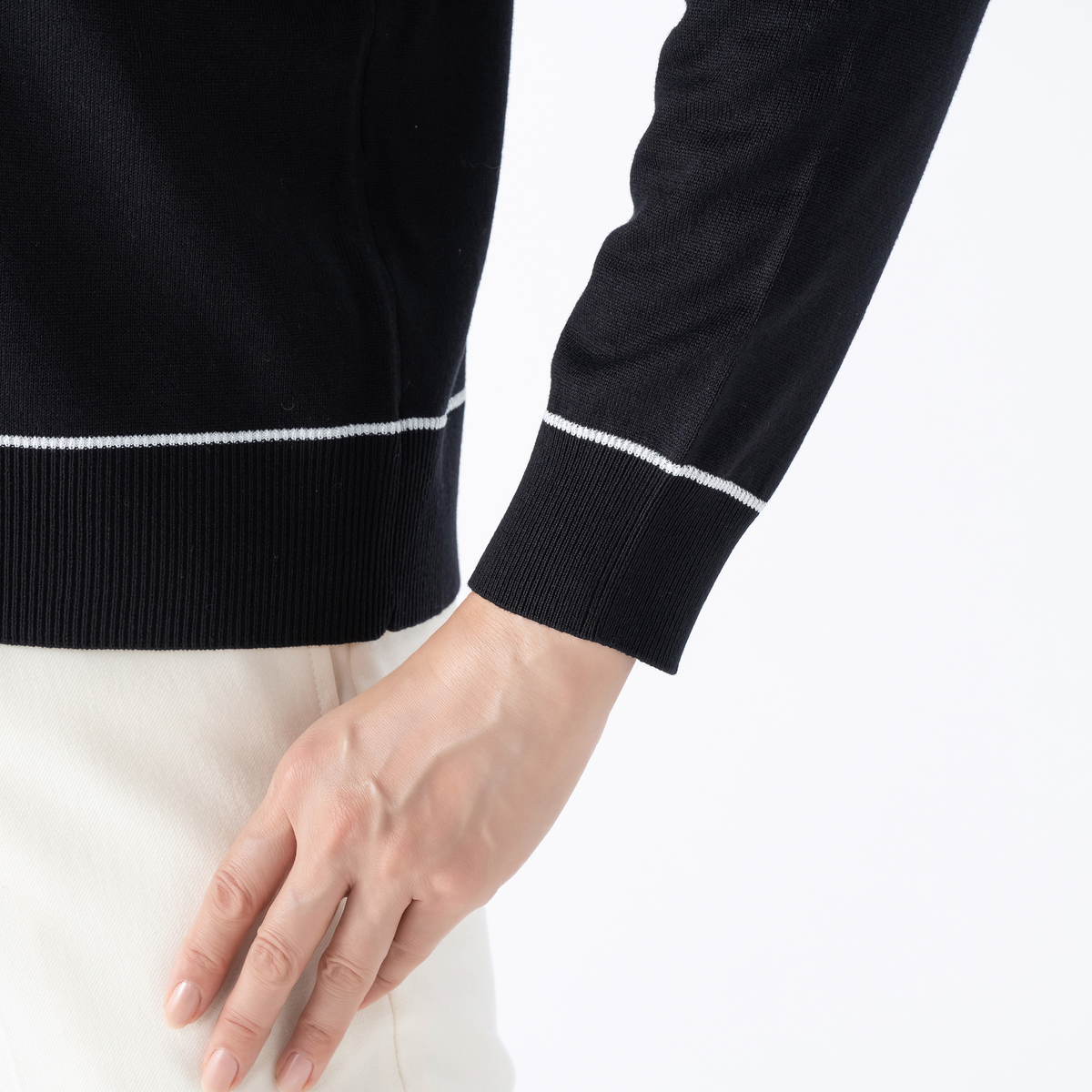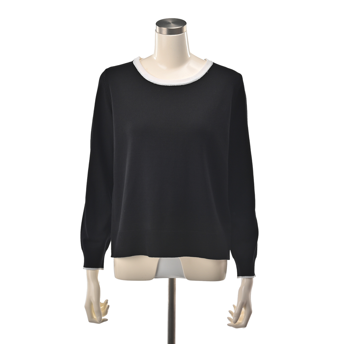 きれいな艶感できちんと感のあるニットアンサンブル。大人の配色ラインがデザインのアクセントになっています。細い配色部分にラメ糸を使いながらも、インナー衿ぐりの内側にはラメ糸が出ない仕様に。上質感のある素材でなめらかな肌触りが、心地良い着用感をもたらします