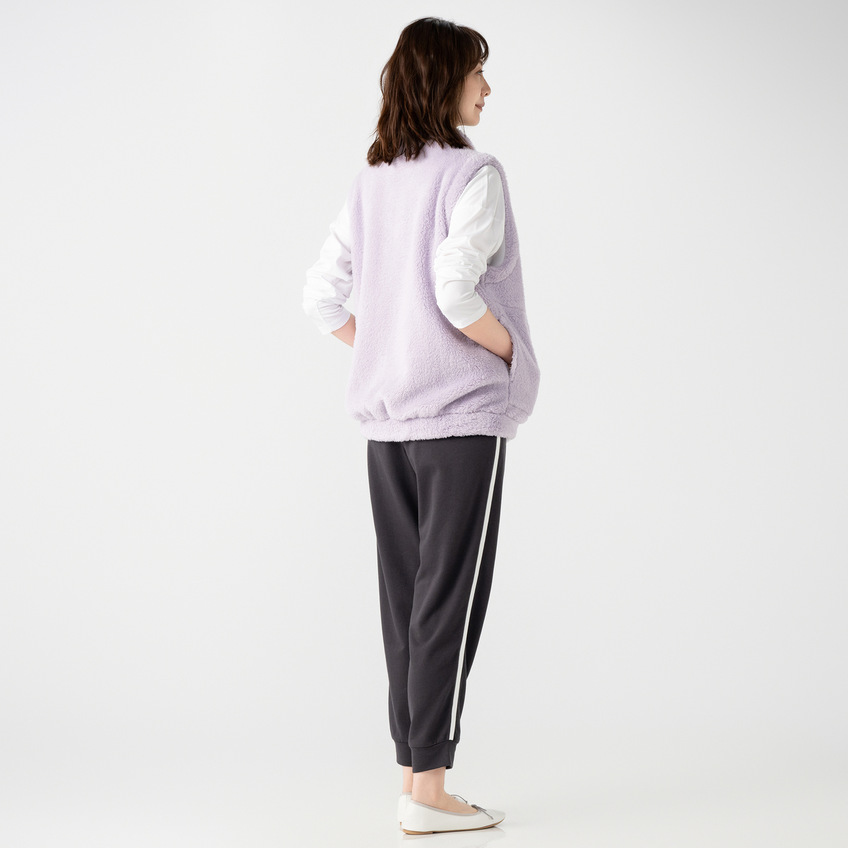 ベストはもこもこのボアフリース素材、パンツは肌側がループ状のミニ裏毛素材を使用。首元をあたためるスタンドネックや、動きやすい広めのアームホールなど細部にもこだわりました