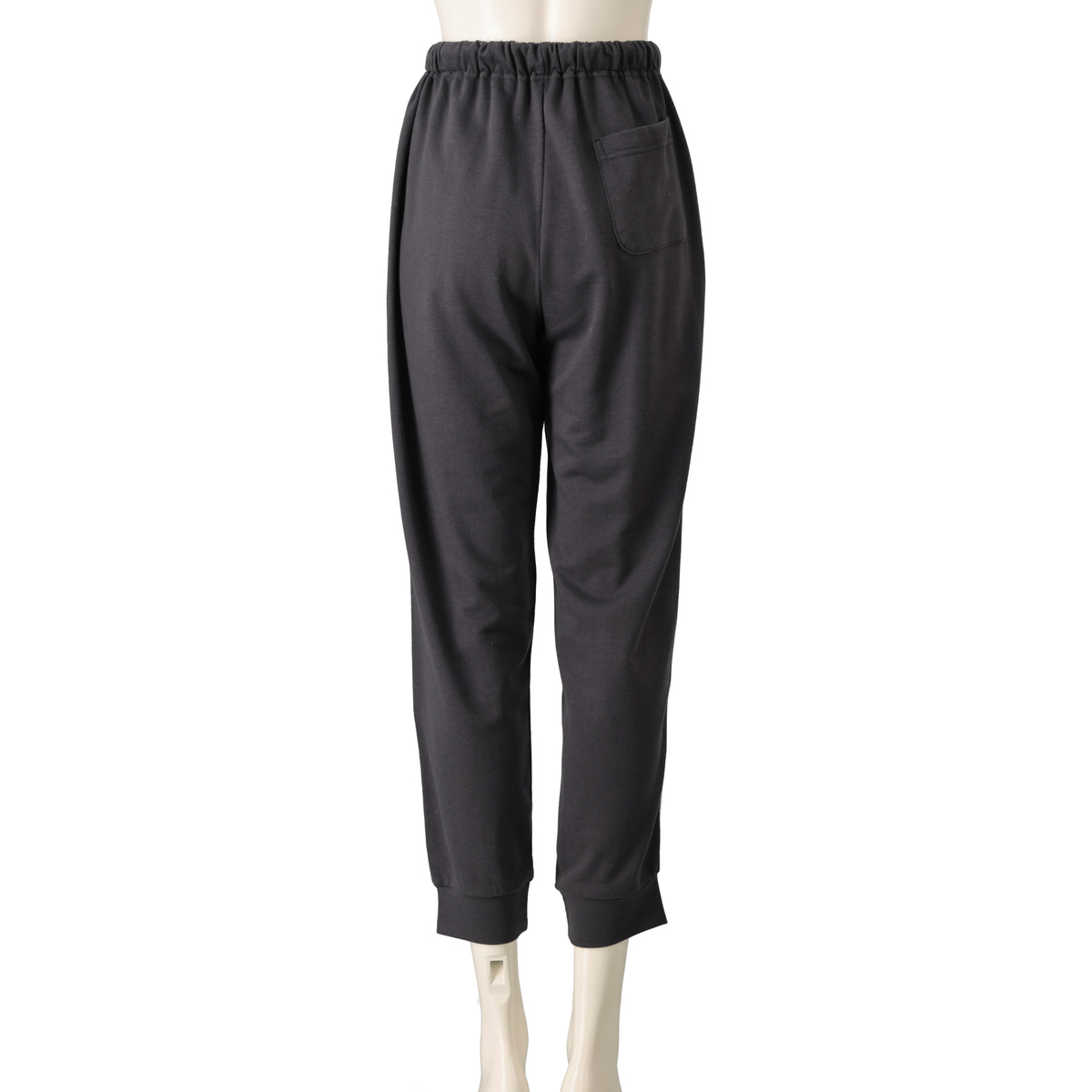 パンツのウエストは総ゴムで締め付け感を軽減し、内側にはゴム取替え口と調節可能なスピンドル紐付き。裾絞りで風を通しにくく、サイドの配色テープがアクセントになります