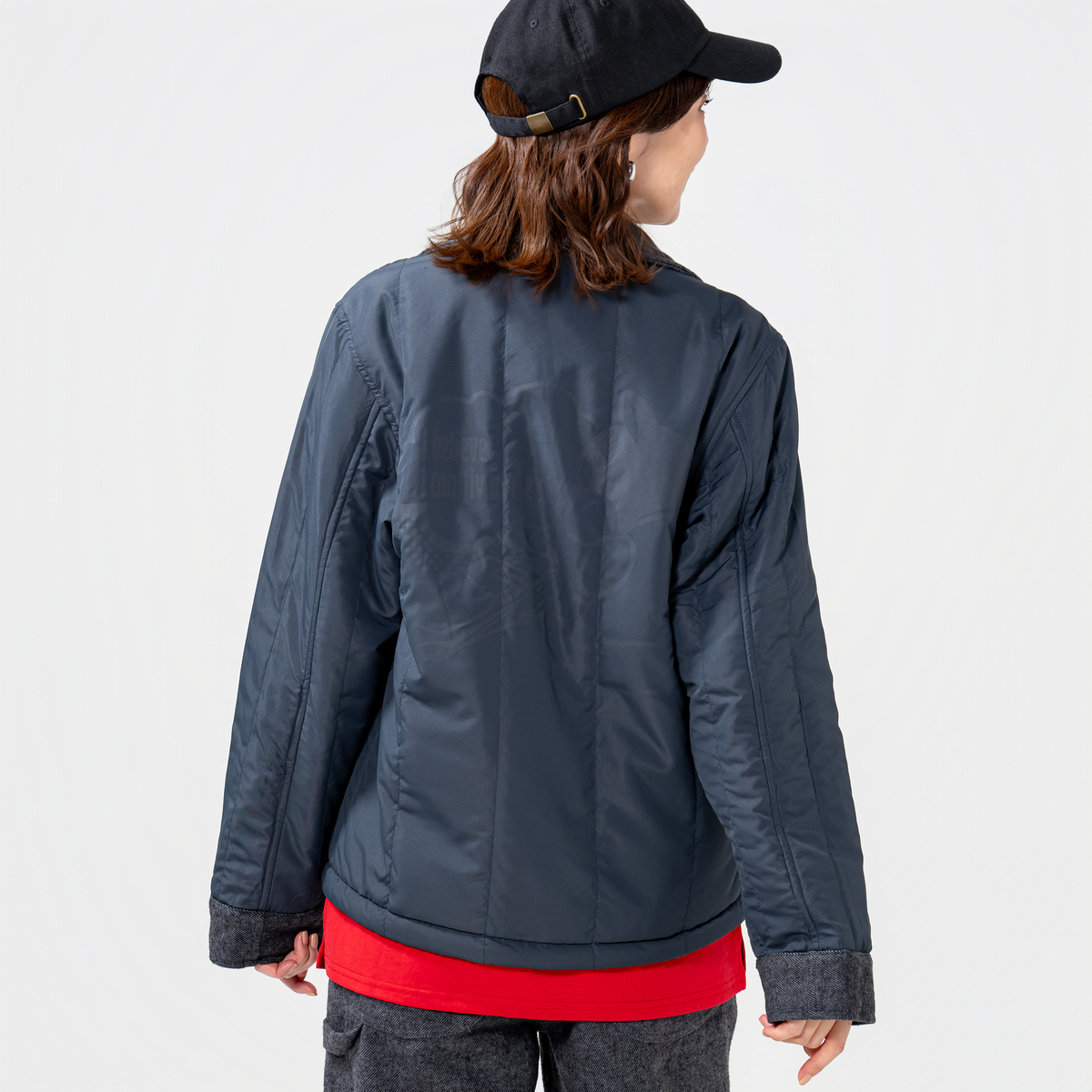 裏側はセミマットのポリエステル布帛素材と、機能性中綿のカポックをキルティング加工しました。カポック中綿は汗や湿気を吸収し、熱を作り出すことで快適なあたたかさを実現。裏側には撥水機能のあるキルティング生地を使用し、日常のさまざまなシーンで活躍します