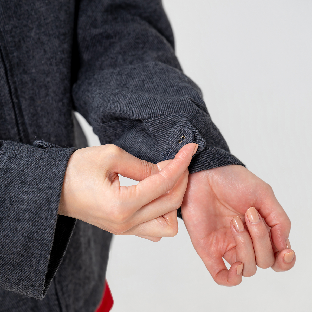 袖口は調節可能なタブ付きボタンでシルエットを変えることも可能。表側ポケットのさりげないワンポイント刺繍や、裏側の背中にはうっすら見えるホット君モチーフの大きな同色系プリントなど、細部に遊び心を感じていただけます