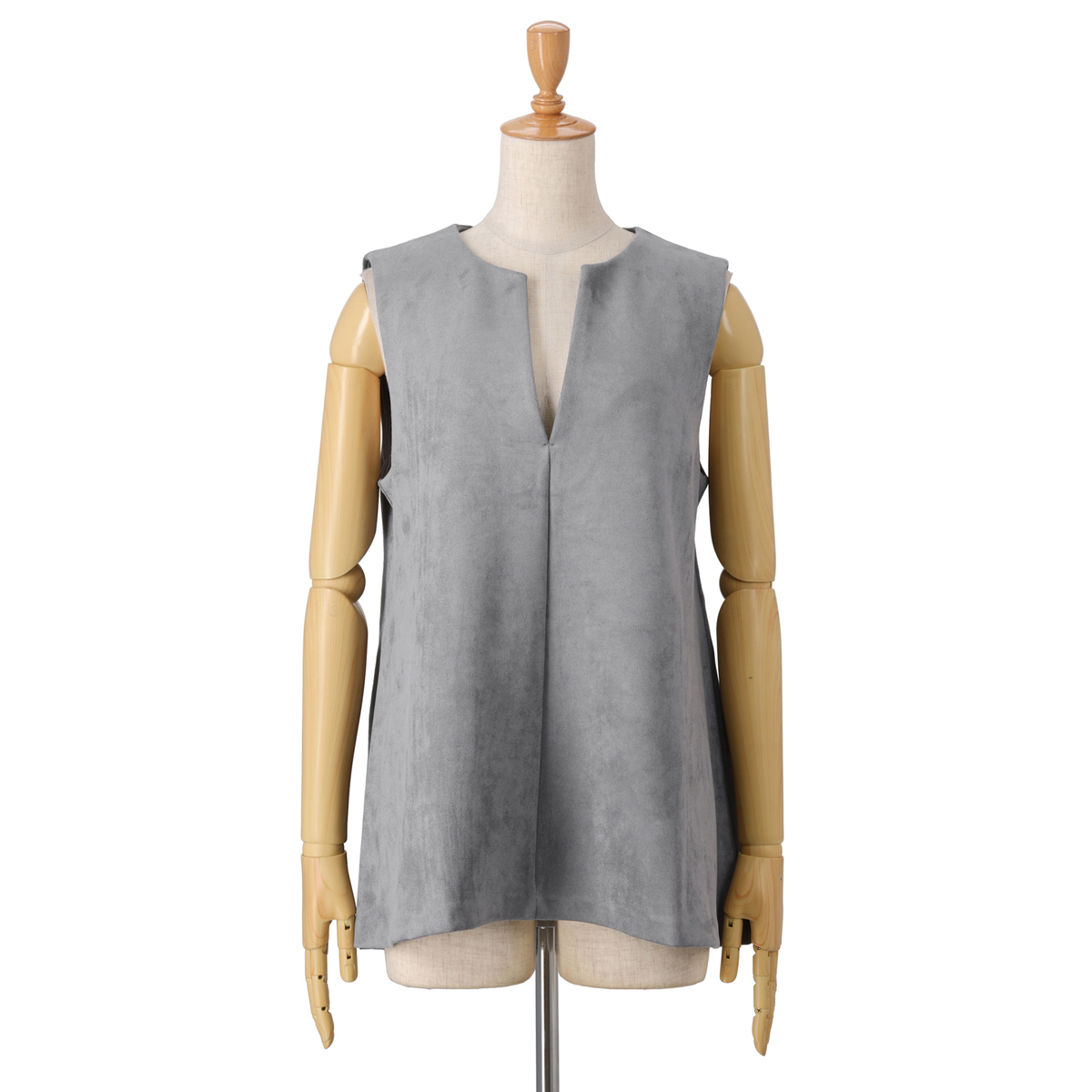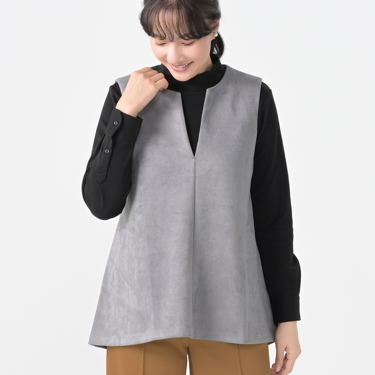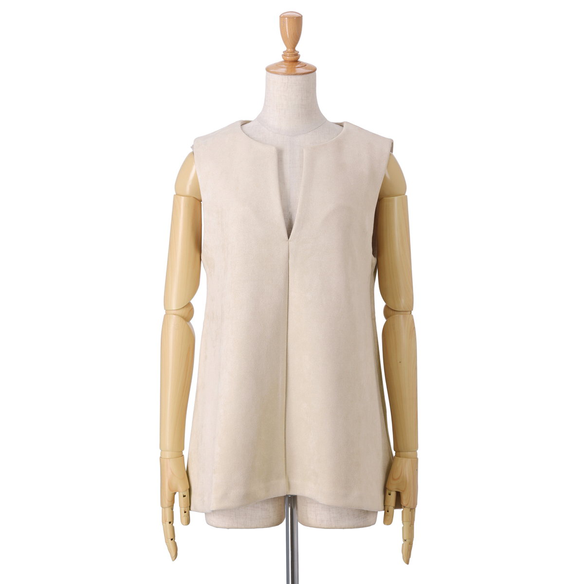 深いVネックのAラインのジレスタイル。ボトムスとの相性が良いデザインです。インナーにカットソーやセーターを合わせれば、ロングシーズン重宝するデザインです
