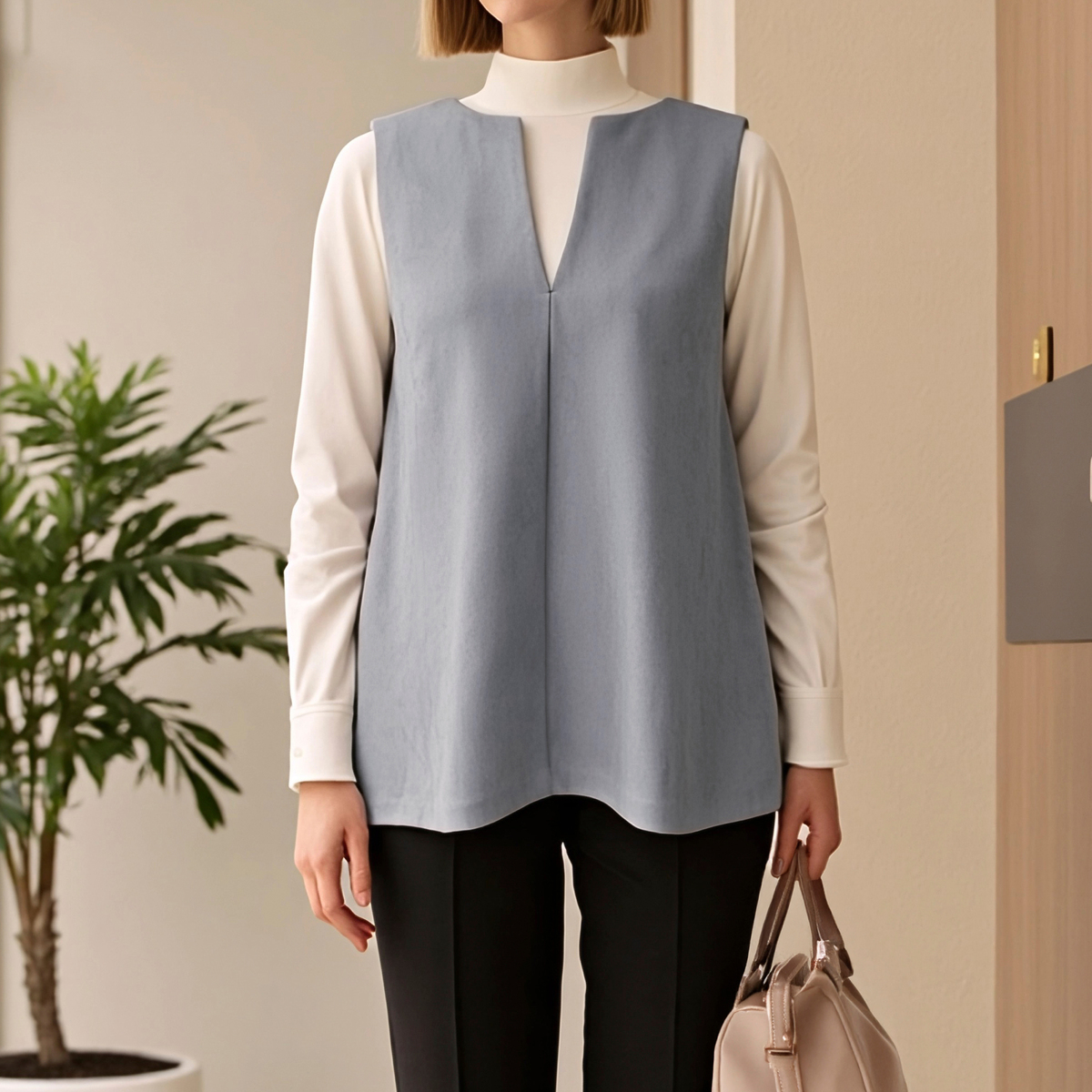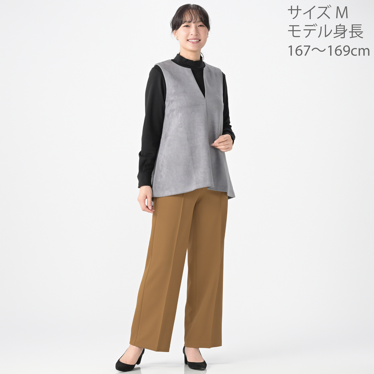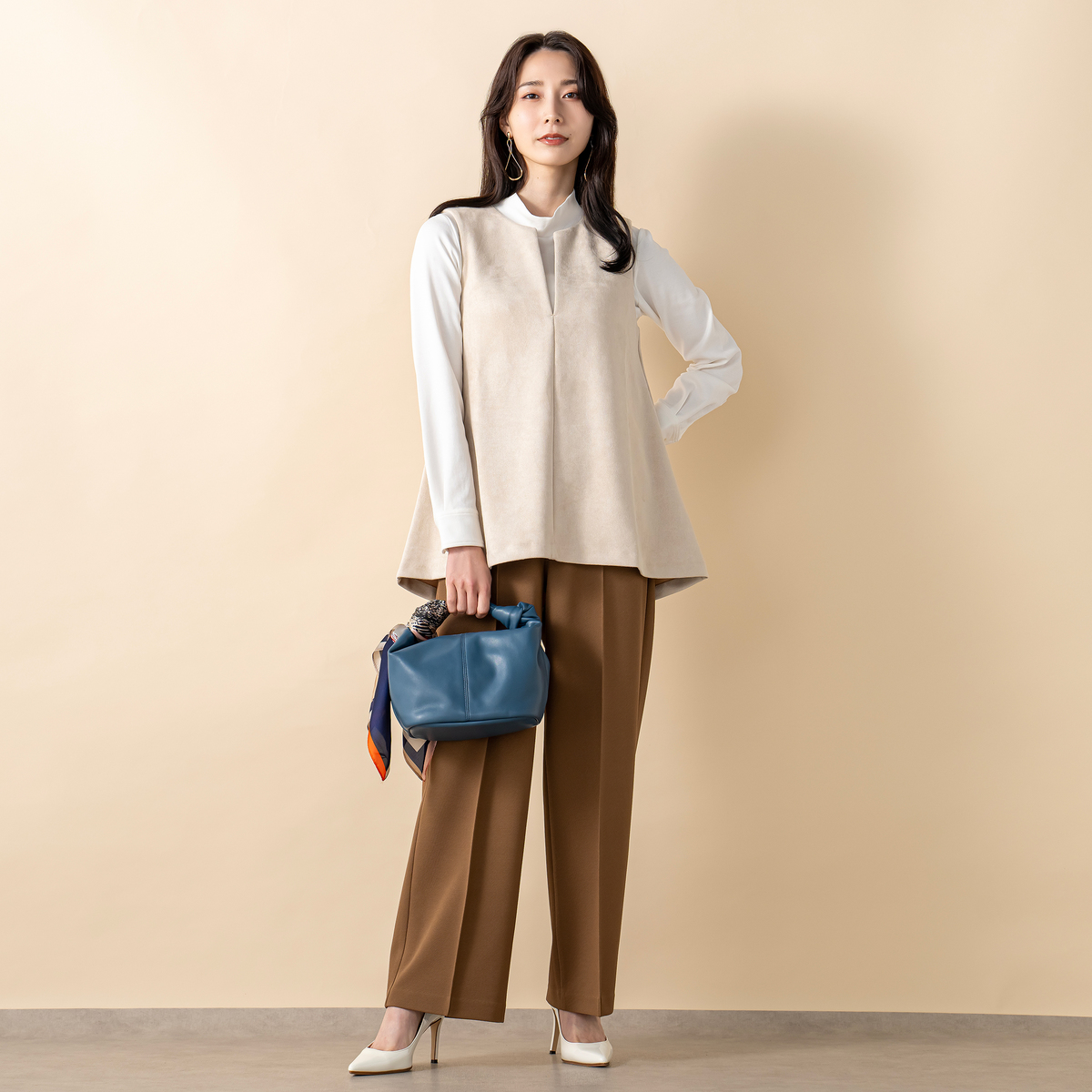 深いVネックのAラインのジレスタイル。ボトムスとの相性が良いデザインです。インナーにカットソーやセーターを合わせれば、ロングシーズン重宝するデザインです