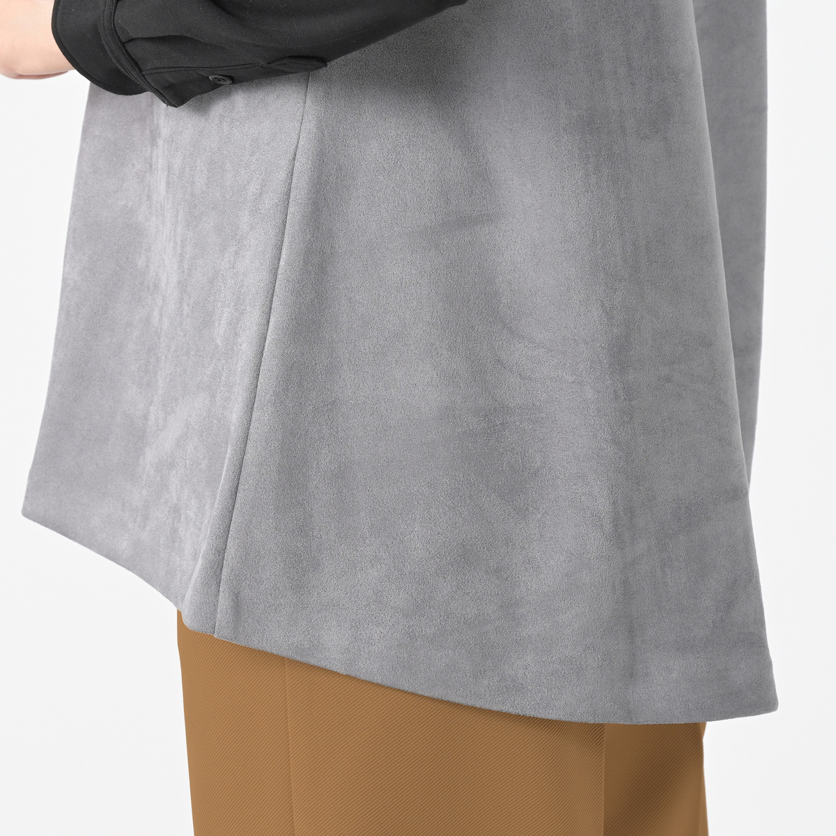 ヌバック調のダンボールニット素材を使用。きれいなAラインシルエット。首元には深めのスリットを入れて、おしゃれ度がアップするデザインに仕上げました