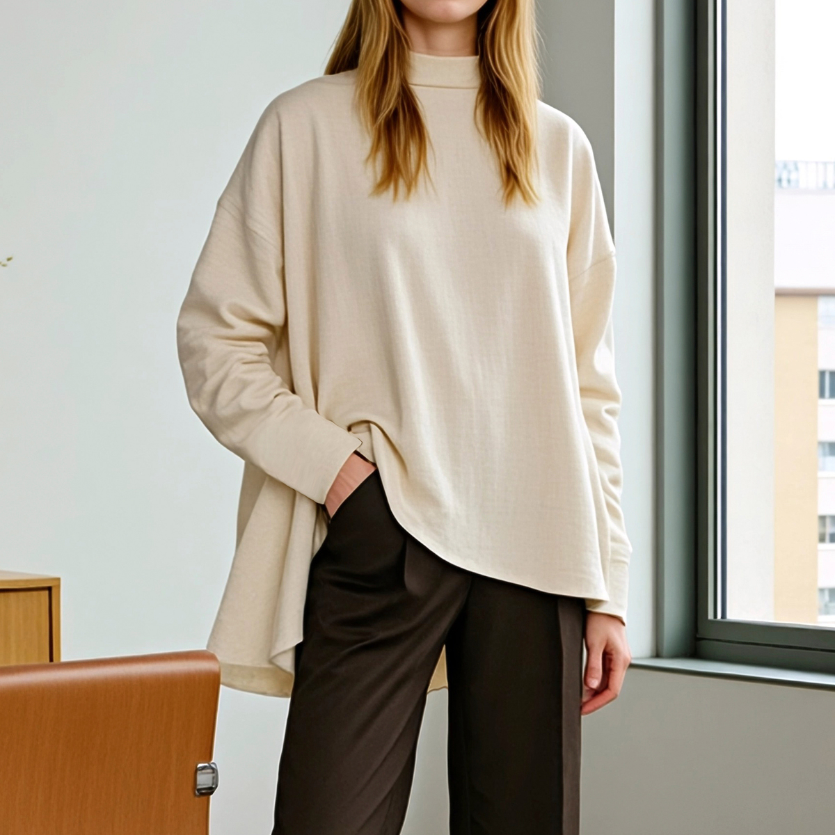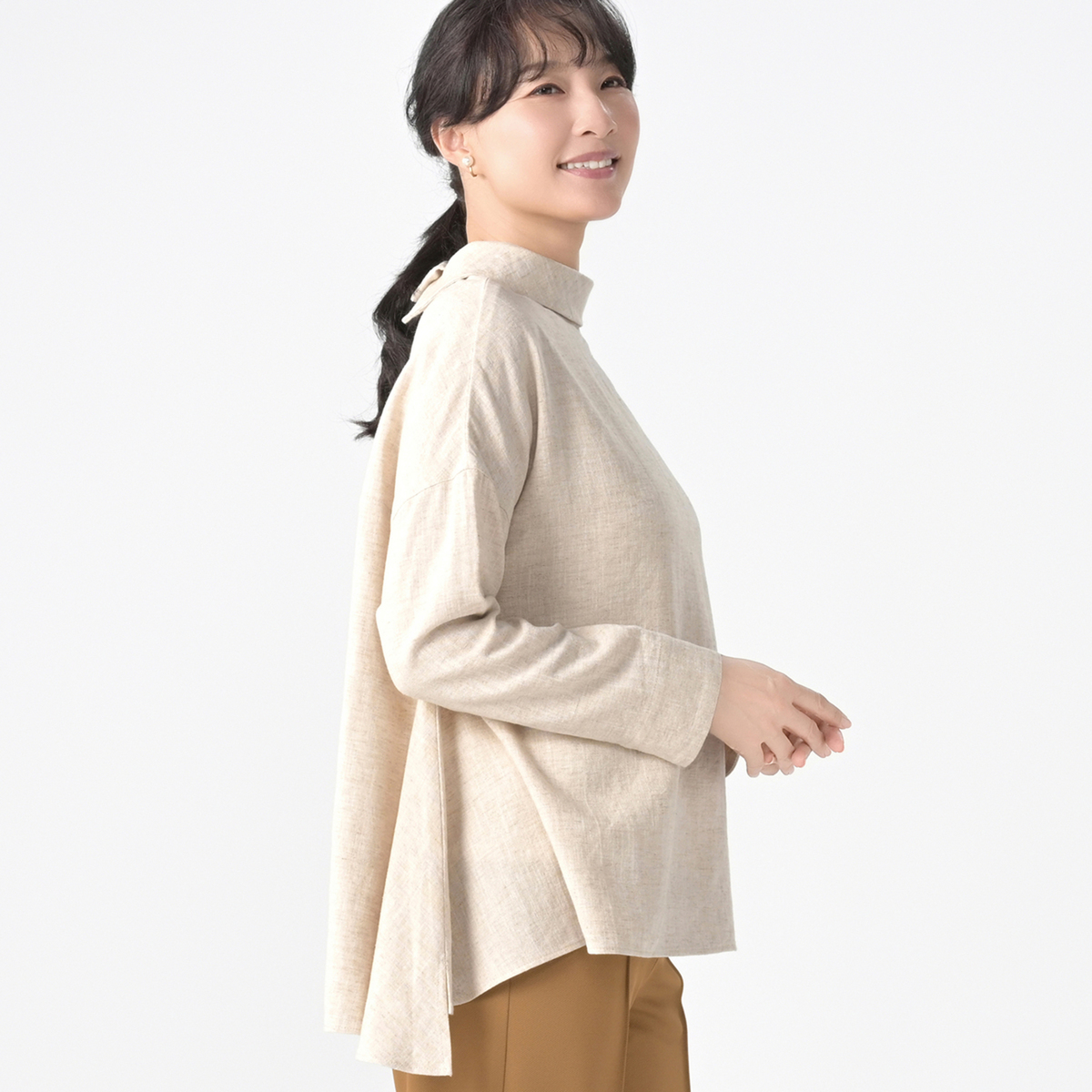 ドロップショルダーのリラックスシルエットに、ロールネックと前途中開きを前後で楽しめる2wayデザイン。前後差をつけた裾や両サイド・袖口のスリットが動きにニュアンスを加え、さりげないアクセントになっています