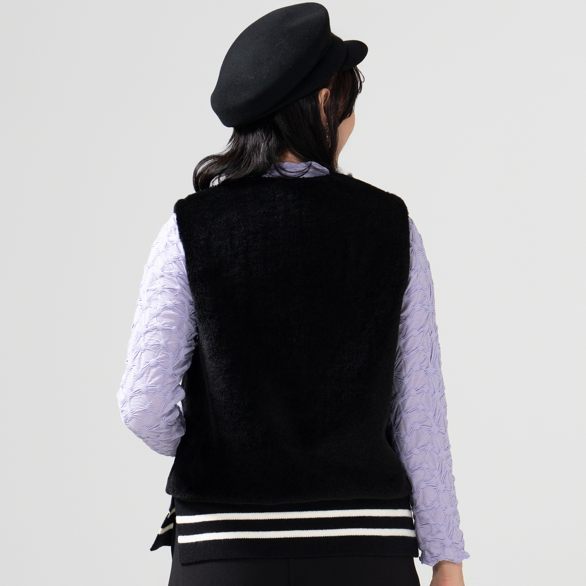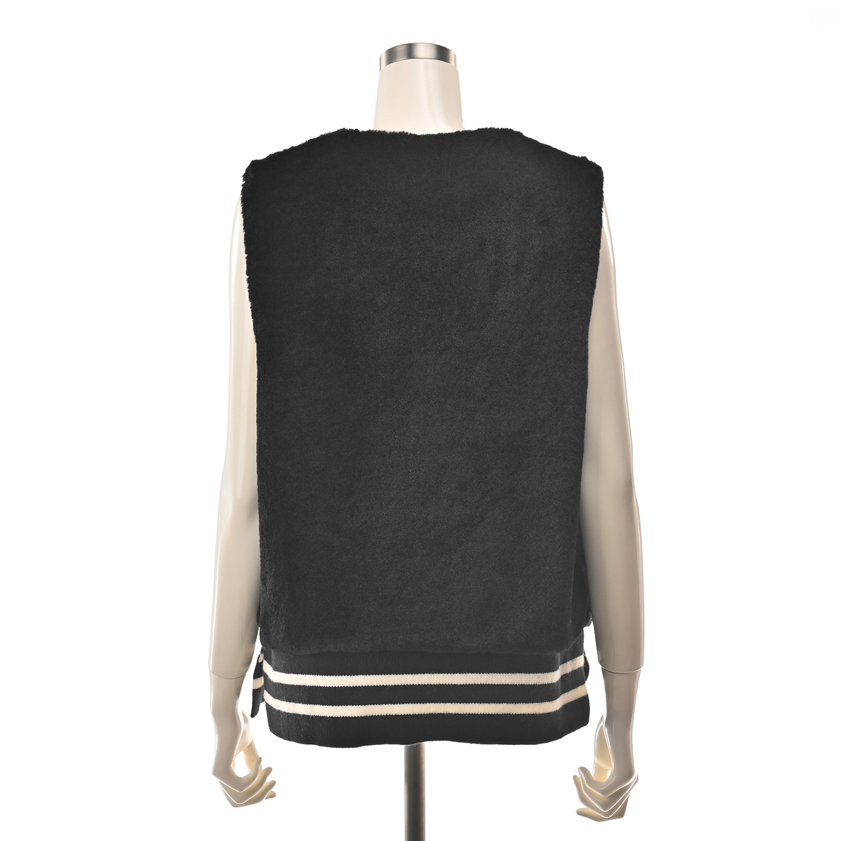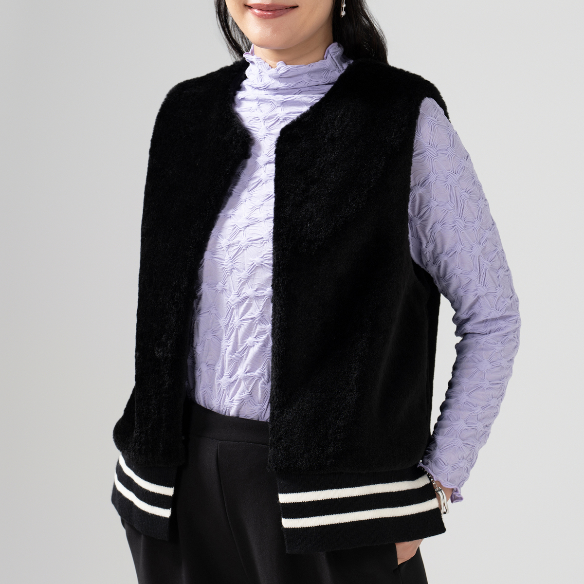 裾にライン入りリブを配したフェイクファーベスト。リブの両脇はスリット開きで、動きやすさと軽やかさを両立しています。アームホールを広めにとり、窮屈さを感じにくい着心地に仕上げました