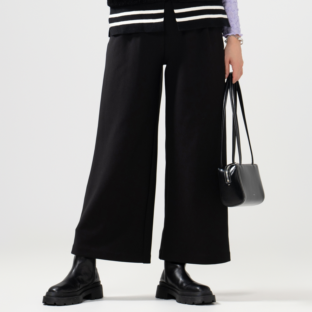 裏起毛素材を使用したワイドパンツ。表面はなめらかでストレッチ性のあるジョーゼットで、暖かな穿き心地ときれい見えを両立しました