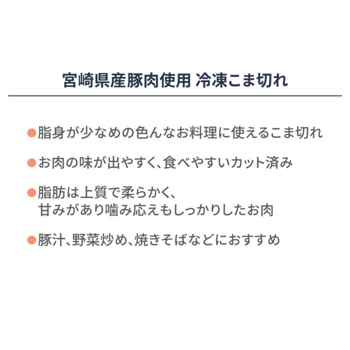 児湯郡木城町や川南町の静かな環境で育てた豚肉を使った冷凍こま切れ。こだわりの餌を使用することで、お肉の甘みを感じていただけます