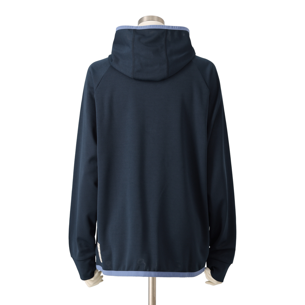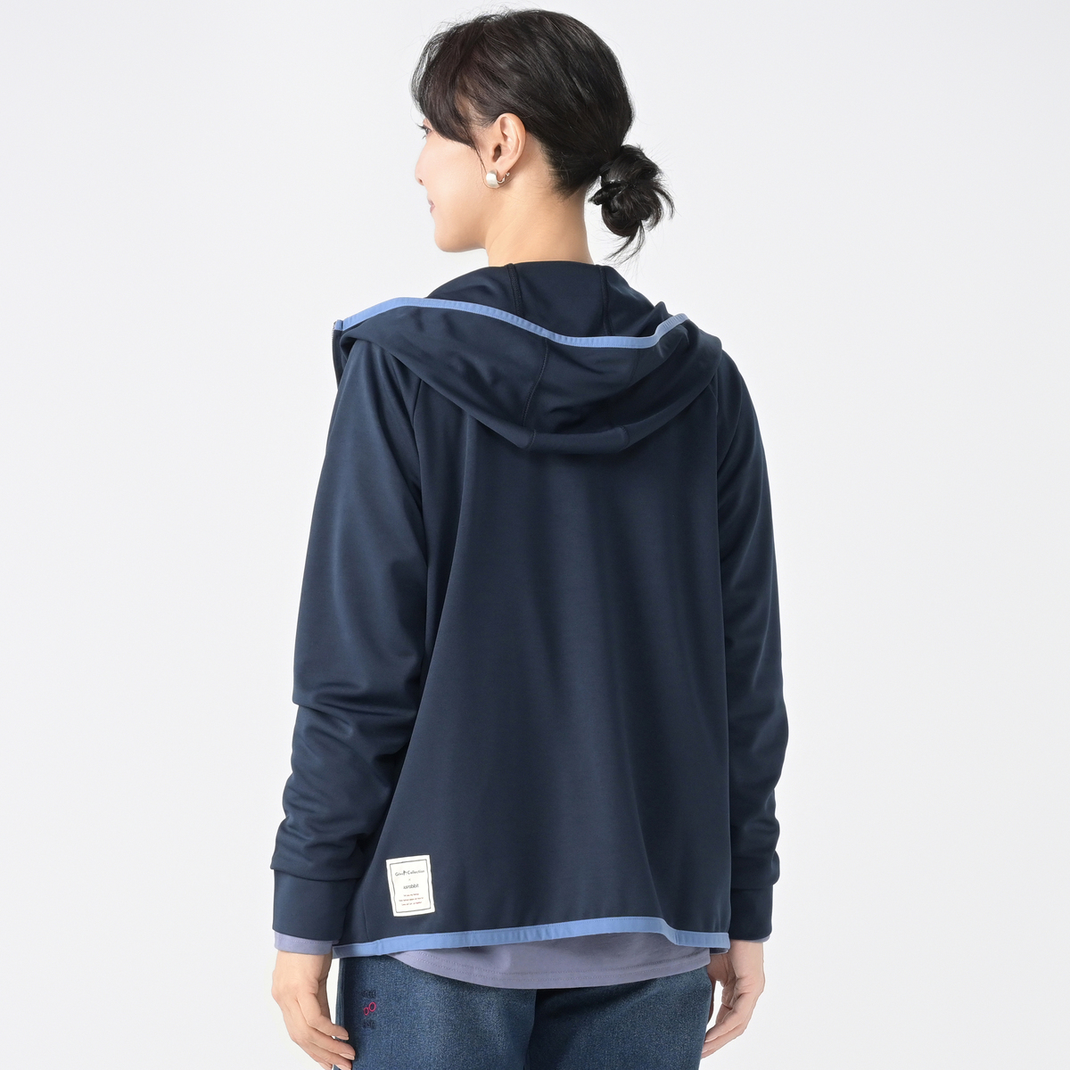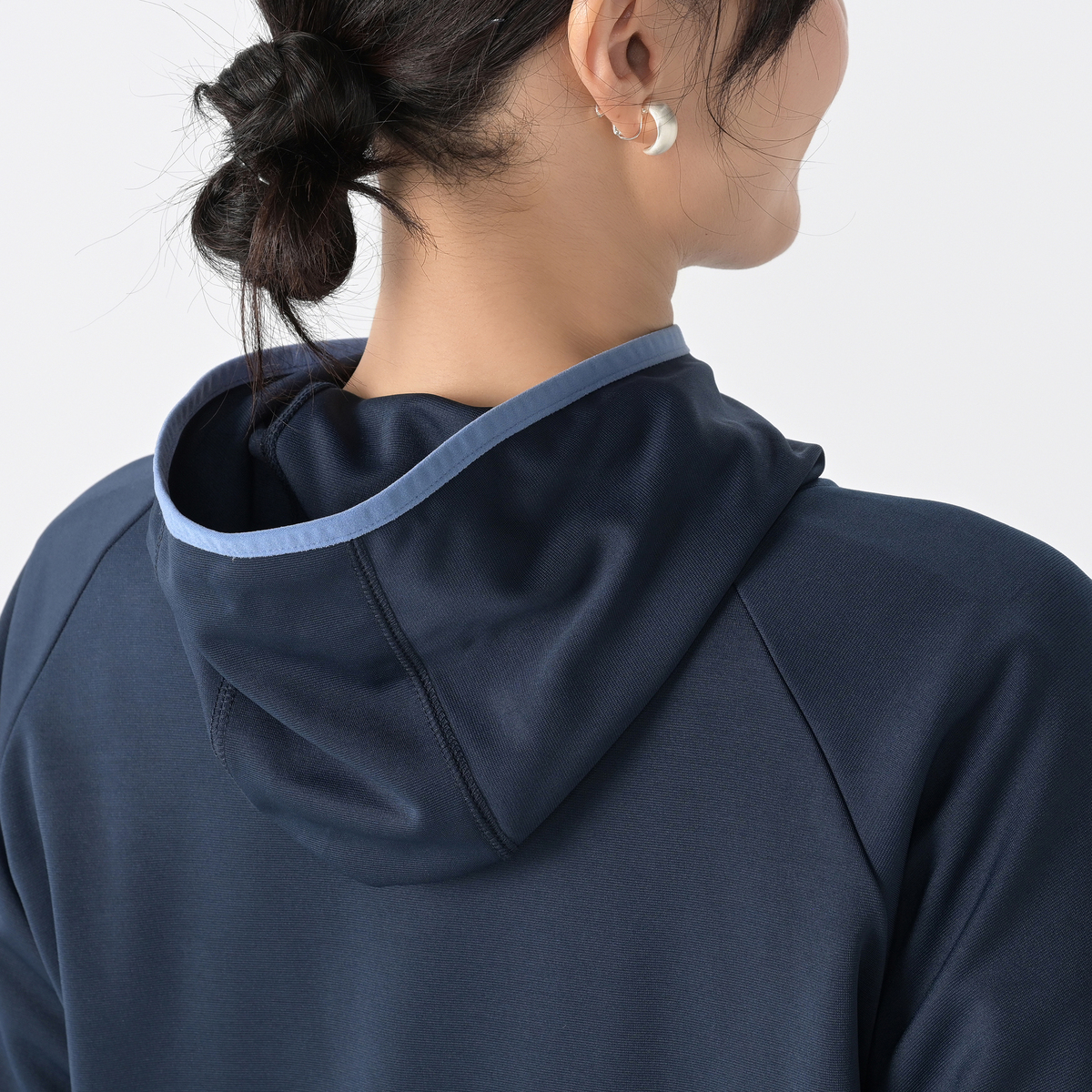 スタイリッシュなアクティブジップパーカー。リブのないヘムラインには同系色でほんのり配色のニットバインダーテープを施し、アクセントにしました。立体的なフードやムシ隠しファスナーのディテールが、日常に程よい個性を添えます