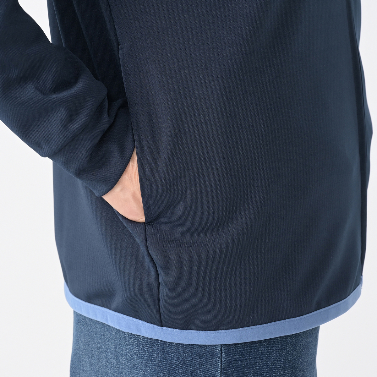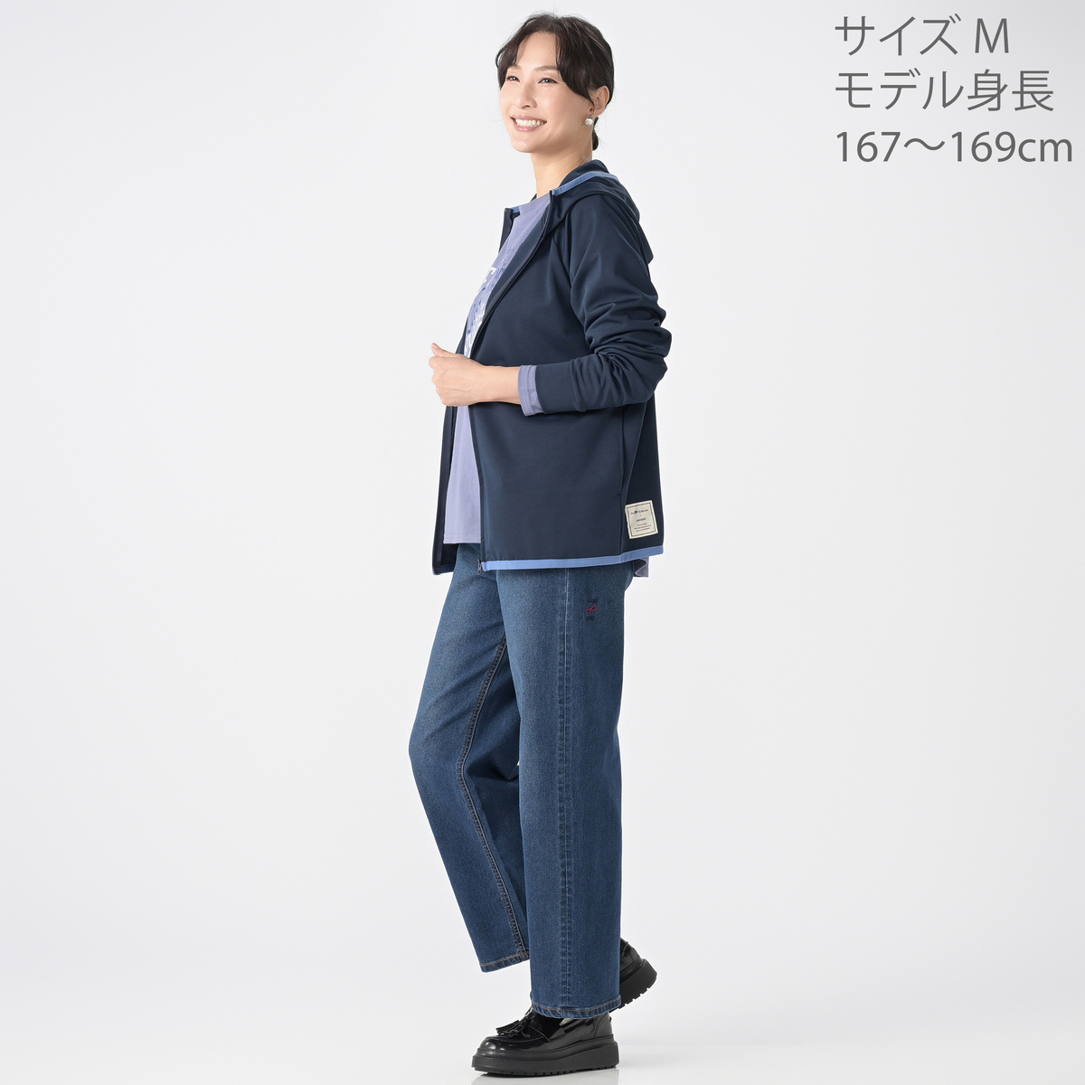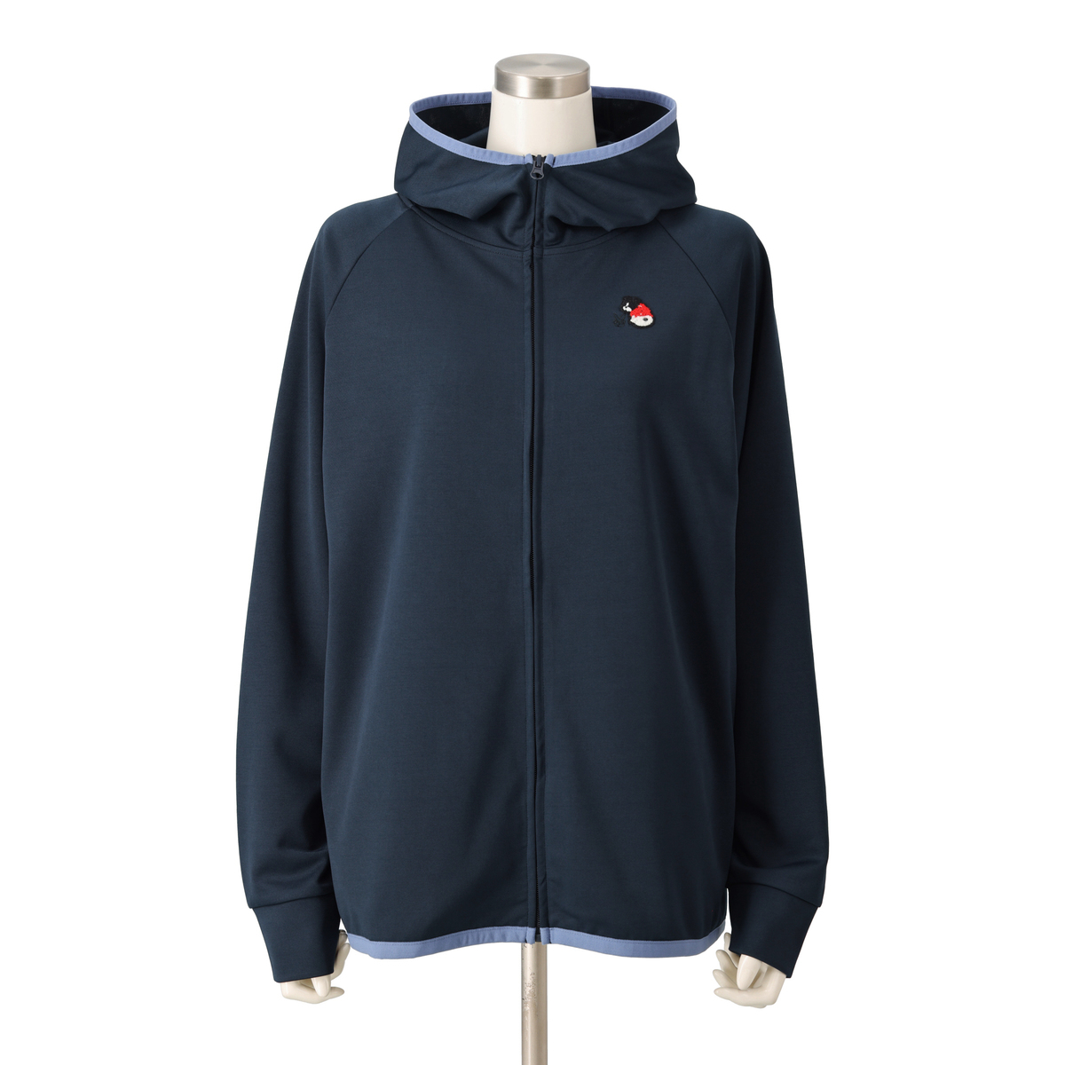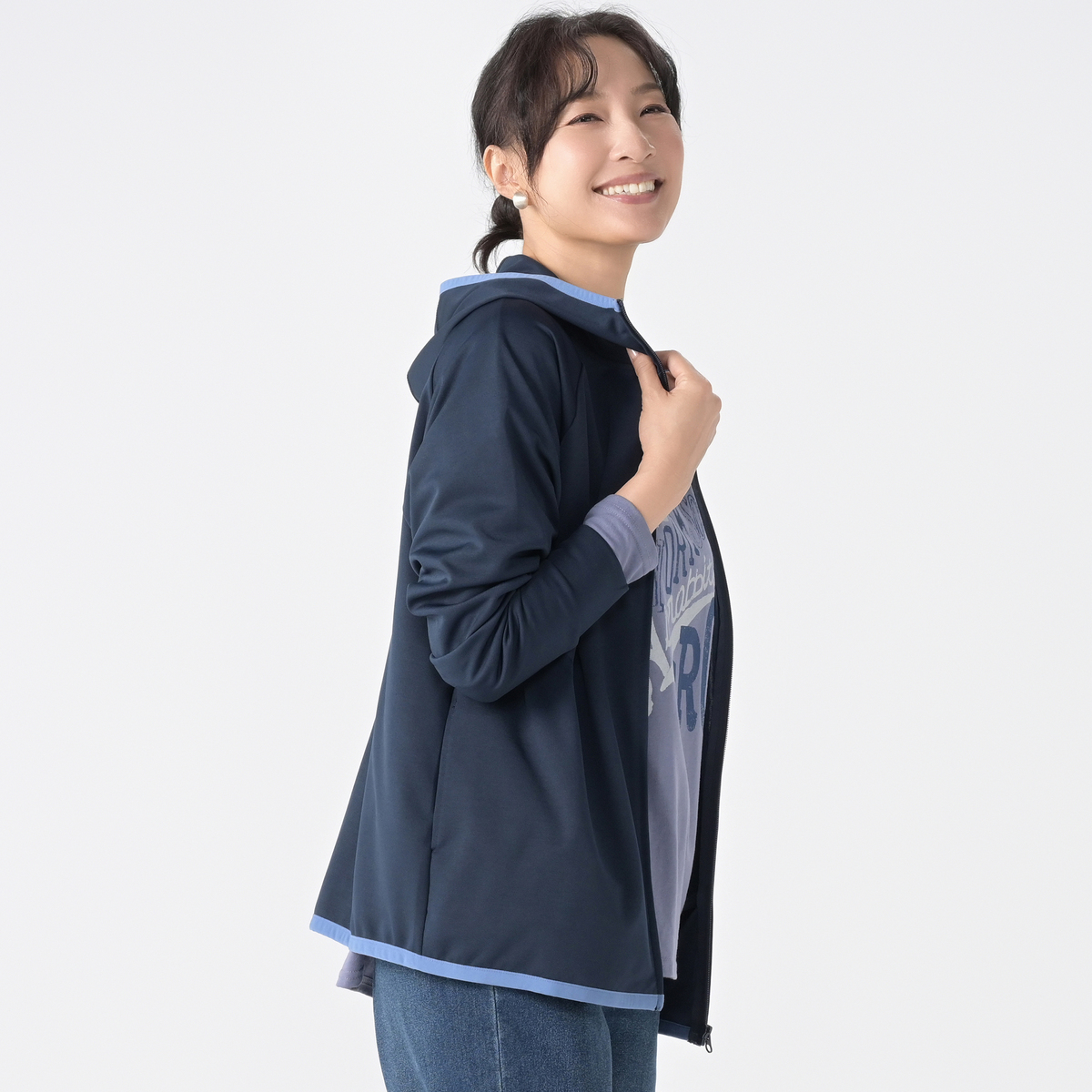 スタイリッシュなアクティブジップパーカー。リブのないヘムラインには同系色でほんのり配色のニットバインダーテープを施し、アクセントにしました。立体的なフードやムシ隠しファスナーのディテールが、日常に程よい個性を添えます