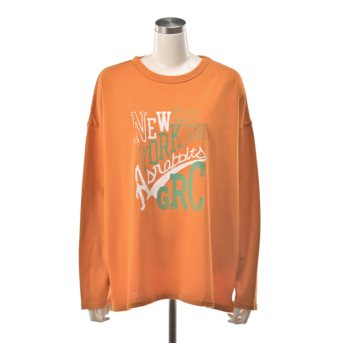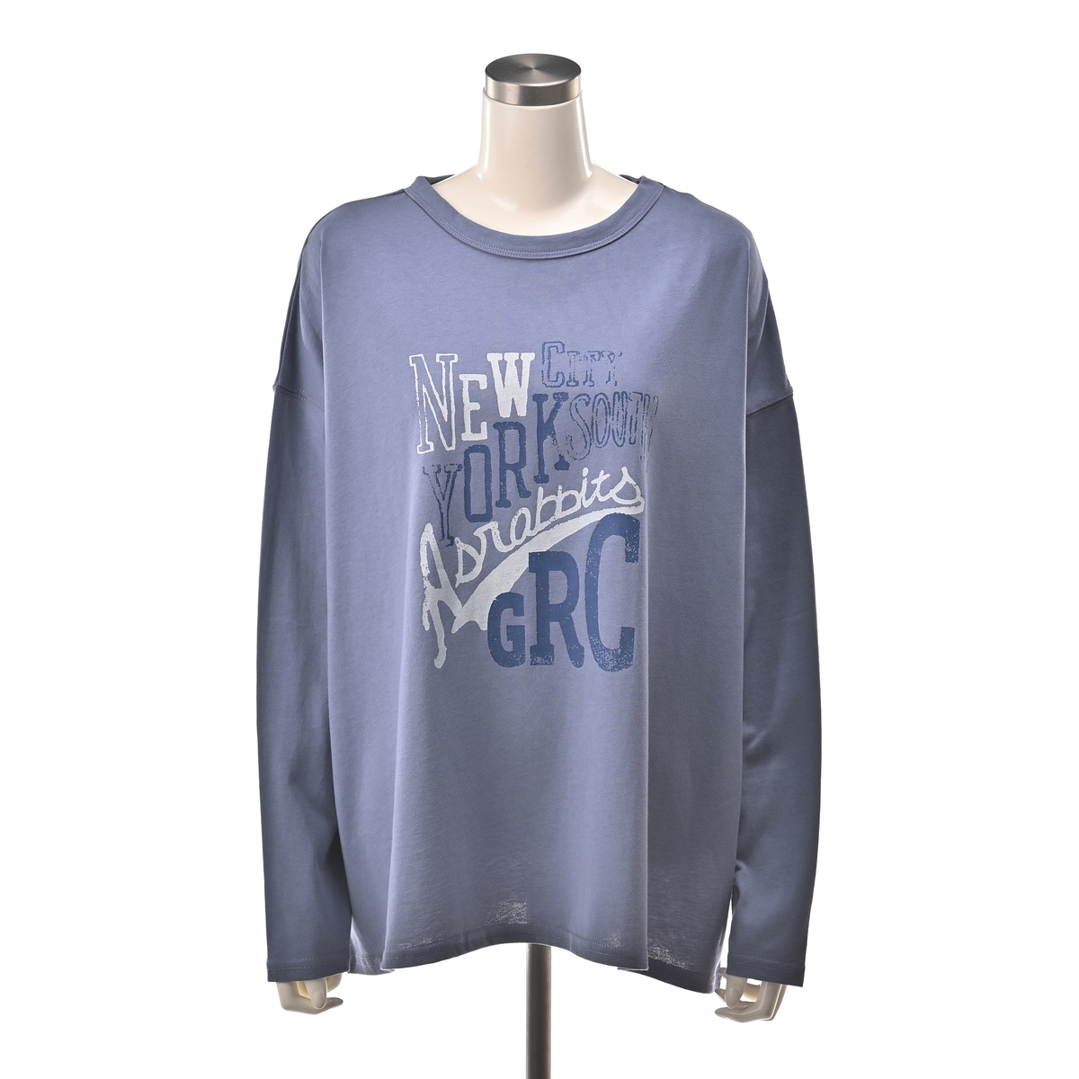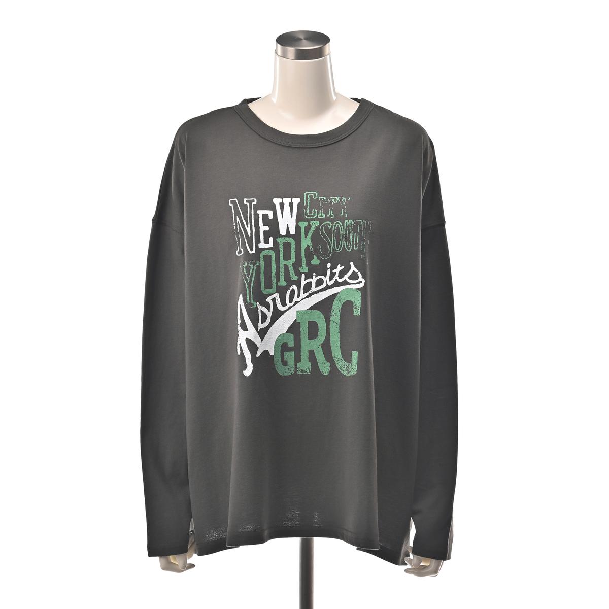 旅をテーマにしたコラボプリントが魅力のロングスリーブTシャツ。ゆったりとしたビッグシルエットで、GRCとAsrabbitのロゴと、ヴィンテージ風にかすれ調でプリントしたNEW YORKロゴが独特の雰囲気を演出します