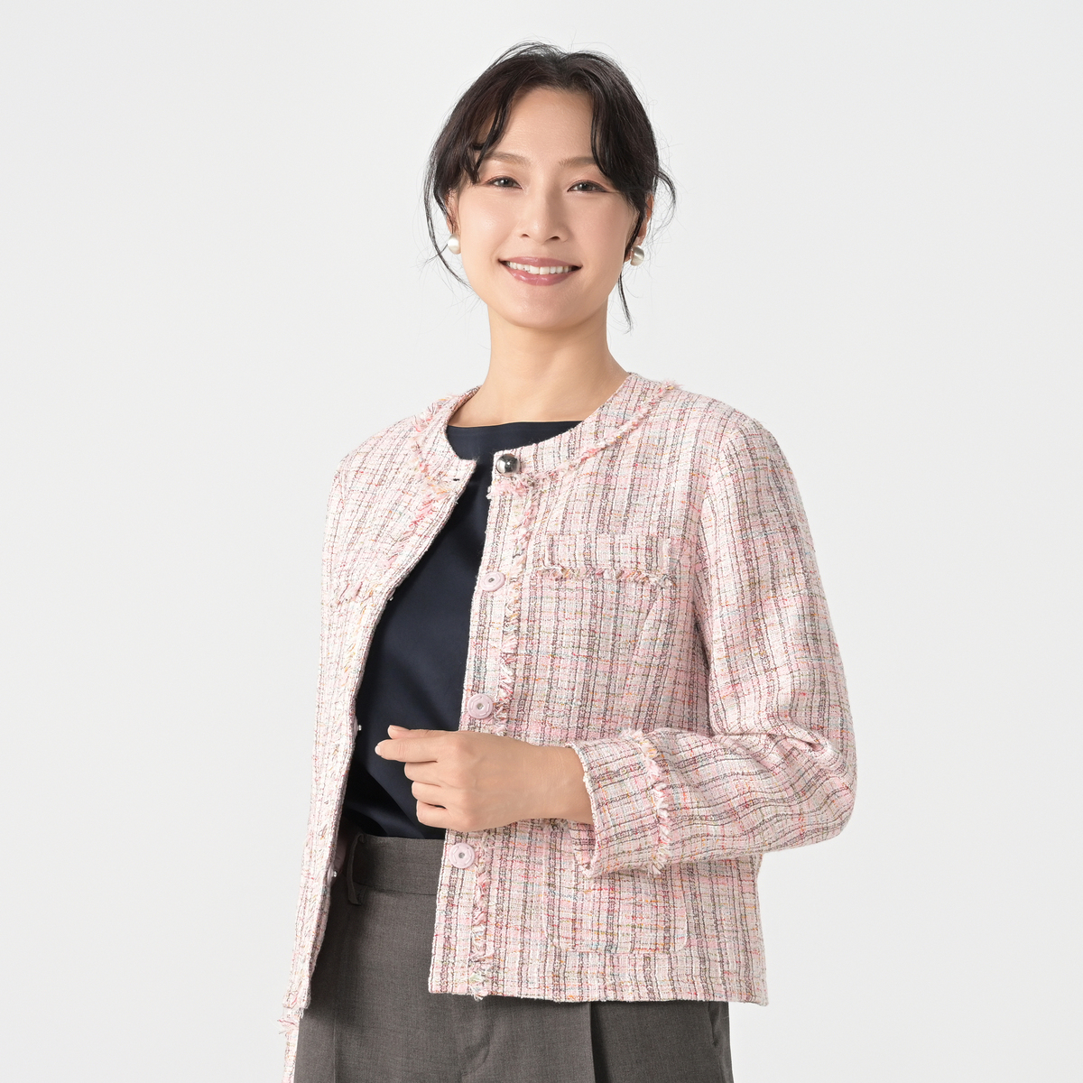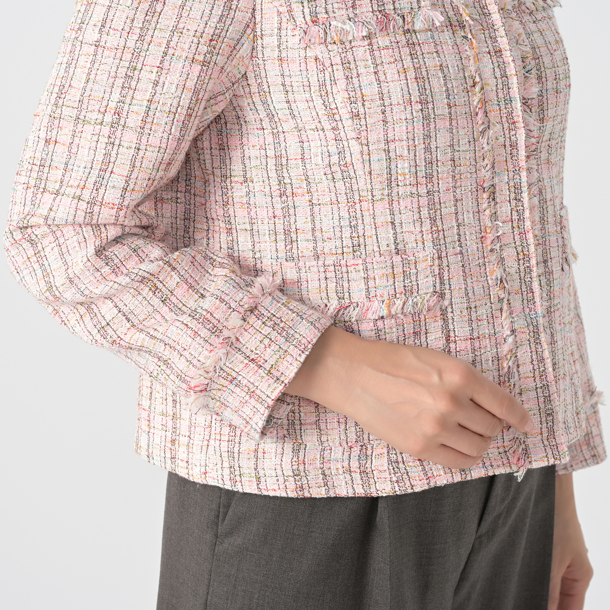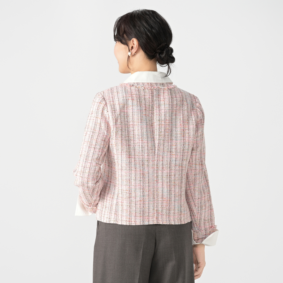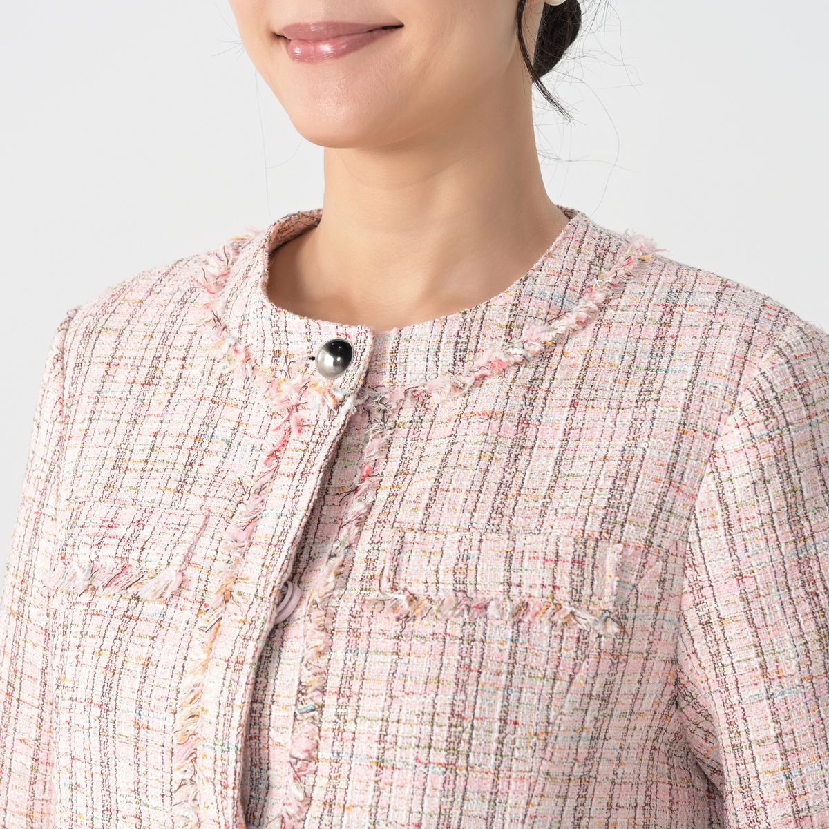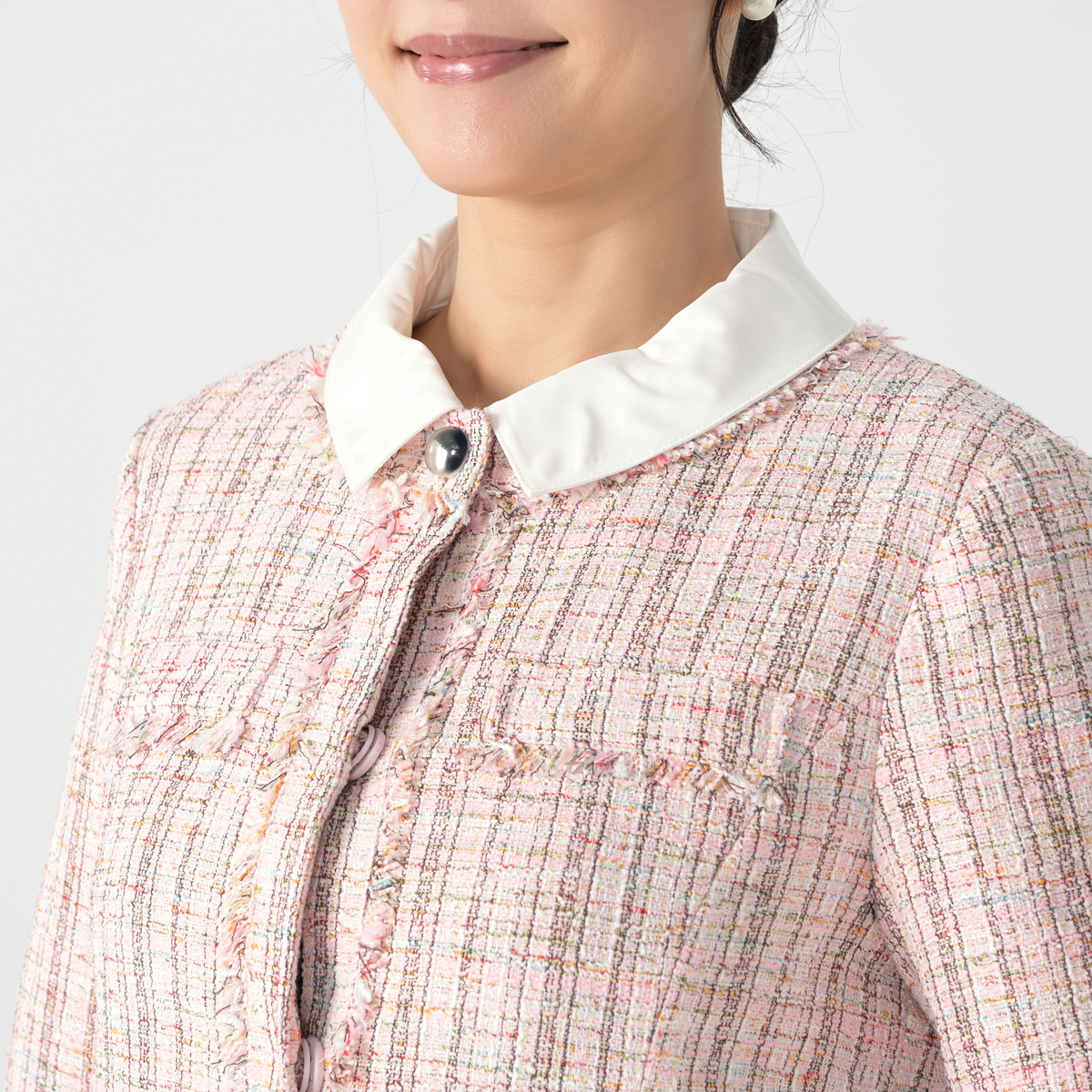 衿とカフスを取り外すことができるツイードジャケット。ノーカラーでフェミニンに、衿を付ければシャープな印象でお召しいただけます