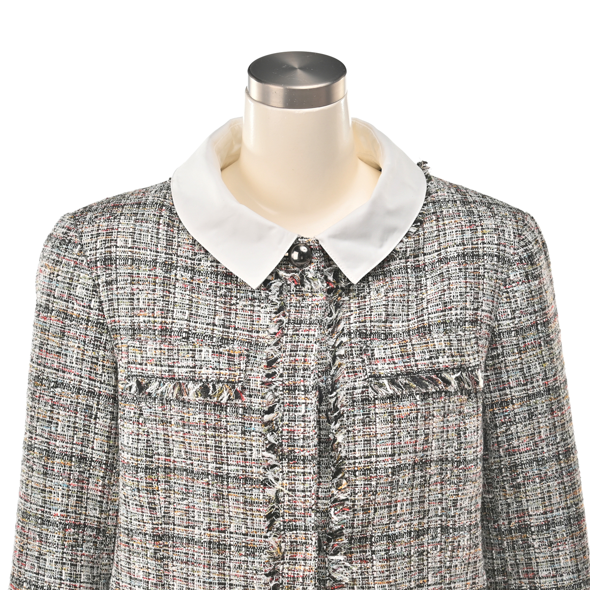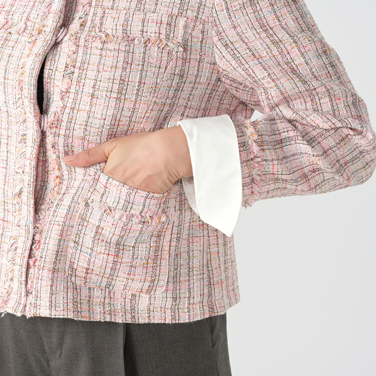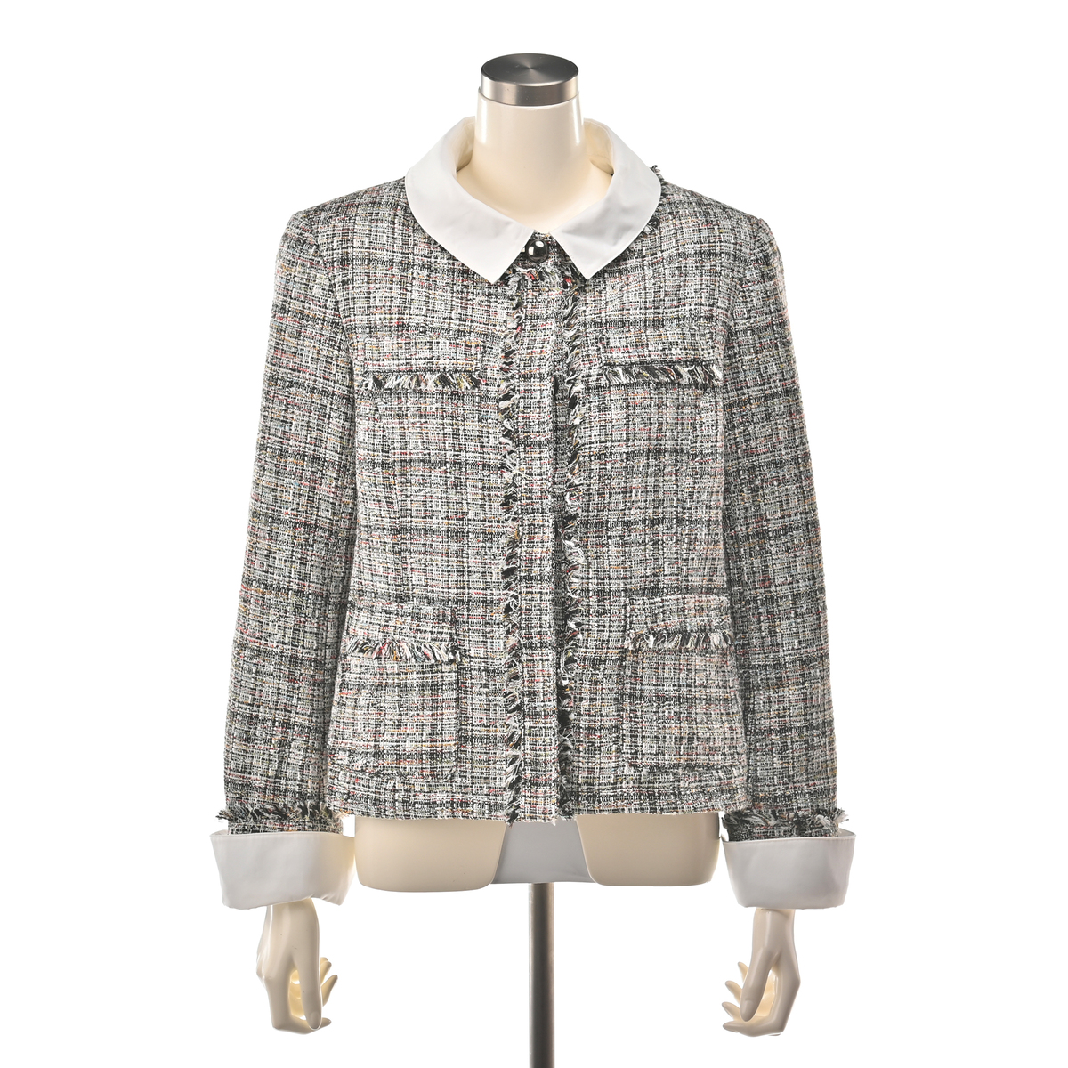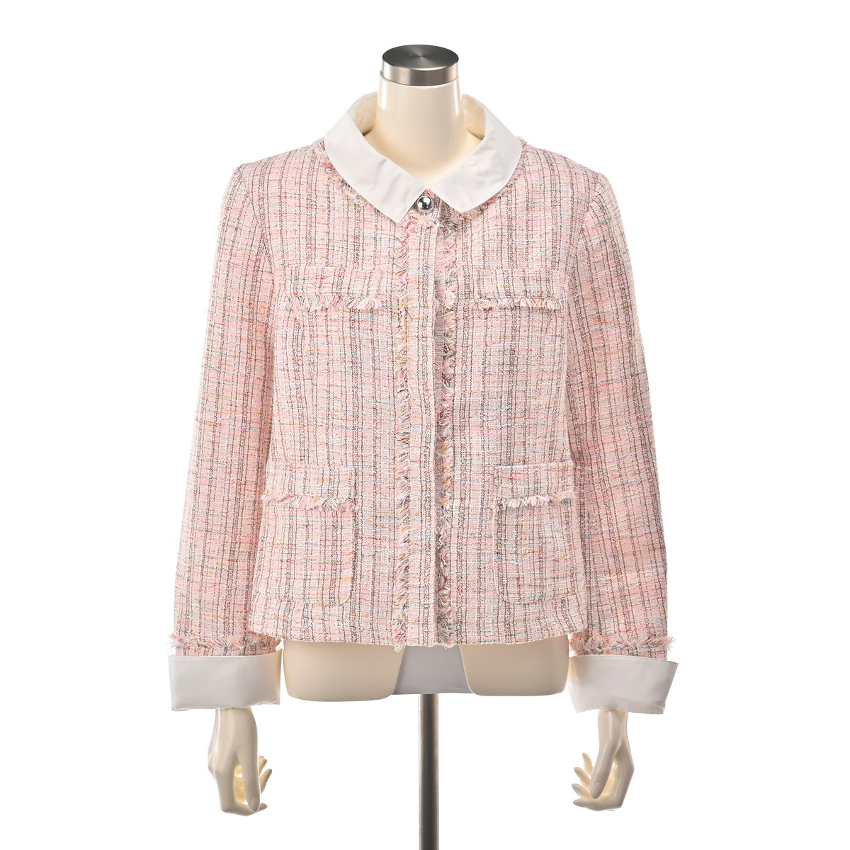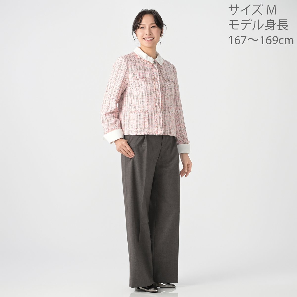 衿とカフスを取り外すことができるツイードジャケット。ノーカラーでフェミニンに、衿を付ければシャープな印象でお召しいただけます
