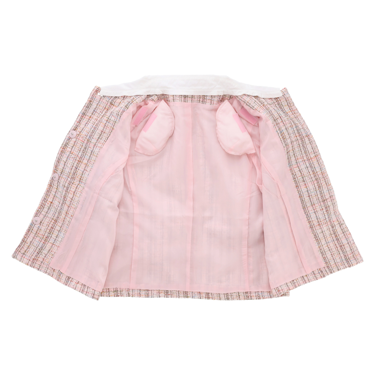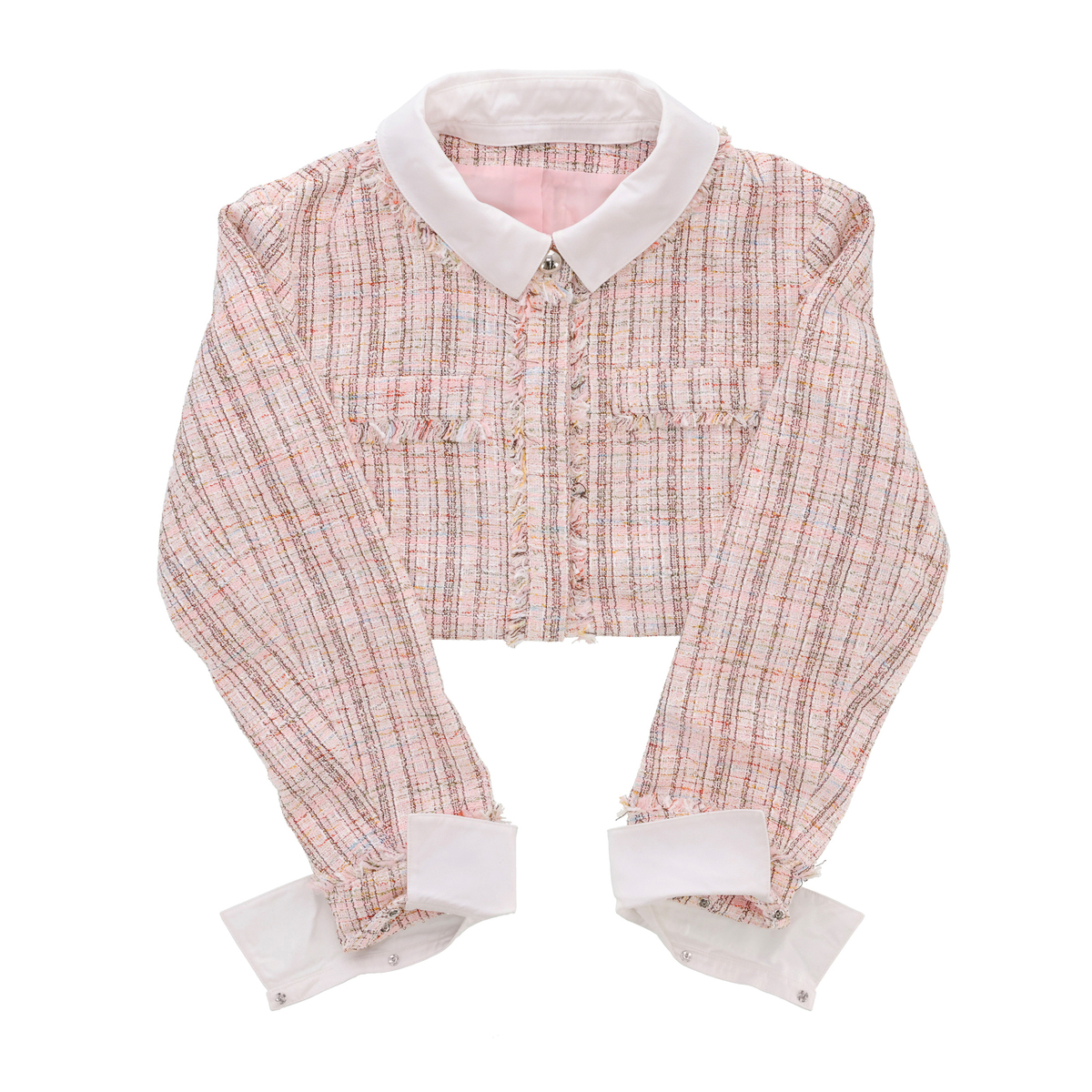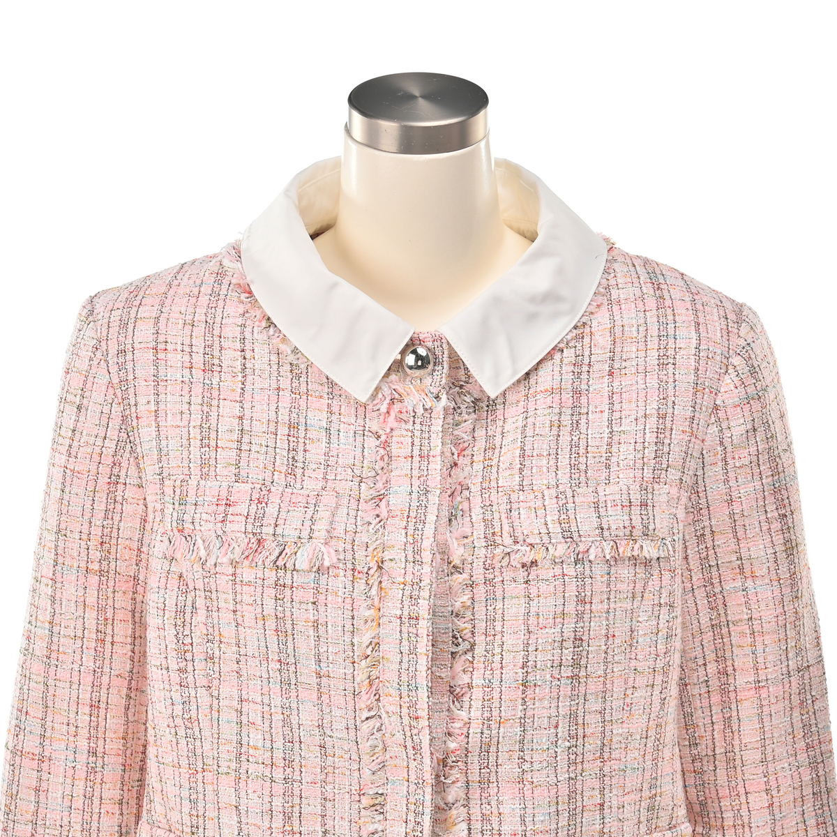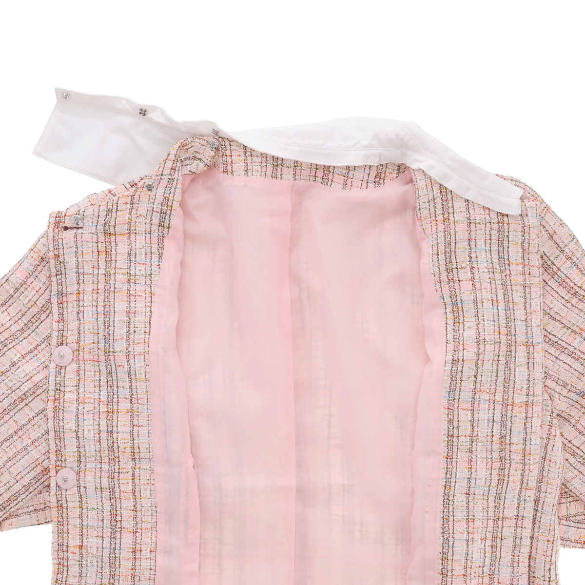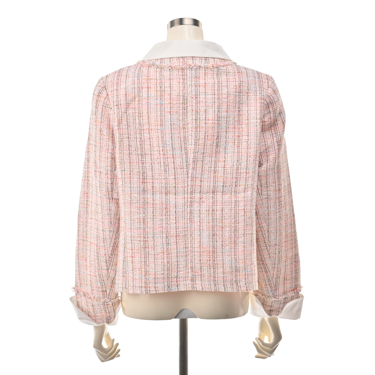 衿とカフスを取り外すことができるツイードジャケット。ノーカラーでフェミニンに、衿を付ければシャープな印象でお召しいただけます