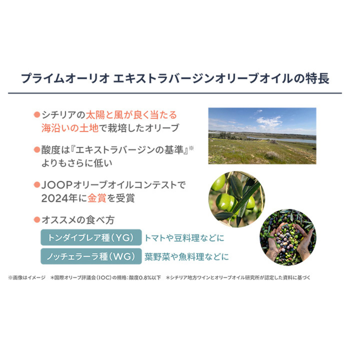 イタリア・シチリア島で育ったオリーブを使ったエキストラバージンオリーブオイルです。原産地証明(IGP)も取得しています。ノッチェラーラ・デルベリーチェ種を使用しているため、程よく強いフルーティさと、若草や青いフレッシュな香りが楽しめ、和洋問わずに様々な料理にピッタリです