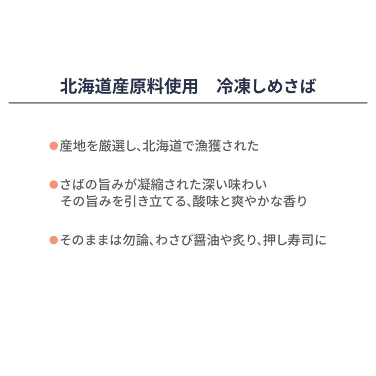 北海道で漁獲された鯖をしめさばにしました。冷蔵庫内で解凍してお召し上がりください。お刺身にする場合、しめさばを薄めに切り、そのまま、または、わさびしょうゆでお召し上がりください