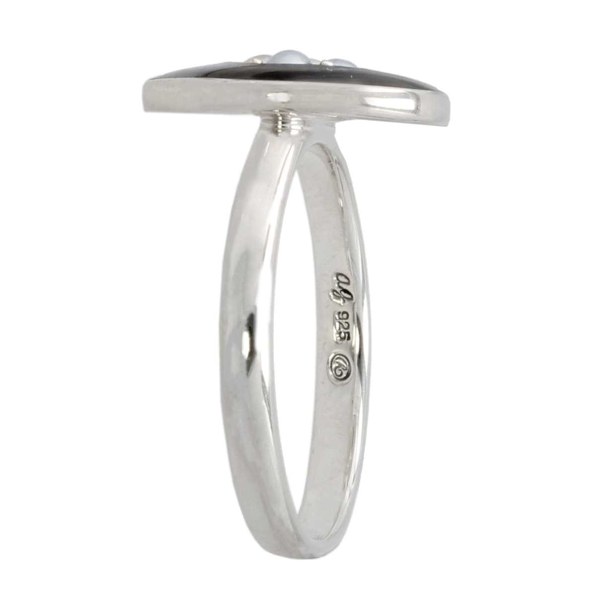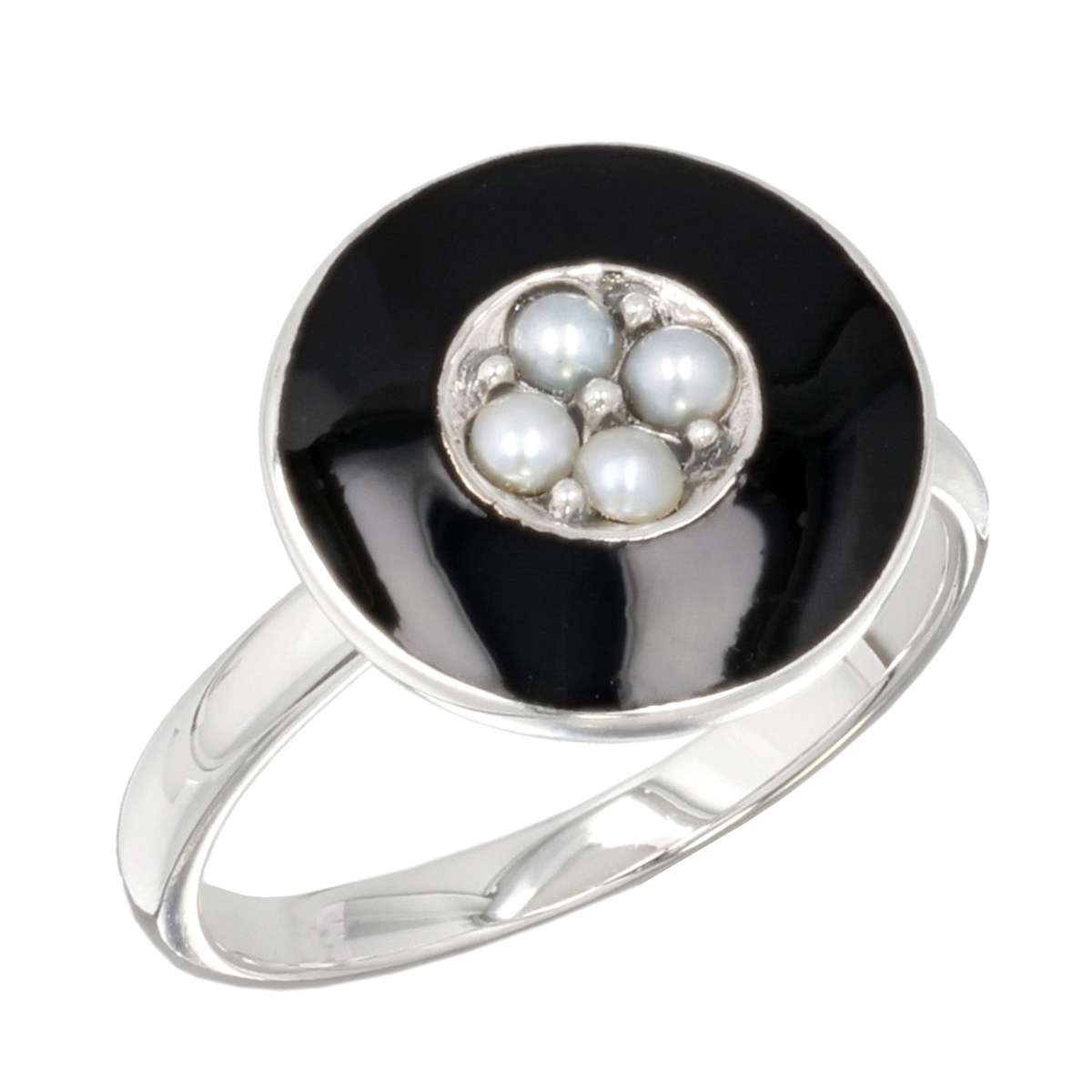 モダンで端正なアールデコ調のデザイン。ブラックエナメルの艶と淡水パールの優しい光沢が、大人のお手元に上質なアクセントを添えます