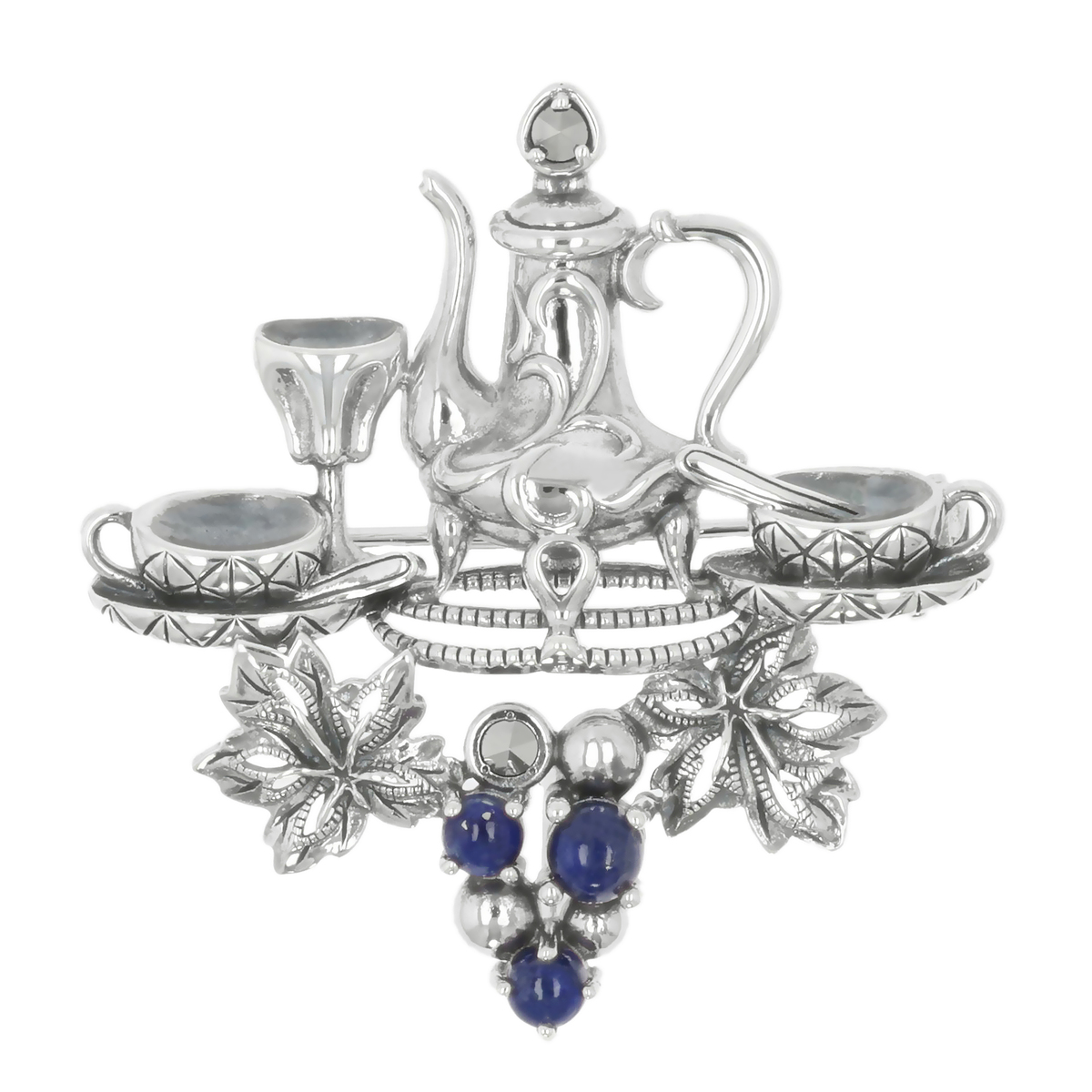 クロード・モネの『庭の昼食』に着想を得たブローチ。ティーセットや葡萄のモチーフに、ロイヤルブルーのラピスラズリを合わせて優雅にデザイン。19世紀のフランスの気品を感じさせます