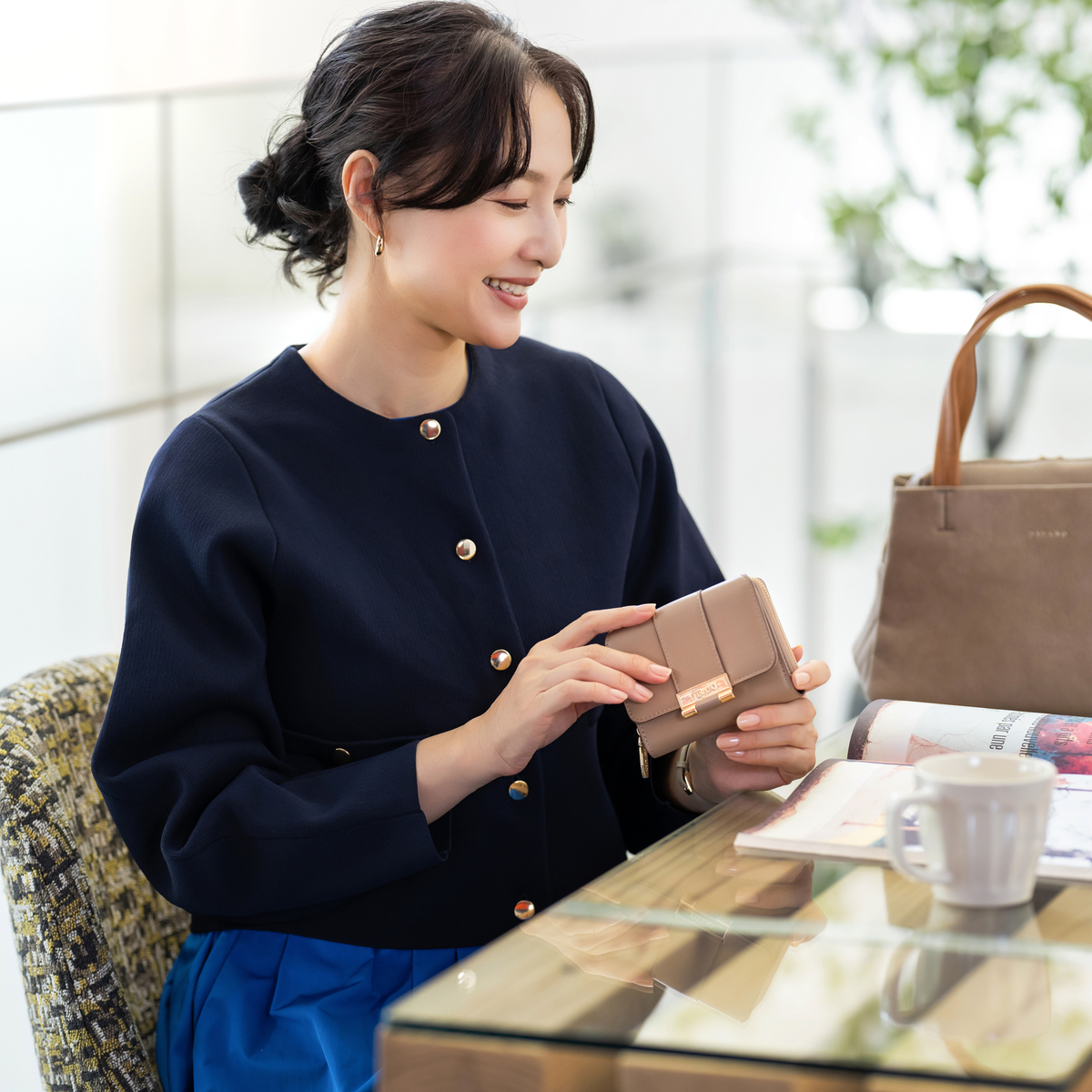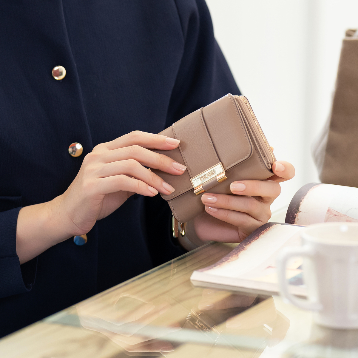 上品デザインのウォレット。手に収まるコンパクトなサイズ感で、バッグに入れてもかさばることなく収納可能。コイン収納に便利なファスナースペースは2パートに仕切られています
