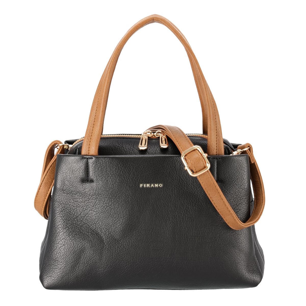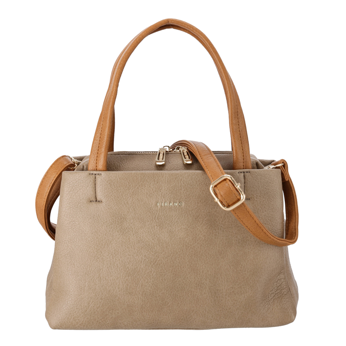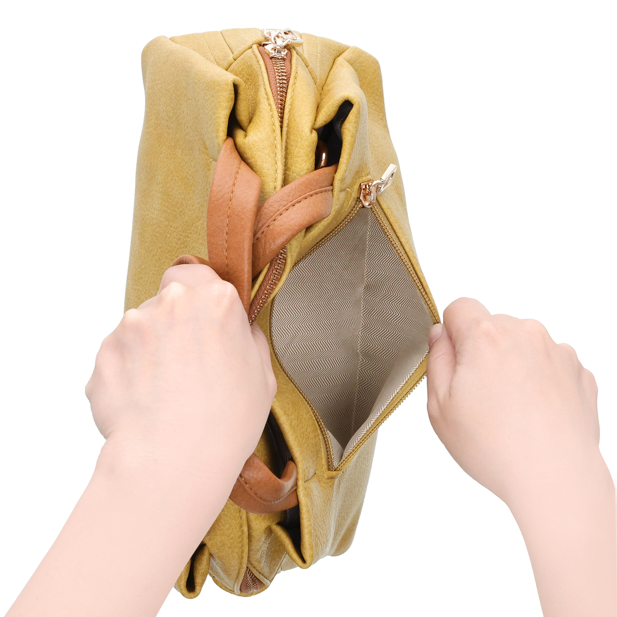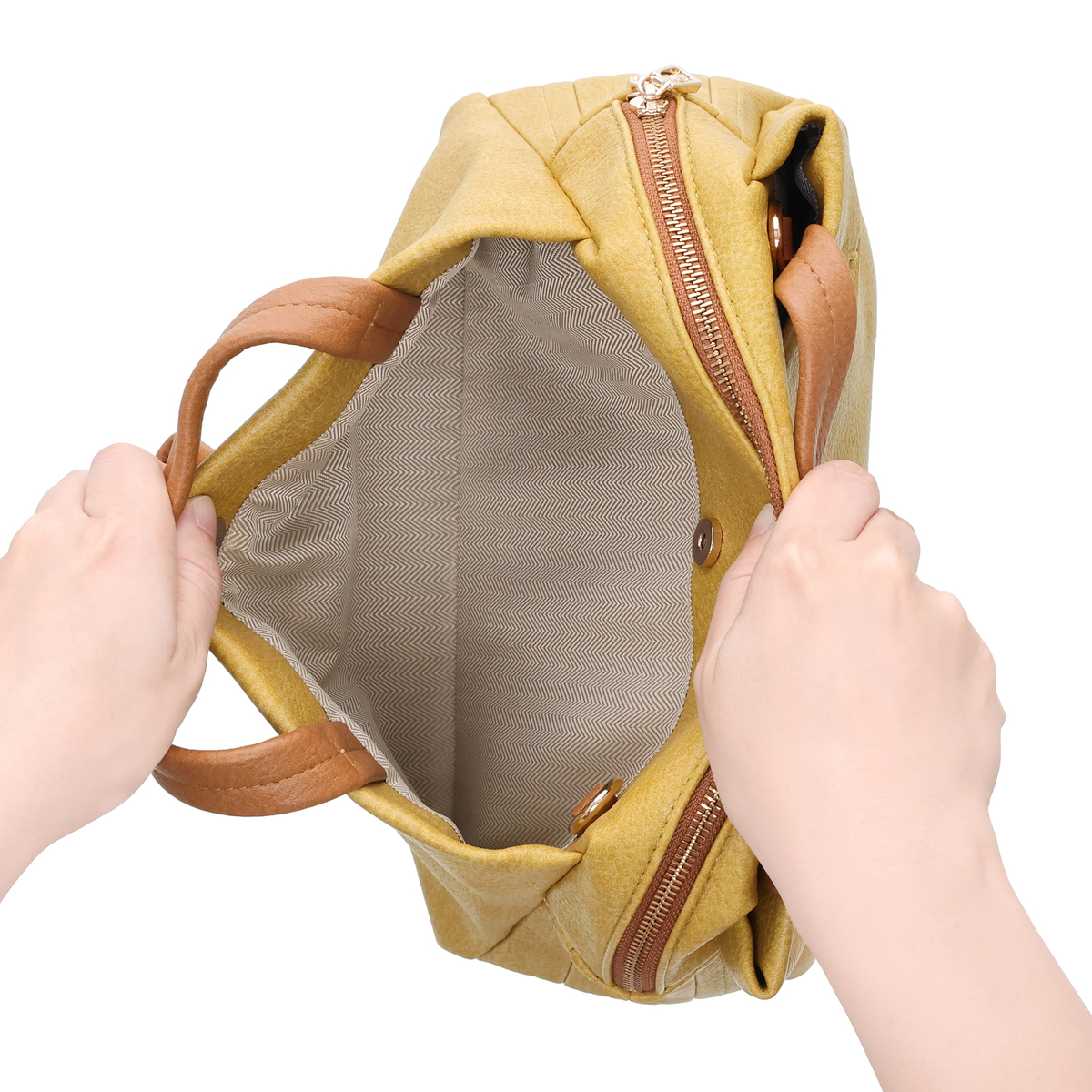 ショルダーベルト、持ち手と本体がバイカラーデザインのハンドバッグ。前後はマグネット開閉、中央はファスナー開閉と分かれているため、小物もきれいに整理できます。ふっくらとしたボリュームのあるフォルムでたっぷり収納が叶います