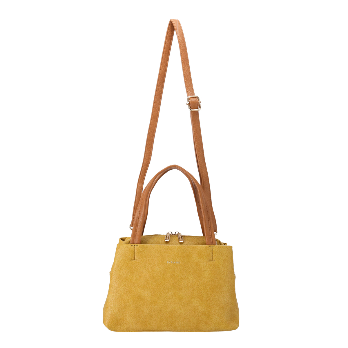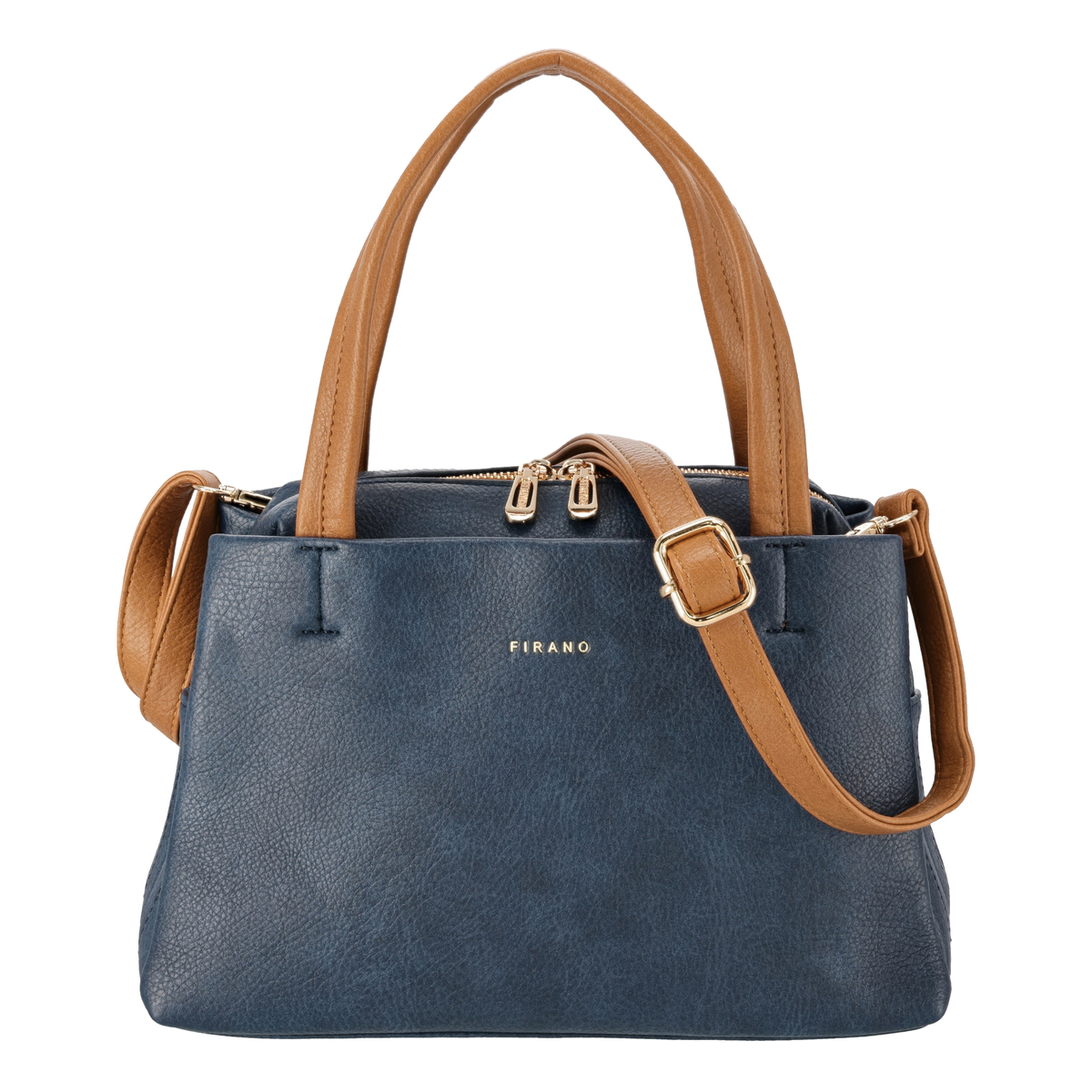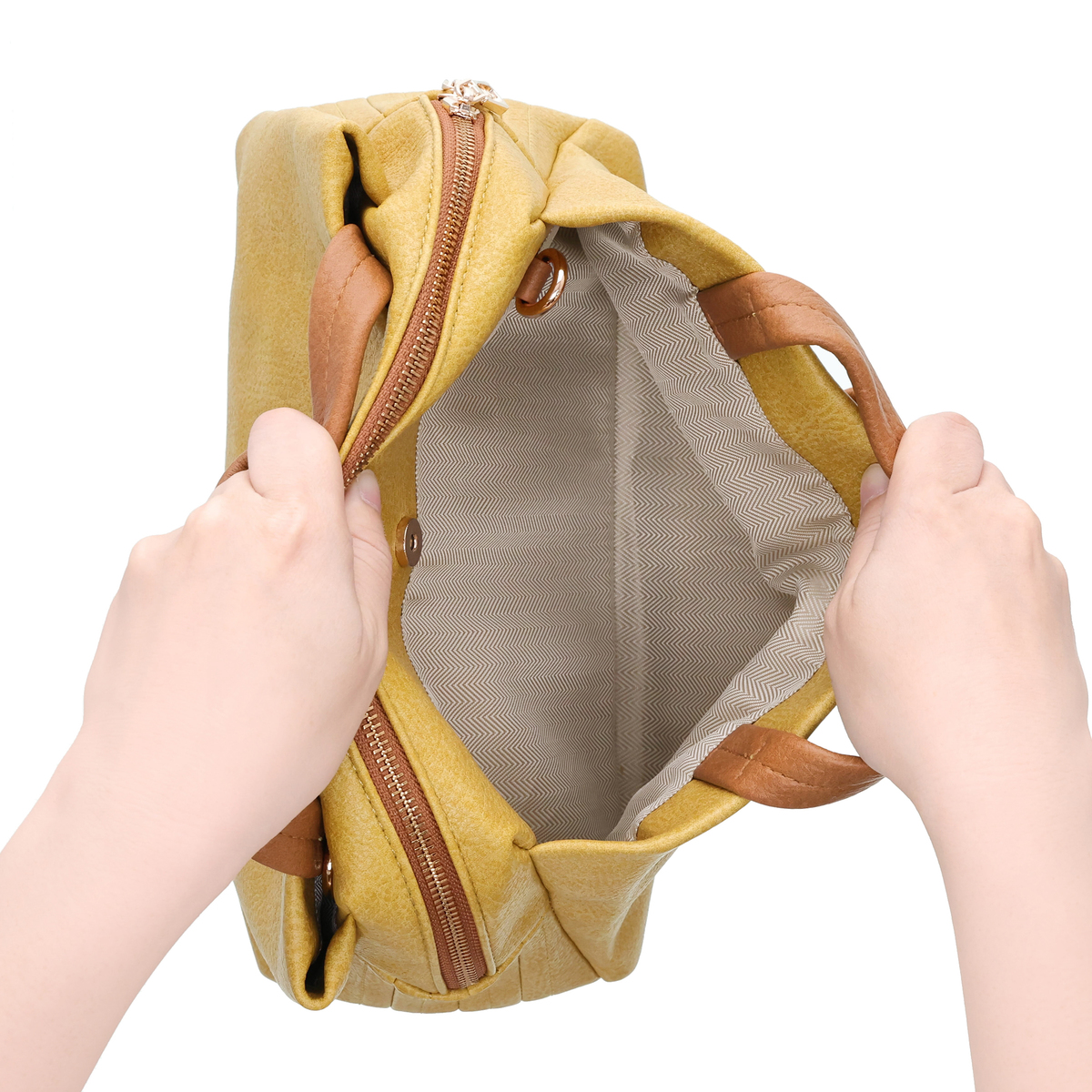 ショルダーベルト、持ち手と本体がバイカラーデザインのハンドバッグ。前後はマグネット開閉、中央はファスナー開閉と分かれているため、小物もきれいに整理できます。ふっくらとしたボリュームのあるフォルムでたっぷり収納が叶います