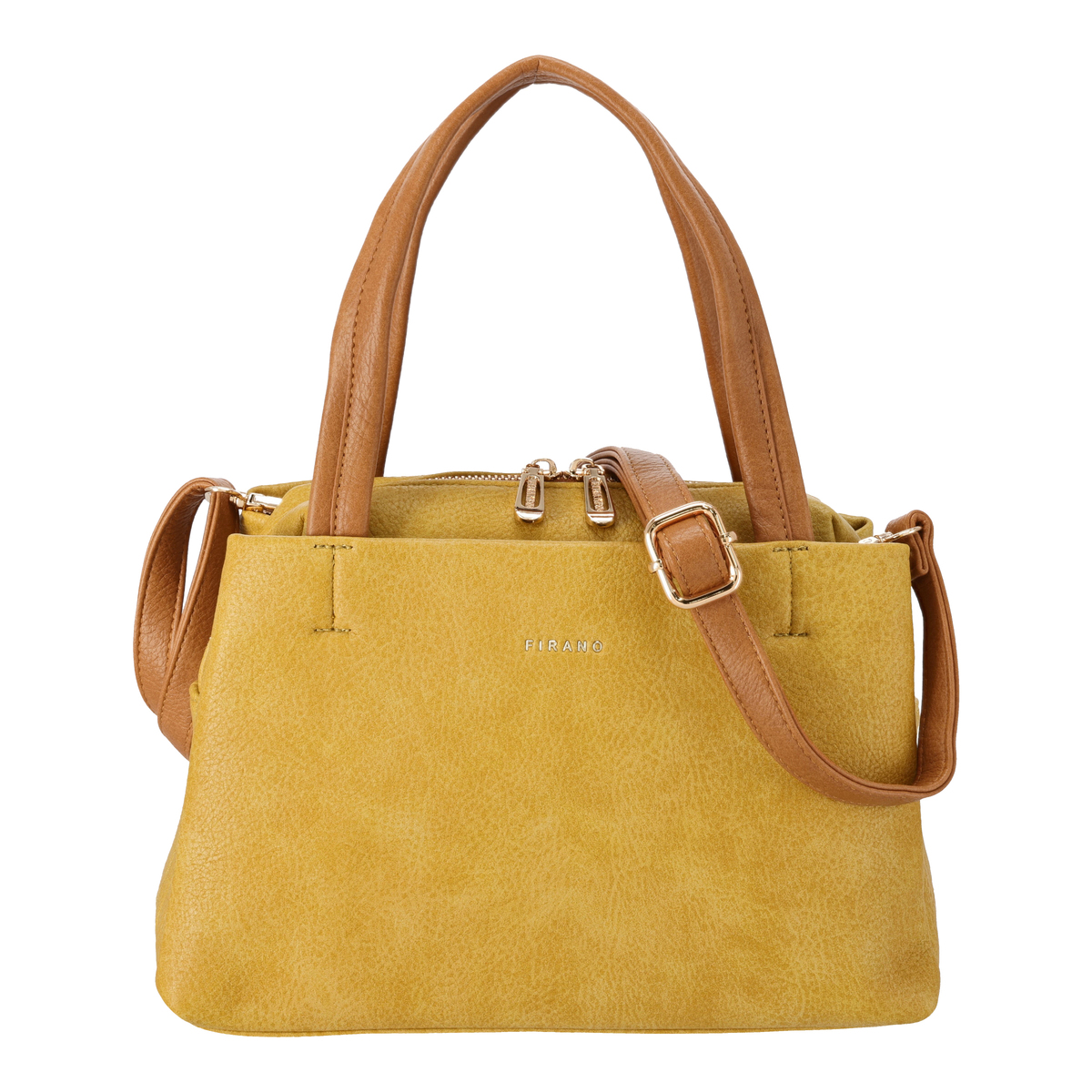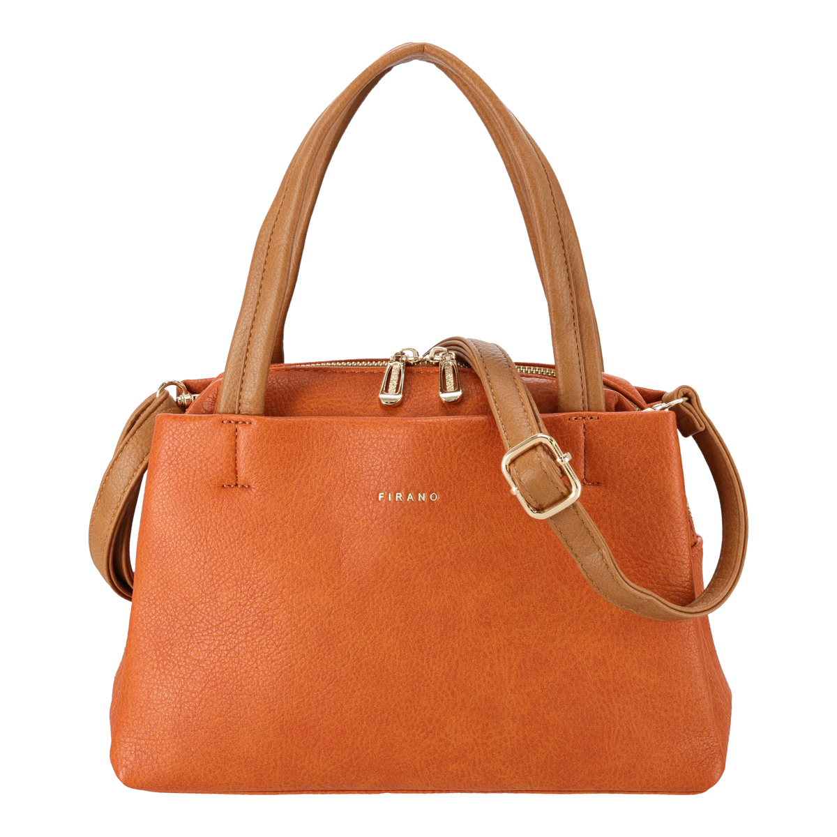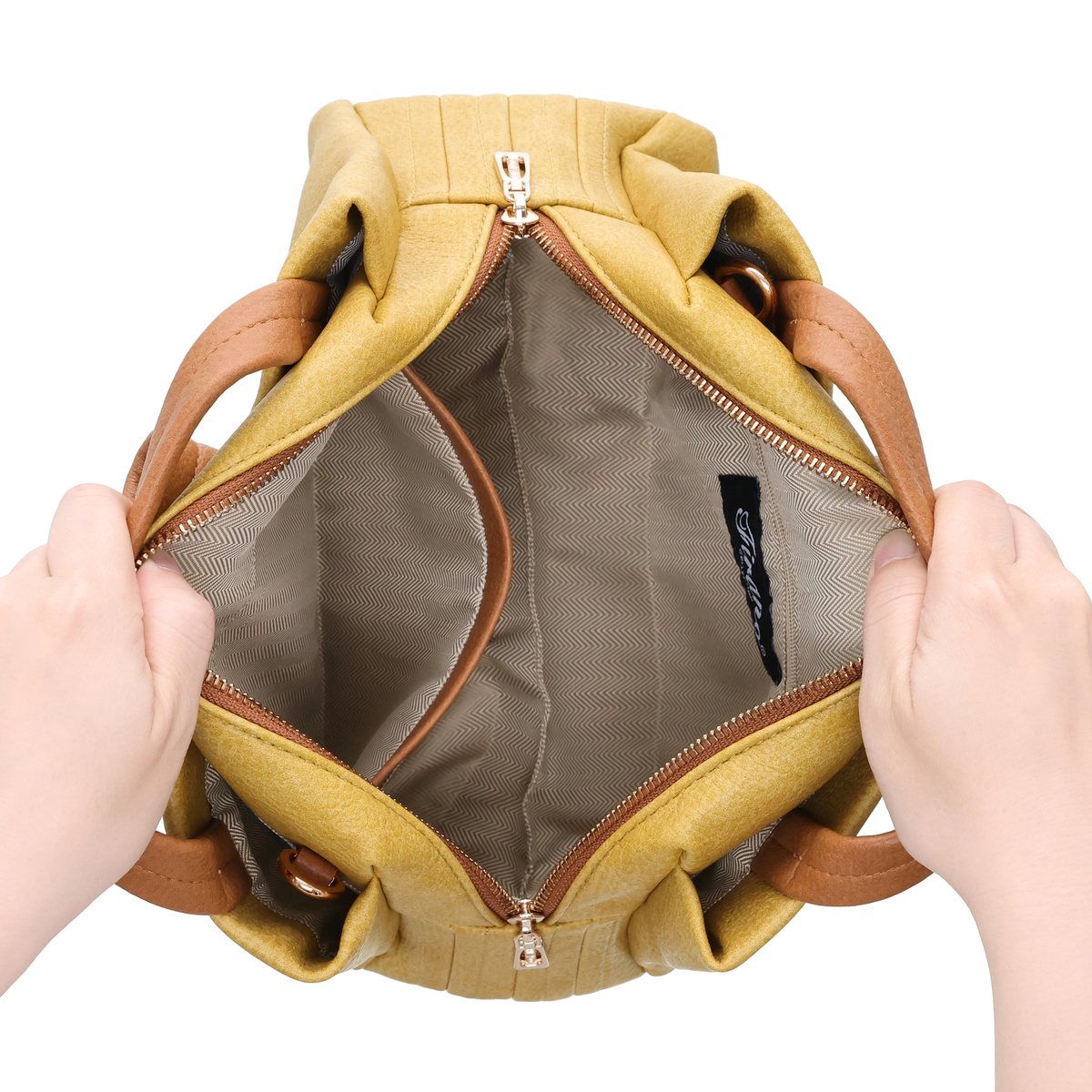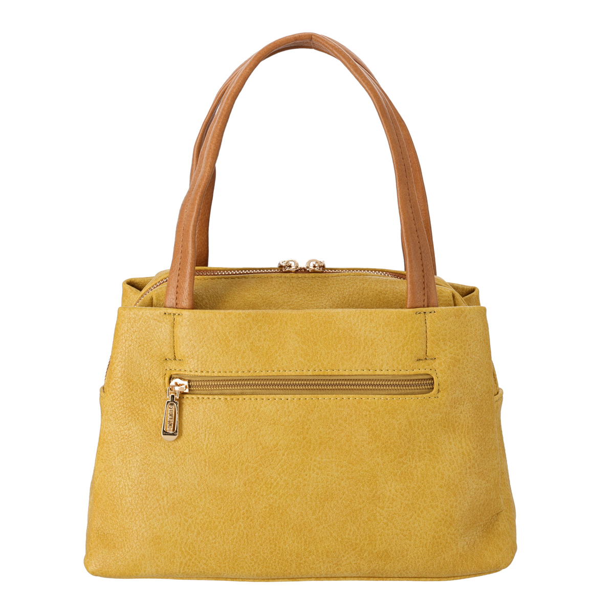 ショルダーベルト、持ち手と本体がバイカラーデザインのハンドバッグ。前後はマグネット開閉、中央はファスナー開閉と分かれているため、小物もきれいに整理できます。ふっくらとしたボリュームのあるフォルムでたっぷり収納が叶います
