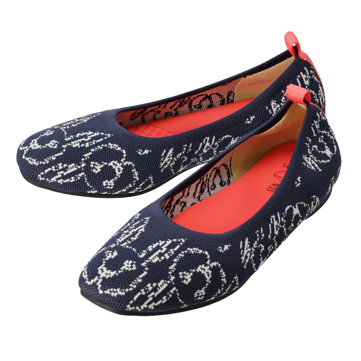少し丸みのあるスクエアトゥのパンプス。足先がやや広く作られているので、つま先が痛くなりにくい形です。製造工程で接着剤を使用せず、アッパーに伸縮性・屈曲性に優れたニットを使用することで、靴全体のフィット感をアップさせています