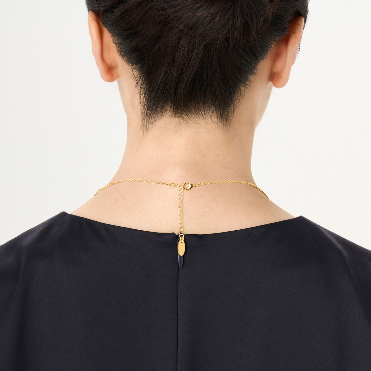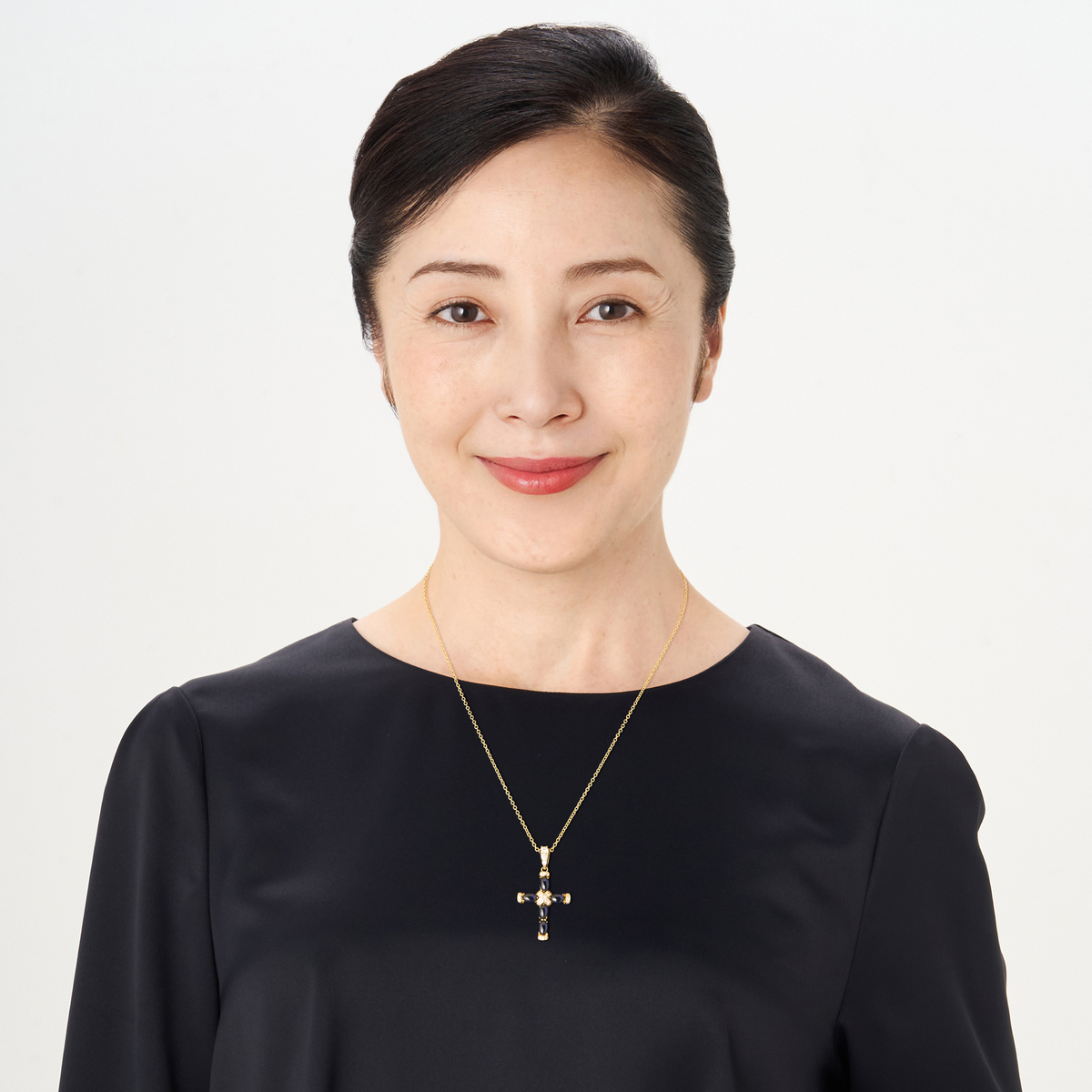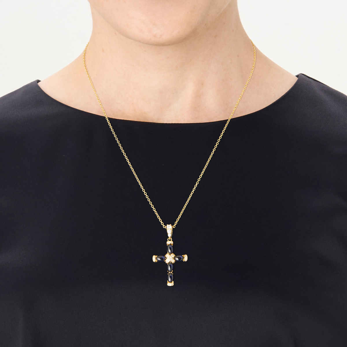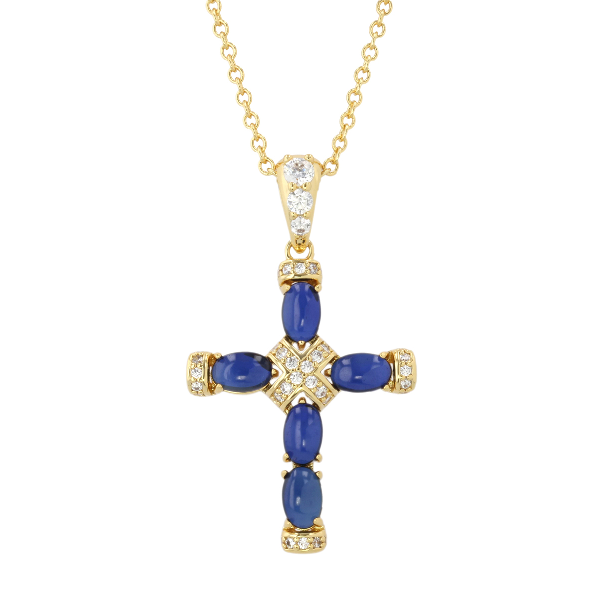 合成石とは、ガラスなどでつくられた模造石とは異なり、天然石と同じ化学組成や結晶構造をもった人工宝石のこと。ご紹介するのは、カボションの合成サファイヤを贅沢に5石使用したクロスペンダントです