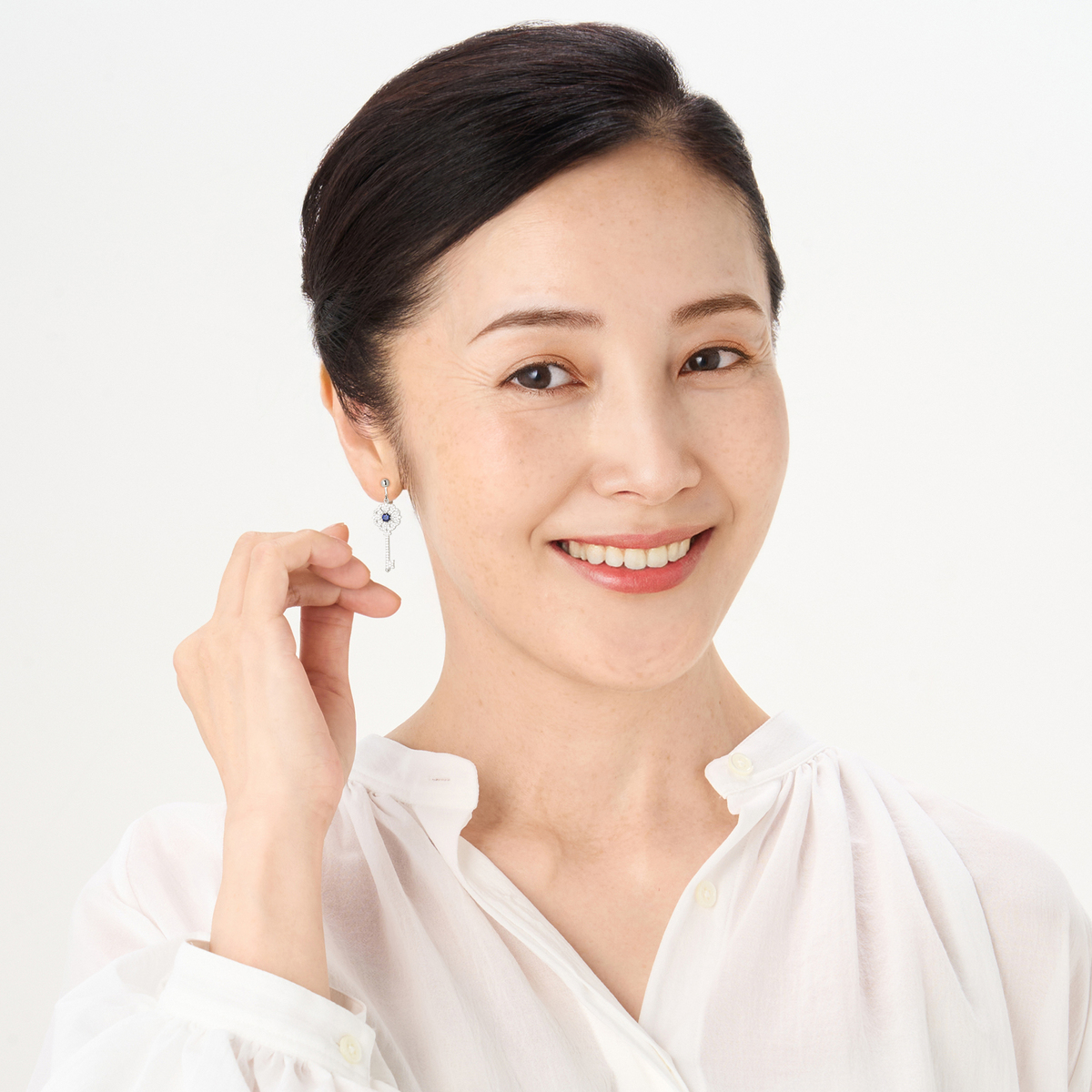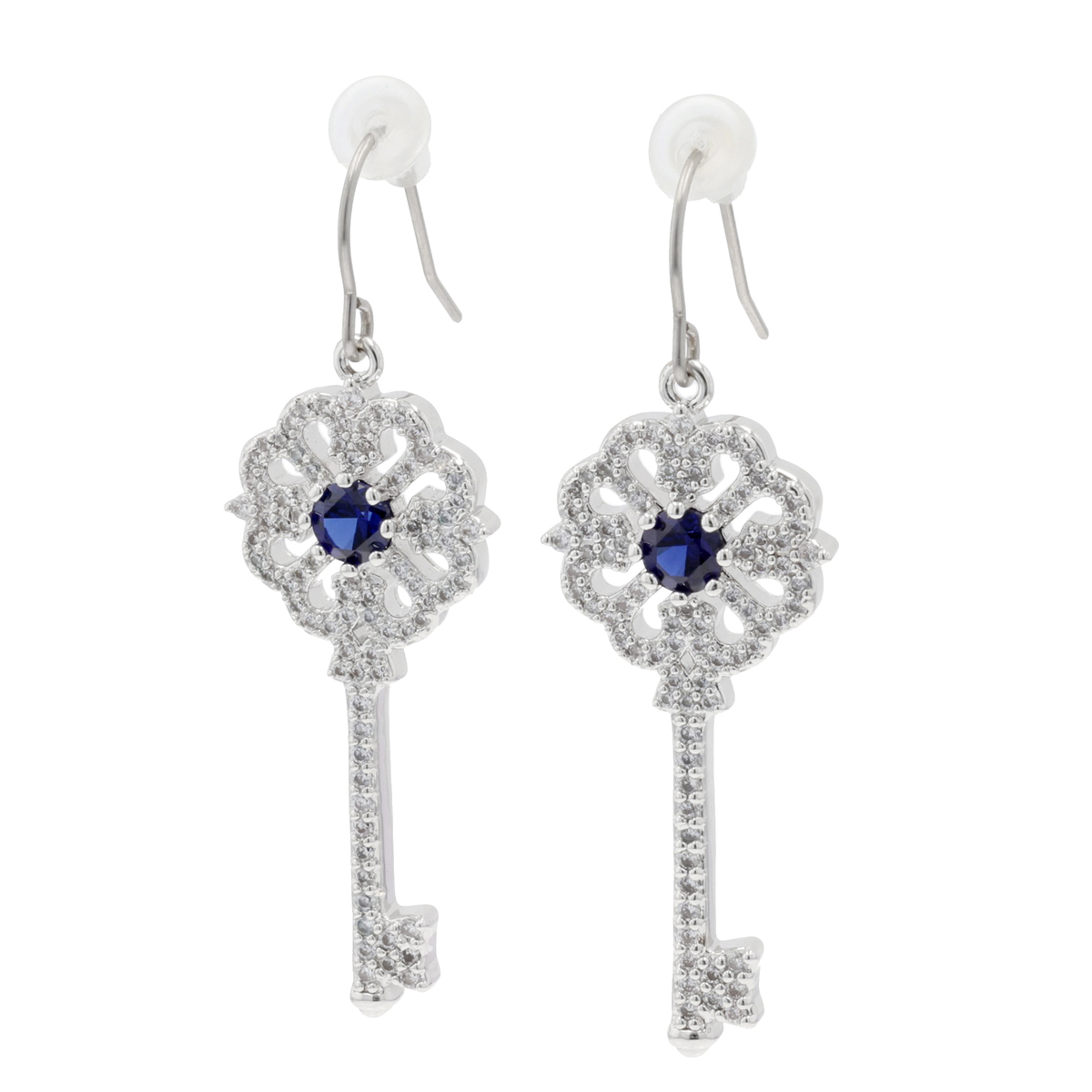 キュービックジルコニアをあしらったキーモチーフのイヤリングまたはピアス。中央にはロイヤルブルーの合成サファイヤをセット。繊細なデザインが耳元で存在感を発揮します