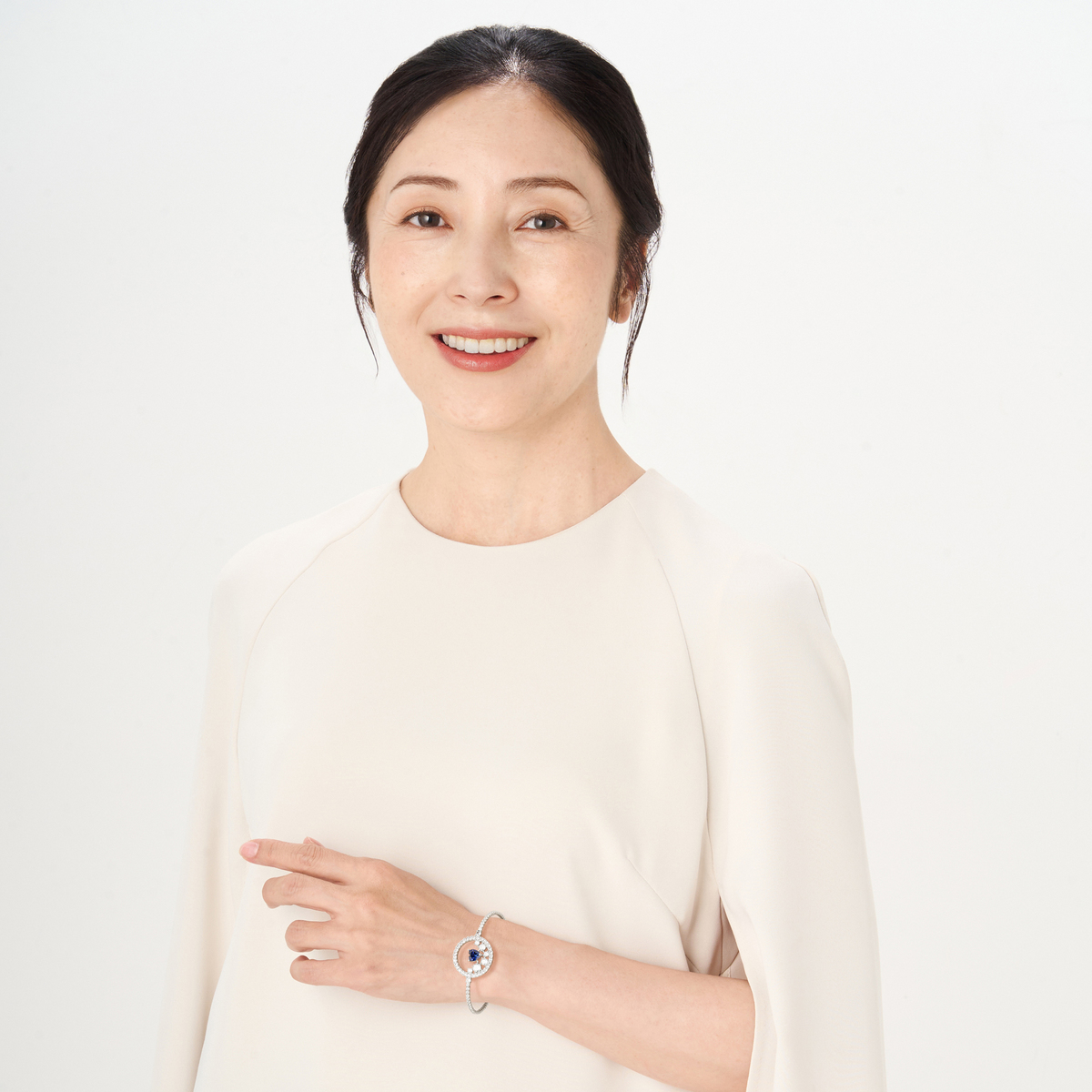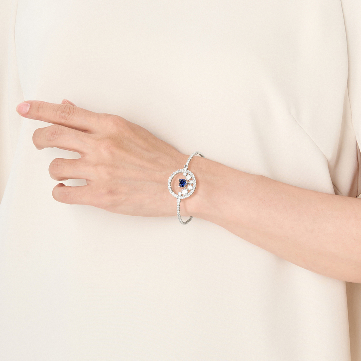 合成石とは、ガラスなどでつくられた模造石とは異なり、天然石と同じ化学組成や結晶構造をもった人工宝石のこと。ご紹介するのは、合成サファイヤを使用したブレスレットです