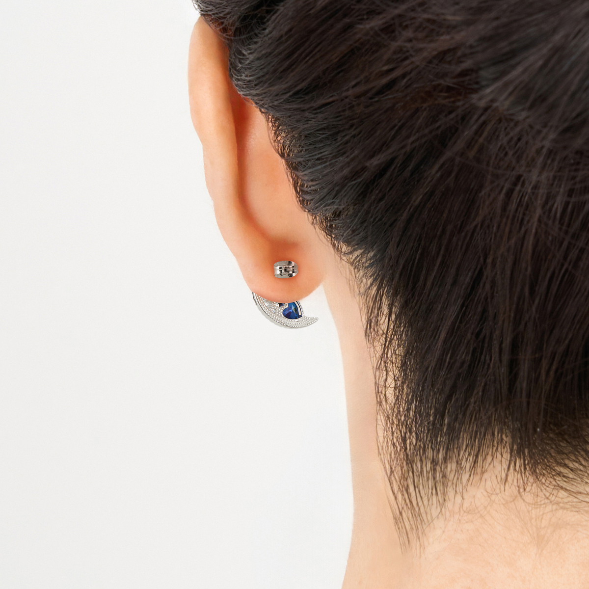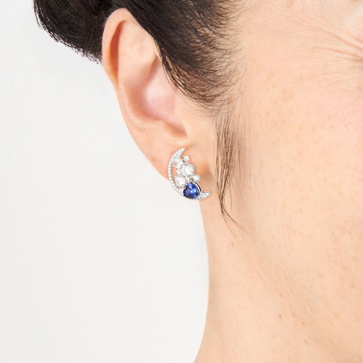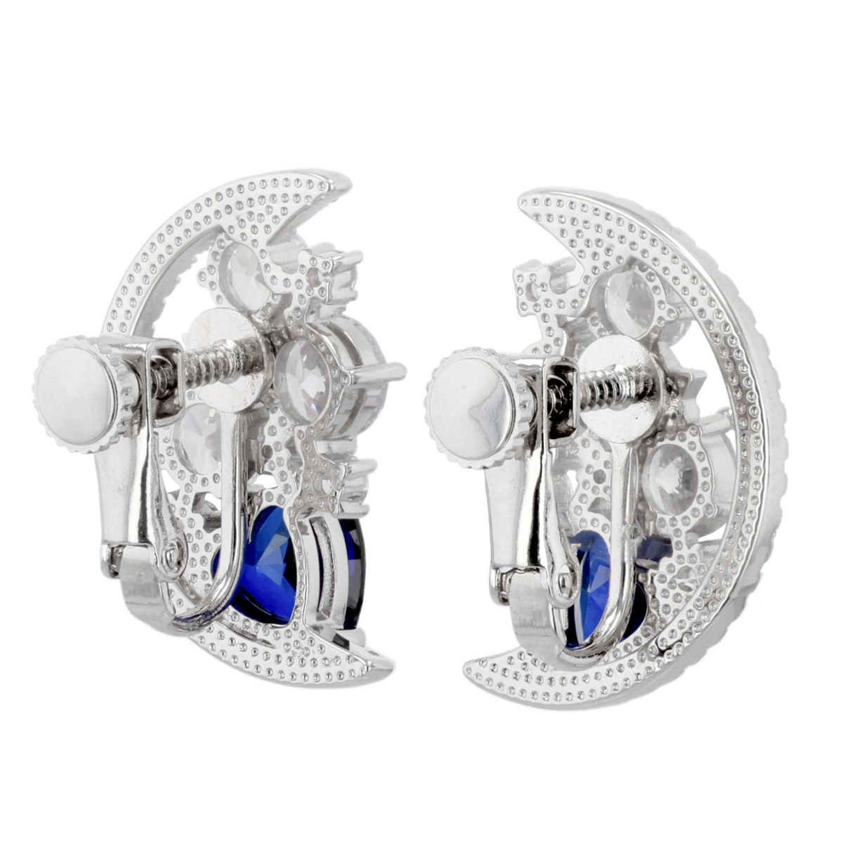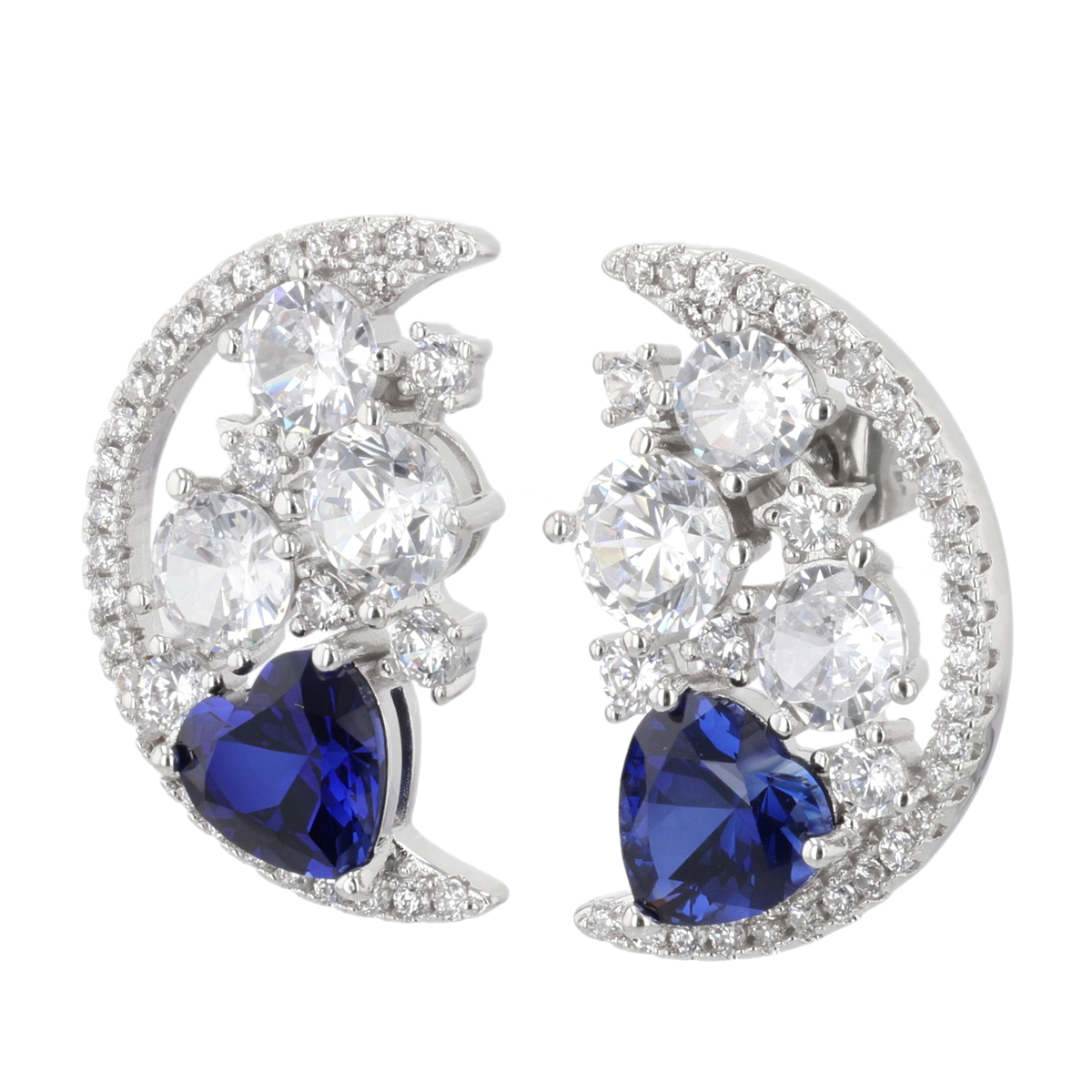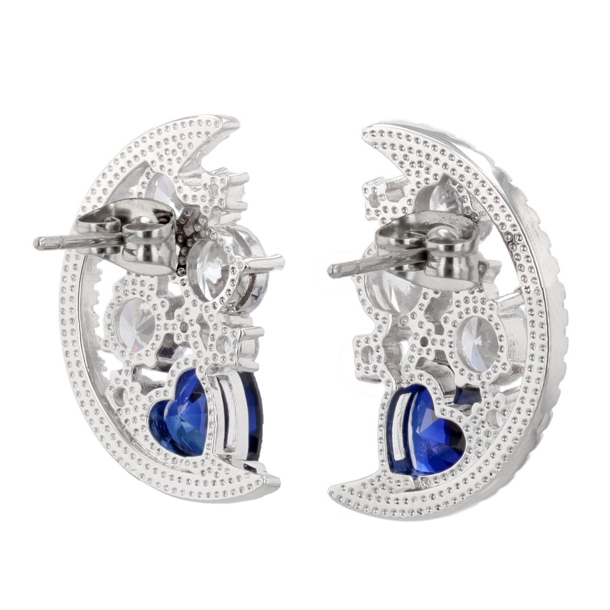 ハートシェイプの合成サファイヤとキュービックジルコニアを散りばめたイヤリングまたはピアス。濃いブルーと透明感のある輝きが耳元を華やかに彩ります