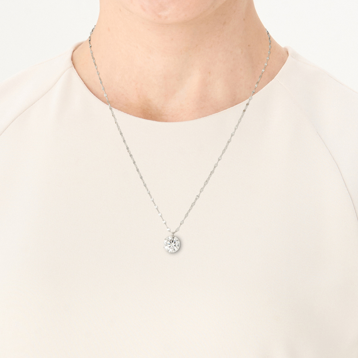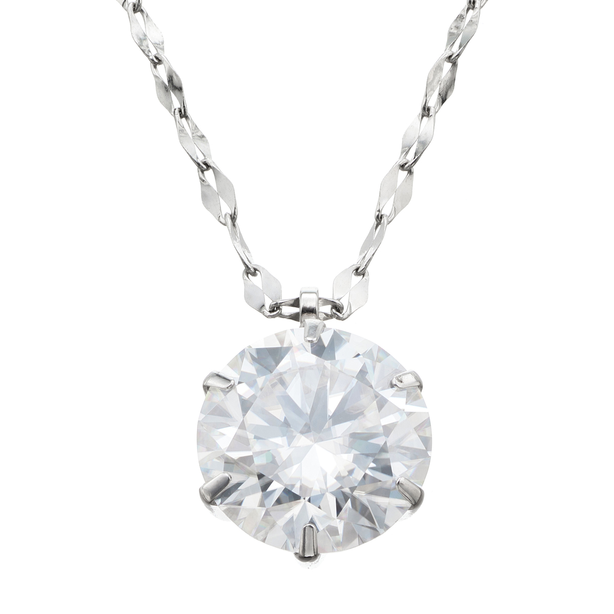 3.00ctUPの合成モアッサナイトをあしらったペンダントです。留める枠にはプラチナ950を使用。6本爪のシンプルなデザインが合成モアッサナイトの美しさを引き立て、胸元に印象的な輝きをもたらします