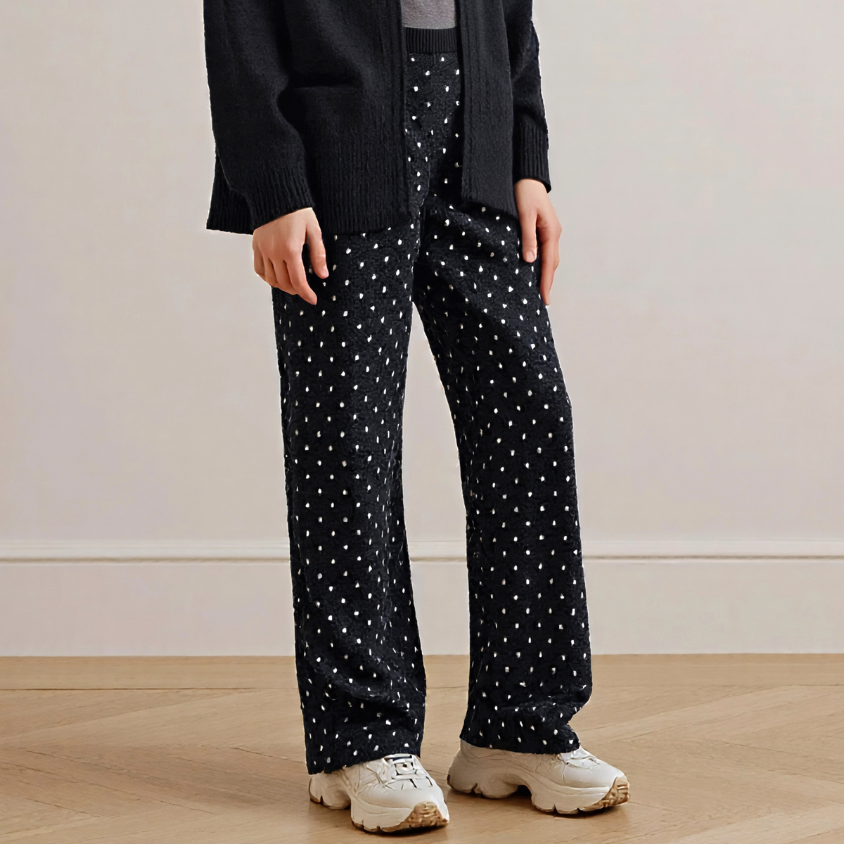 プルオンタイプでゆったりめのストレートニットパンツ。ウエストはリブ編みに。伸縮性のあるニットで窮屈感を感じにくく、おしゃれなスタイリングが楽しめます