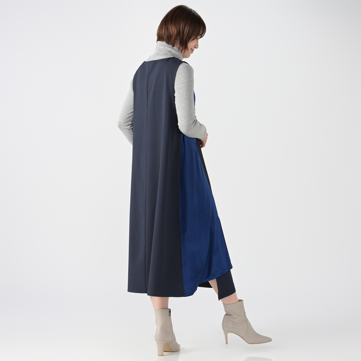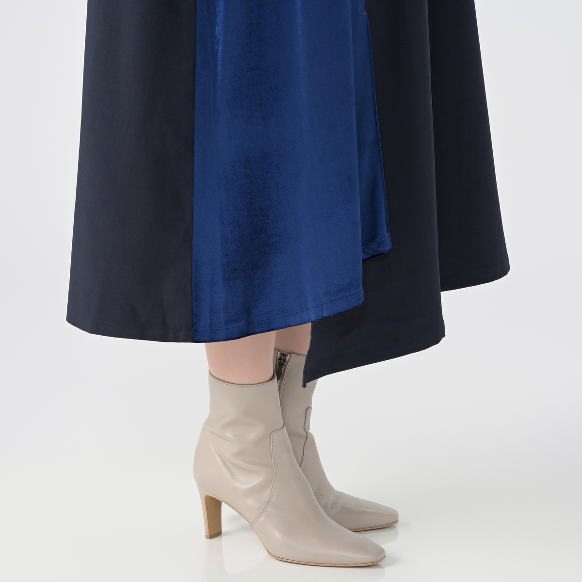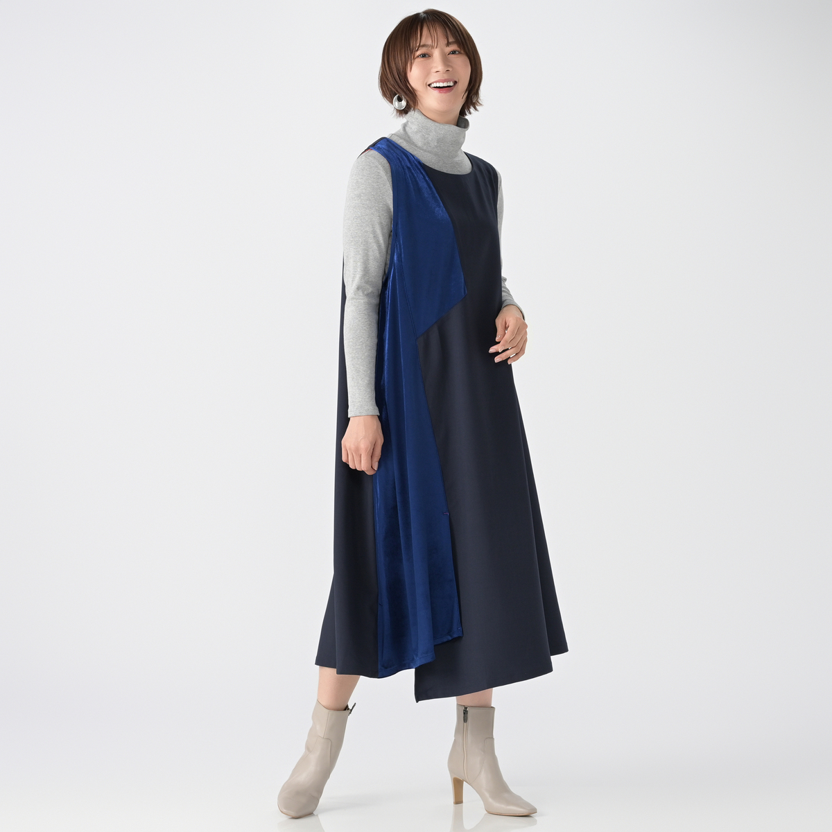 イナズマ型の切替えが大胆なジャンパースカートです。イナズマ部分はベロア素材を逆毛にして使用することで、少し落ち着いた光沢感となり、上品な印象に。裾はイレギュラーヘムで前後差があり、スリットを入れることで動きのあるフレアシルエットが生まれます