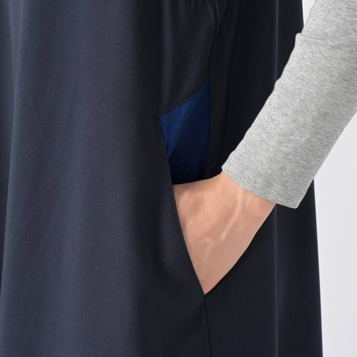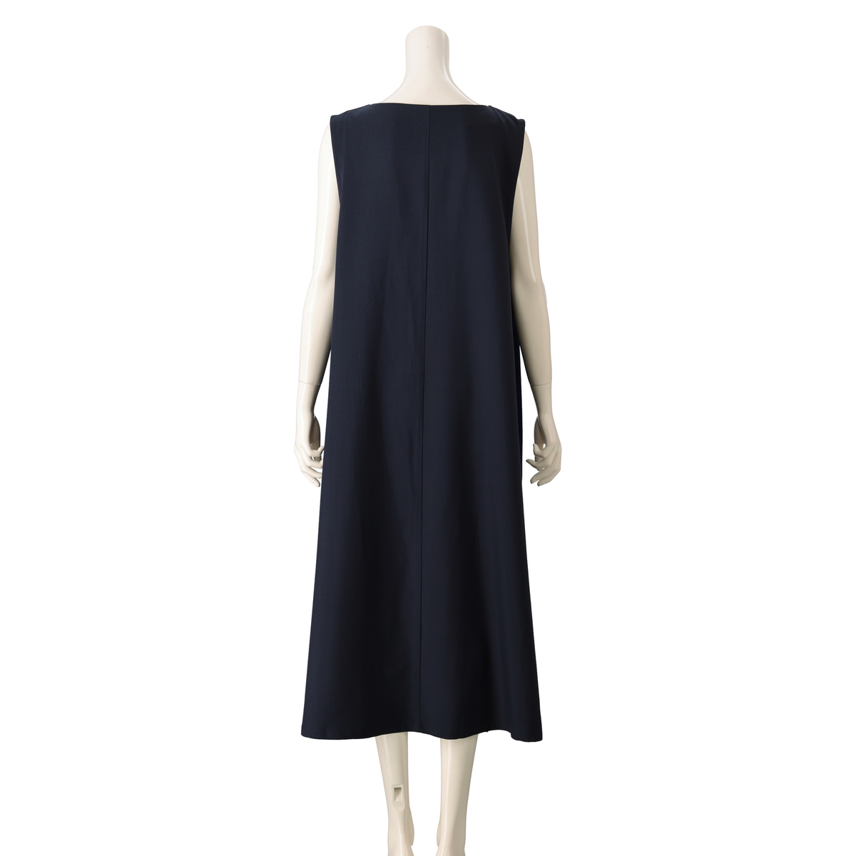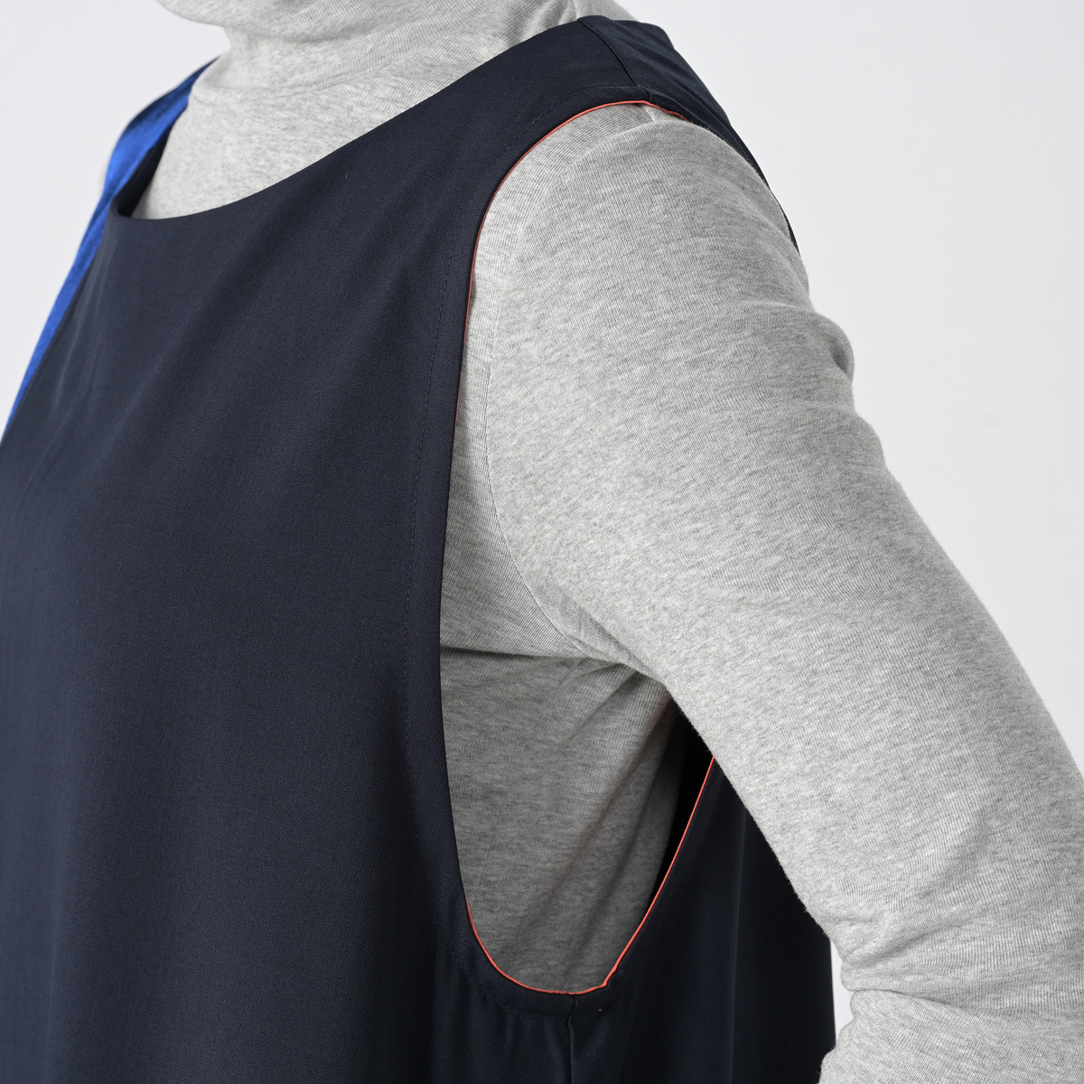 イナズマ型の切替えが大胆なジャンパースカートです。イナズマ部分はベロア素材を逆毛にして使用することで、少し落ち着いた光沢感となり、上品な印象に。裾はイレギュラーヘムで前後差があり、スリットを入れることで動きのあるフレアシルエットが生まれます