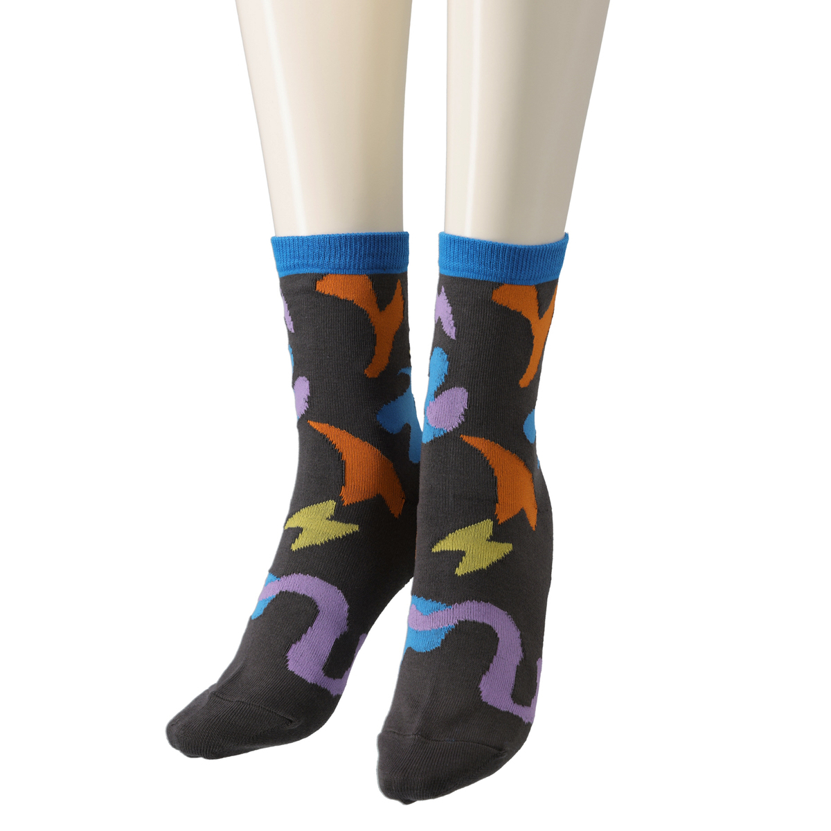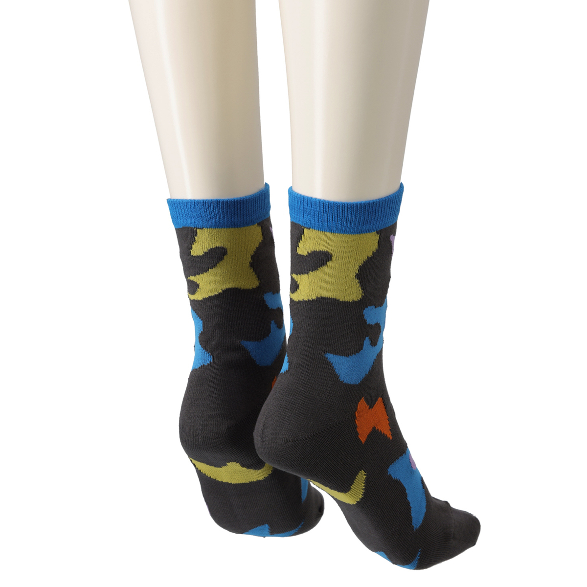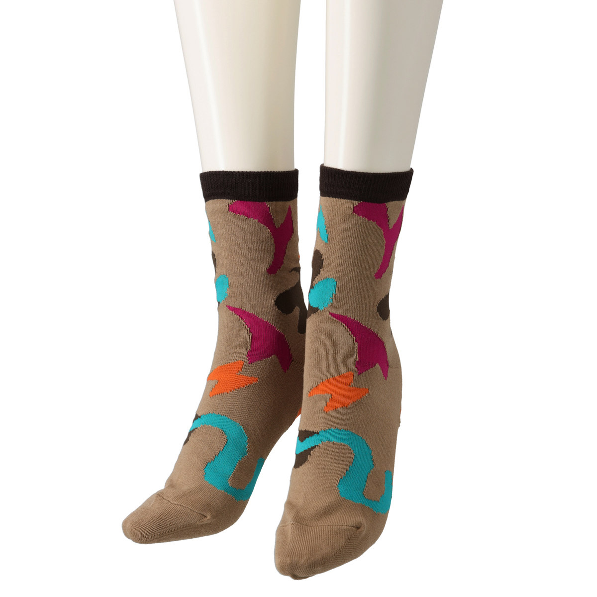 イナズマモチーフをカモフラージュ調で表現したジャガード編みのソックス。大きく大胆ながらも、繊細な色使いがSUPERLADYらしいデザインで、足元に彩りを与えてくれます