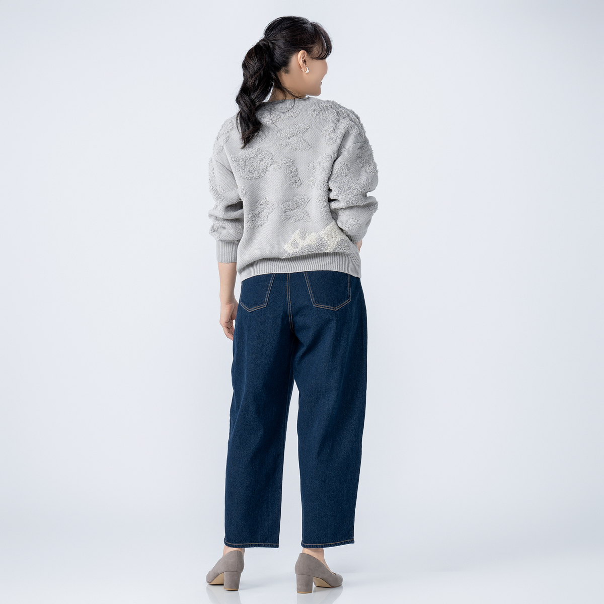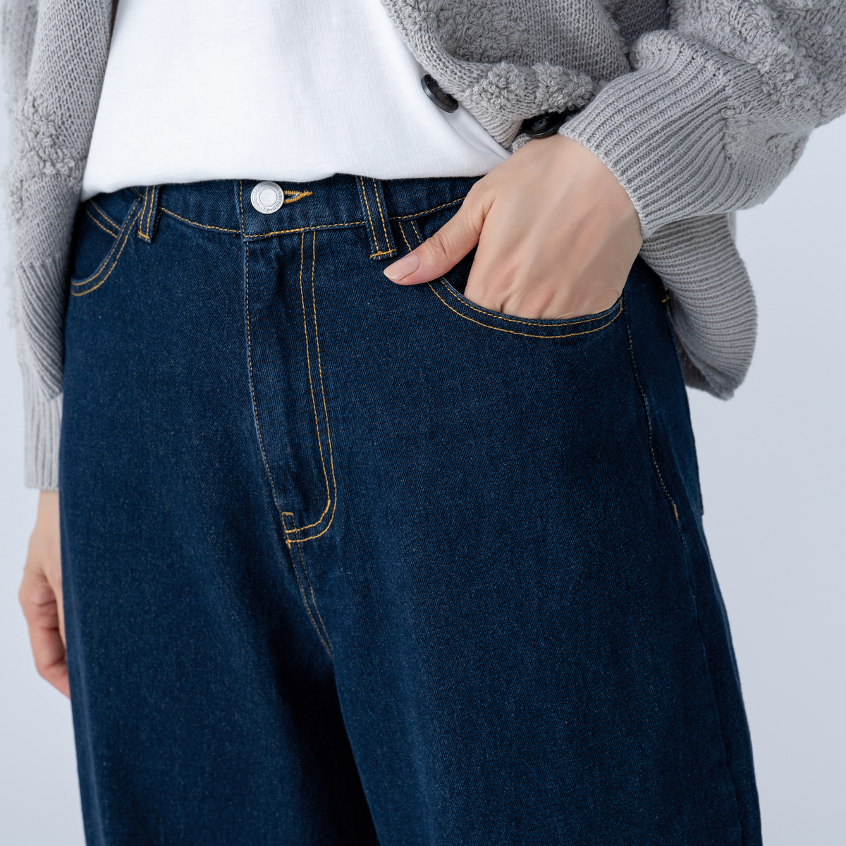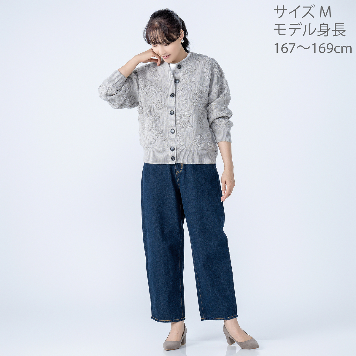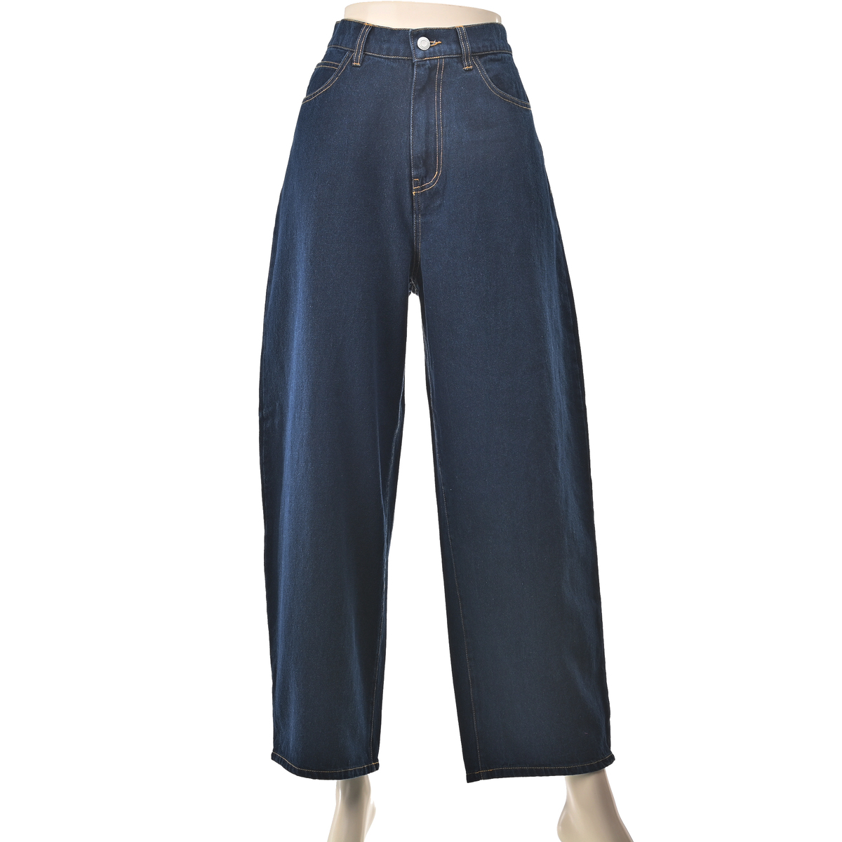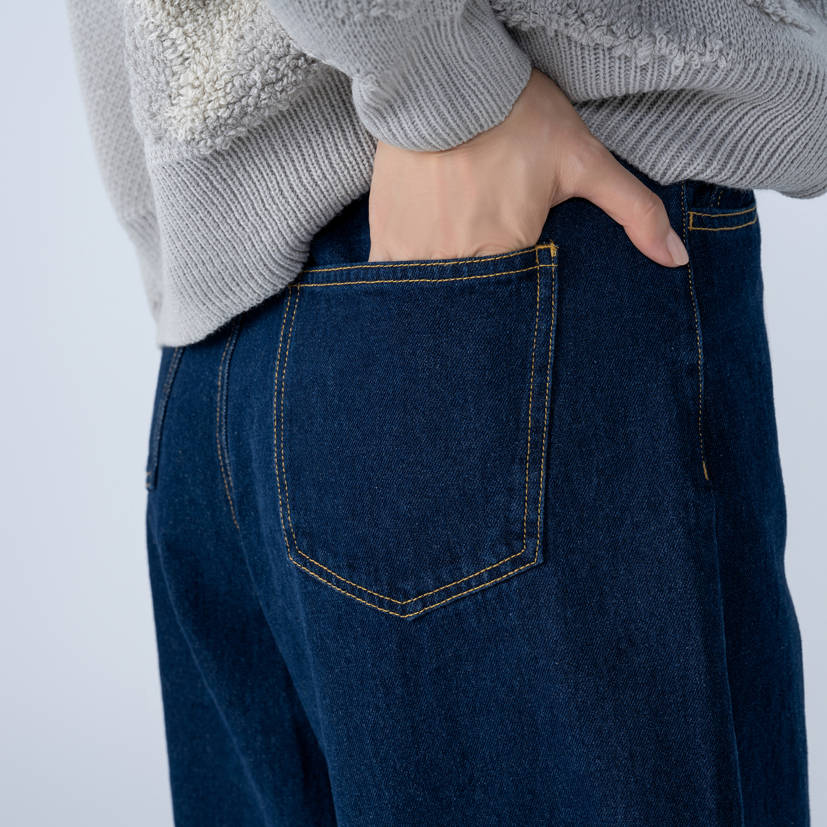 腰から膝にかけて自然な丸みを描き、裾へ向かってすっきりとしたトレンド感あるシルエットのデニムパンツです。シンプルなデザインがさりげなく個性を演出します