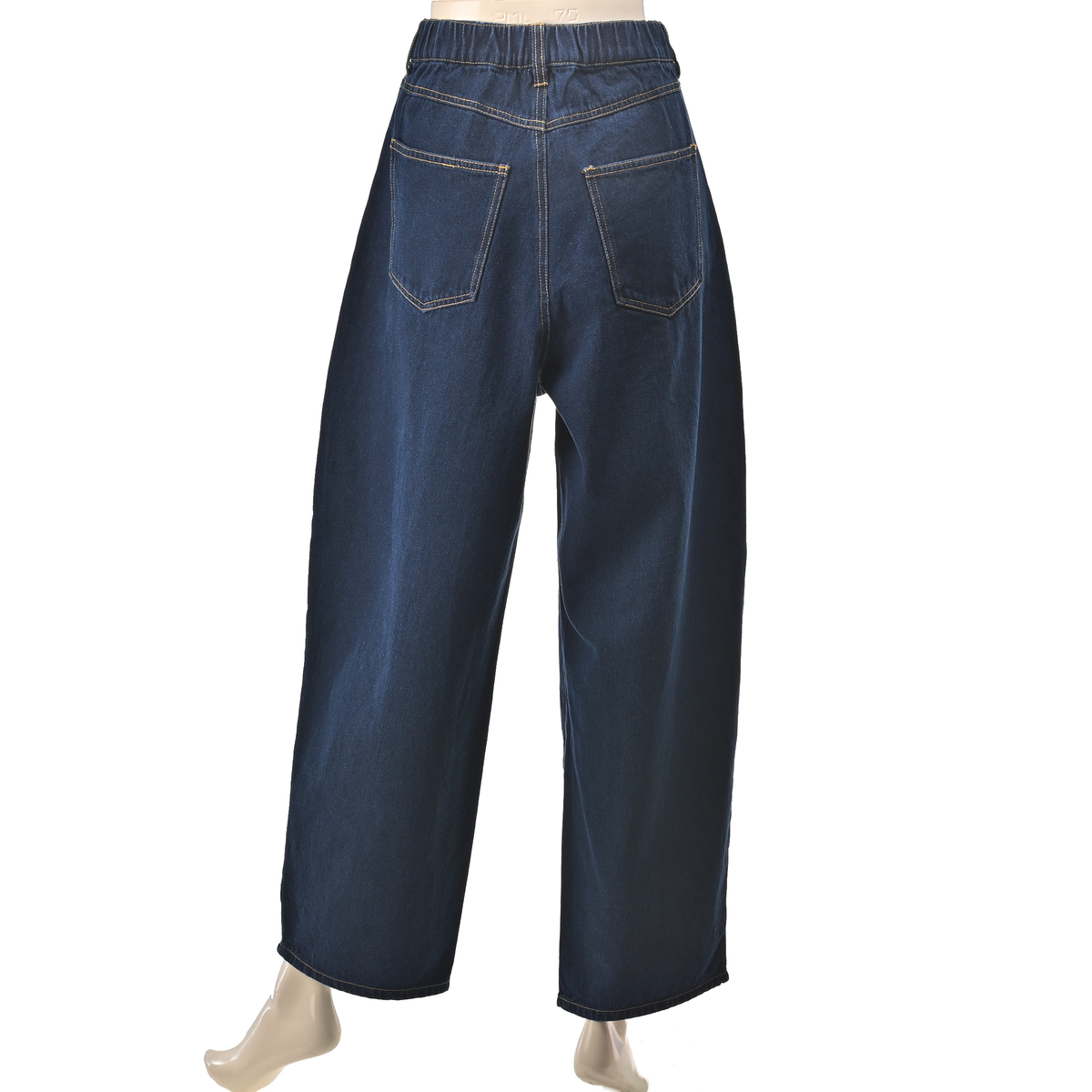 綿100%のインディゴ染めのデニム素材を使用。前中心はファスナー開き、ウエスト後ろはゴムギャザーでフィット感があります