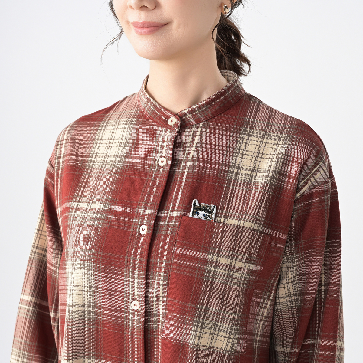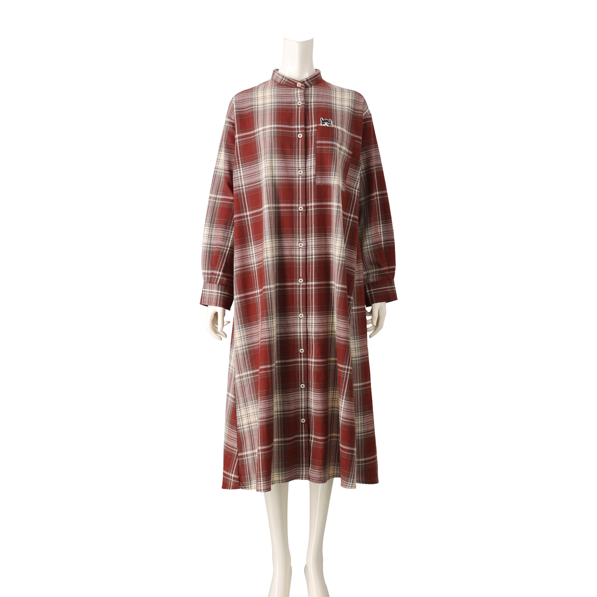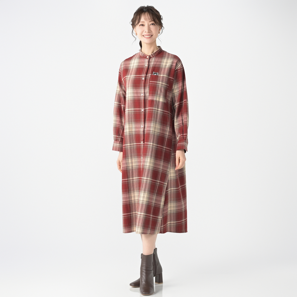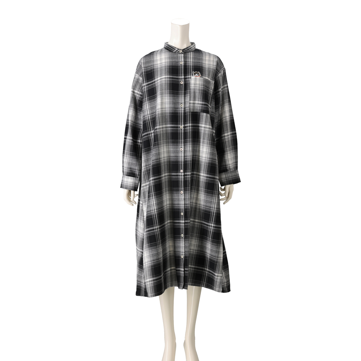 ポケットから覗く猫のワッペンがアクセントのチェック柄シャツワンピース。ゆったりとしたAラインに、バンドカラーが上品さを添えます