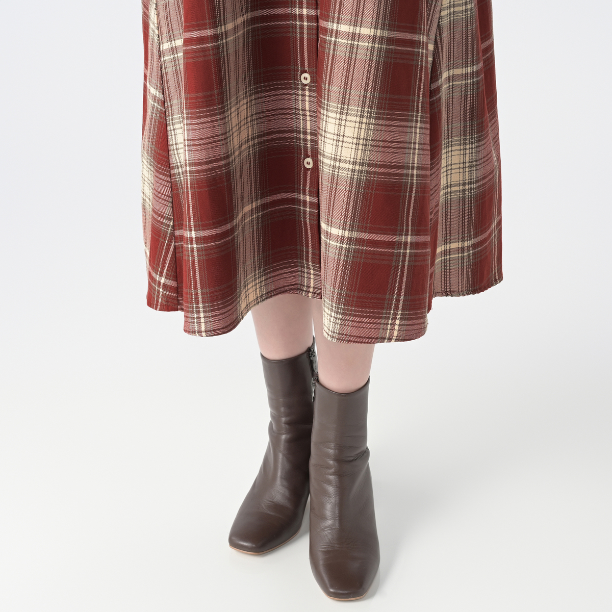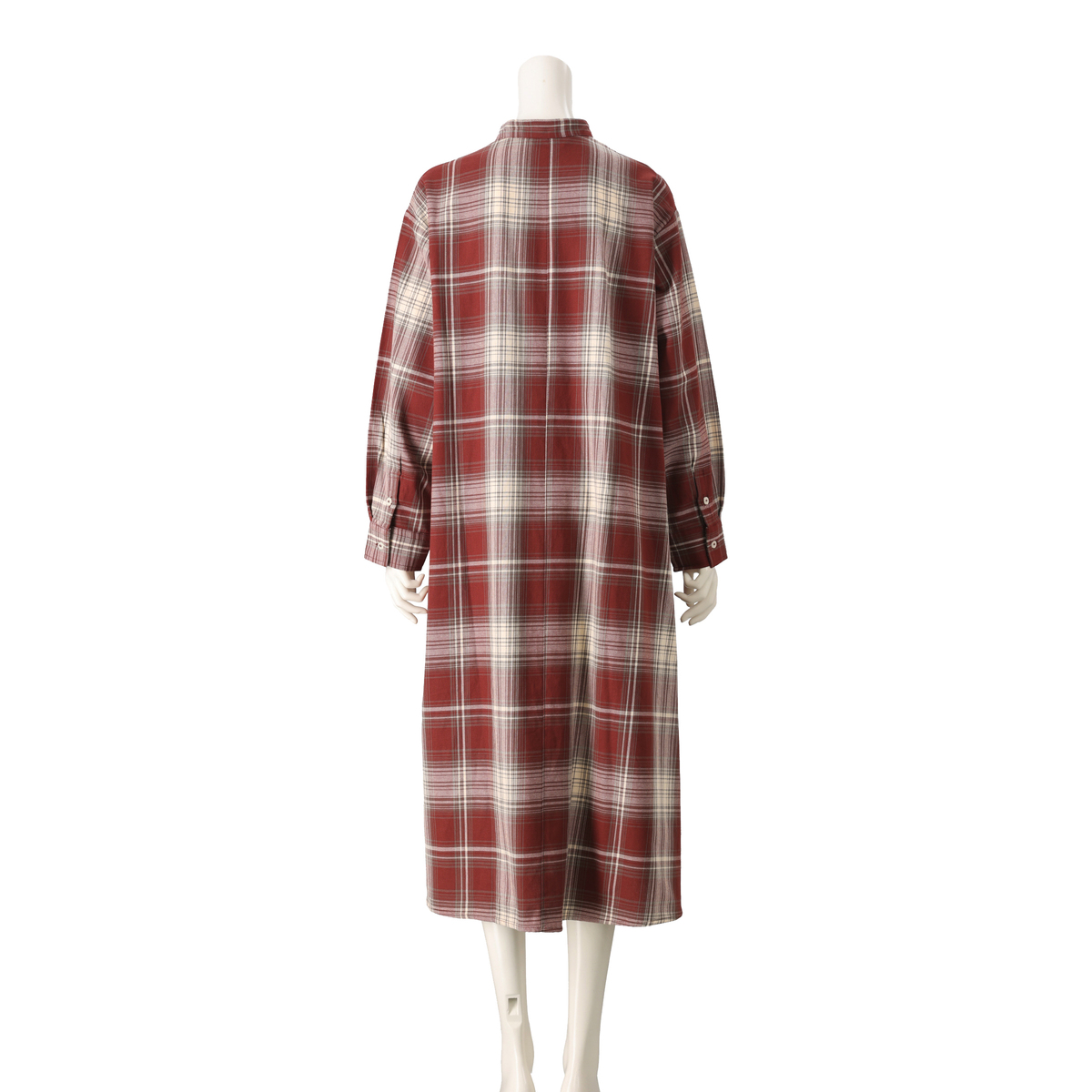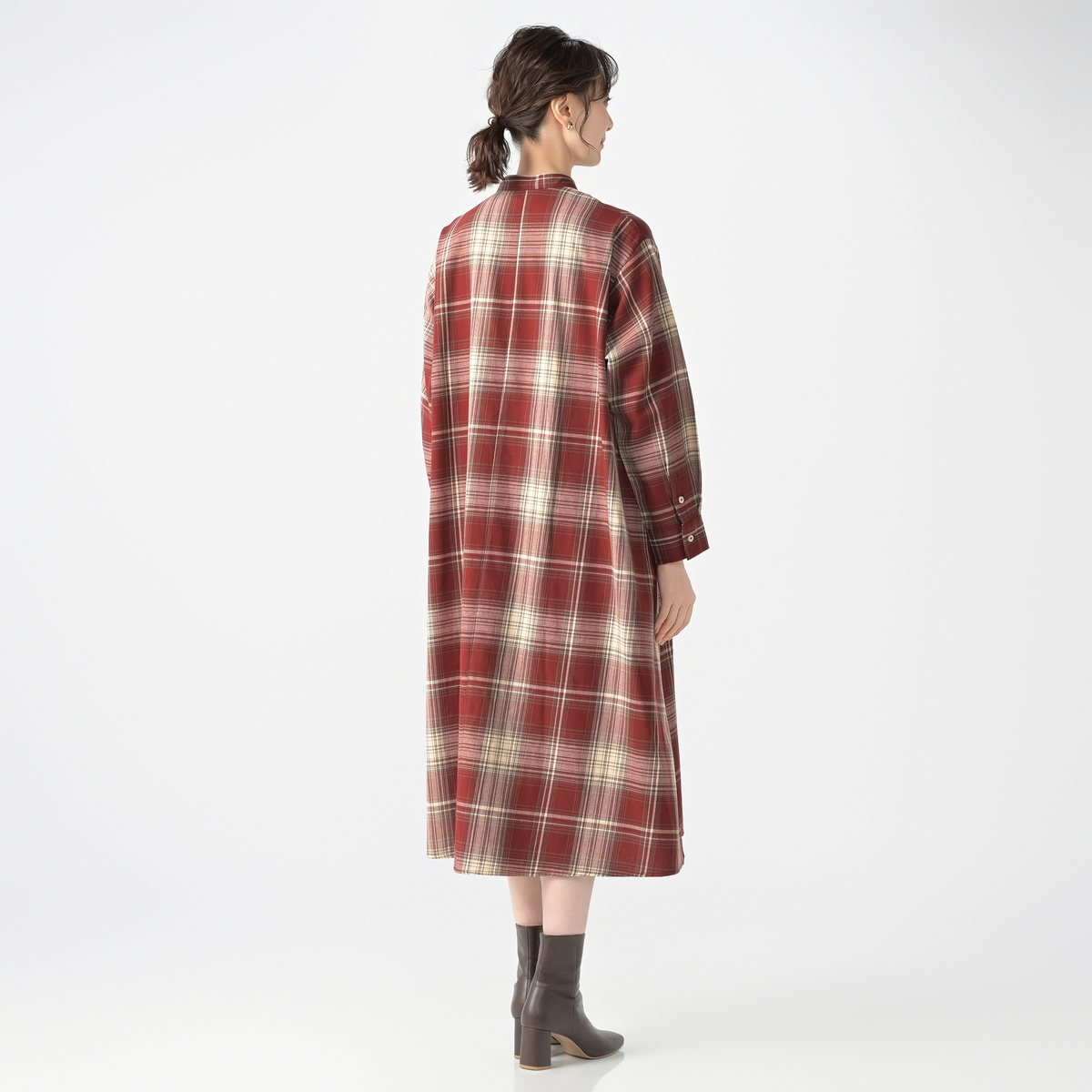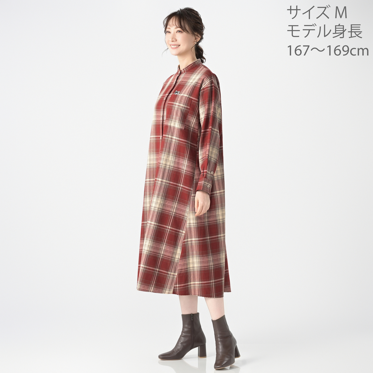 ポケットから覗く猫のワッペンがアクセントのチェック柄シャツワンピース。ゆったりとしたAラインに、バンドカラーが上品さを添えます