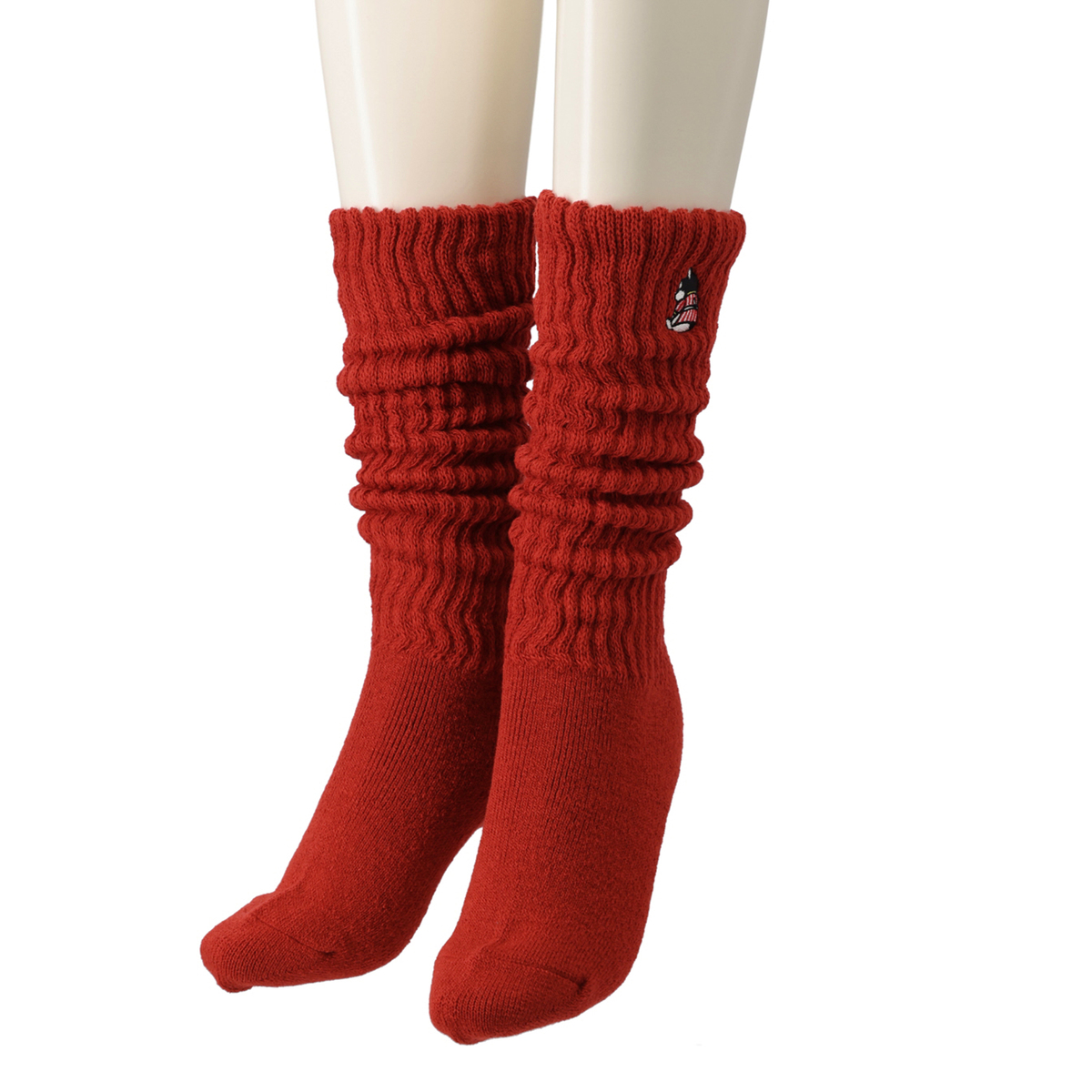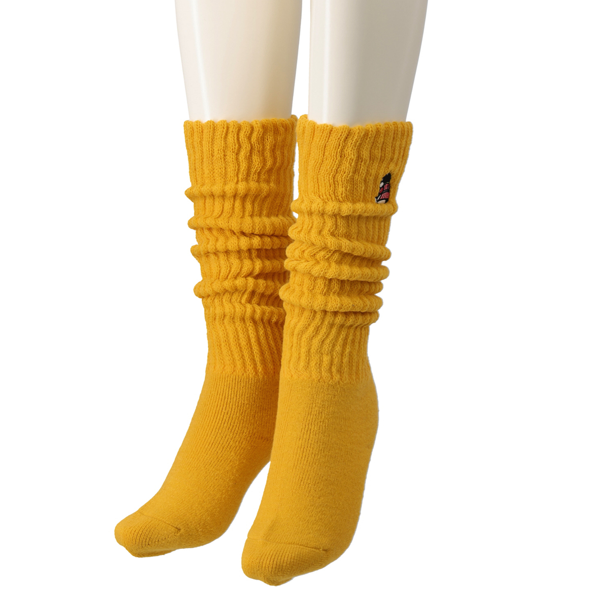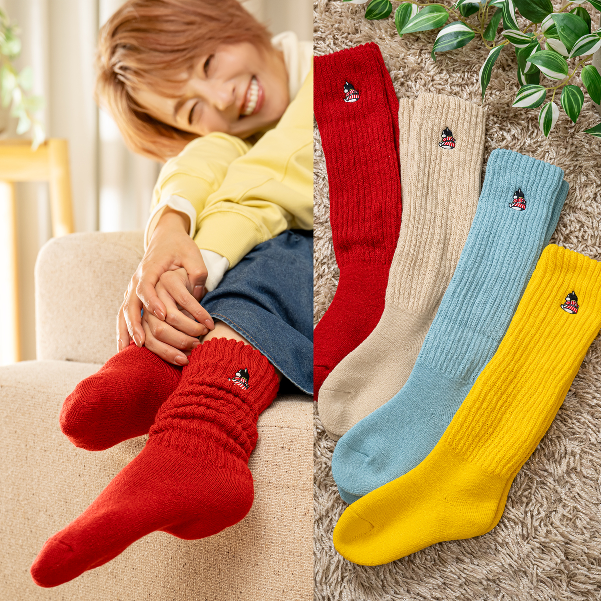 ルーズソックス風にクシュクシュさせておしゃれに履けるリブ編み仕様。ワンポイントでホット君の刺繍が入っています