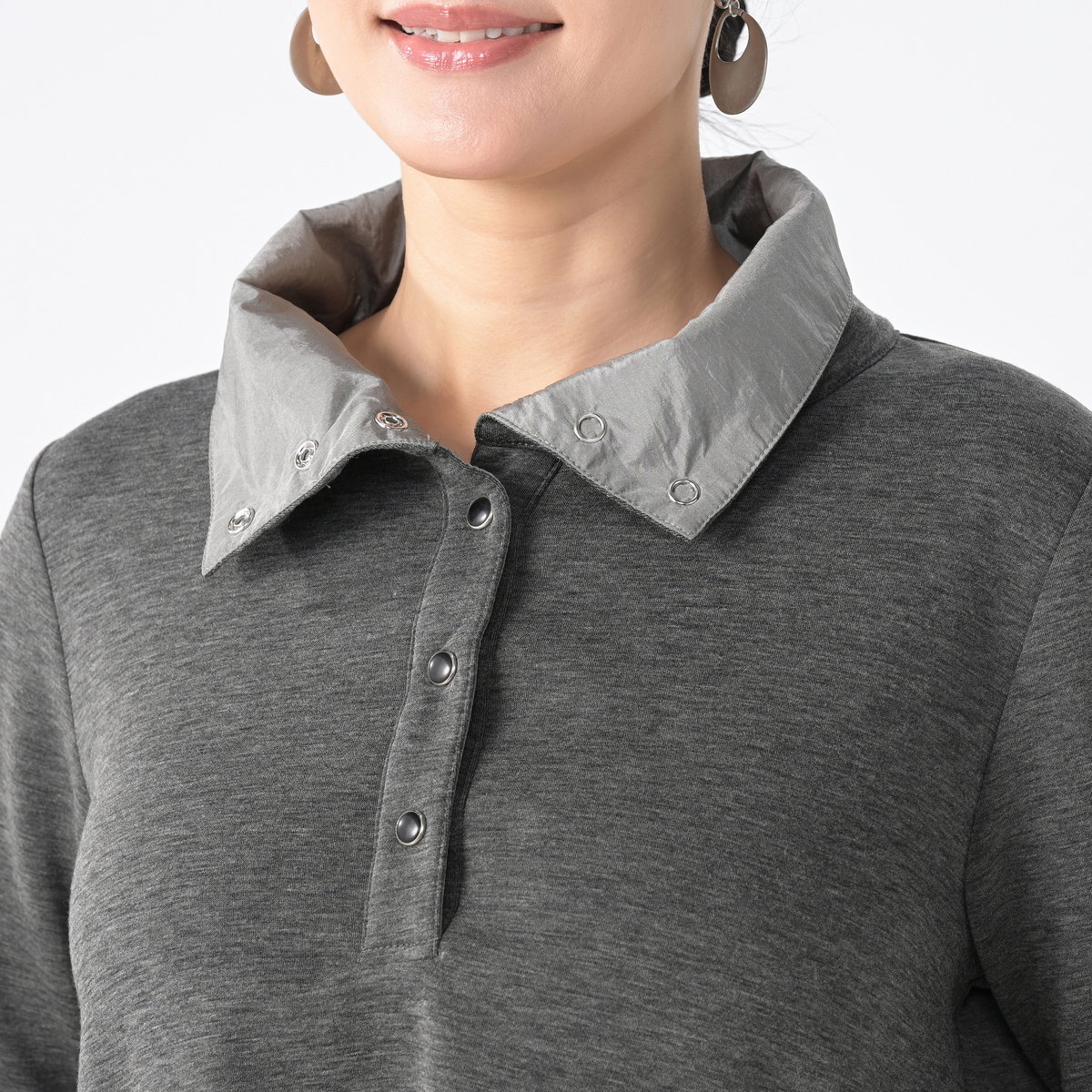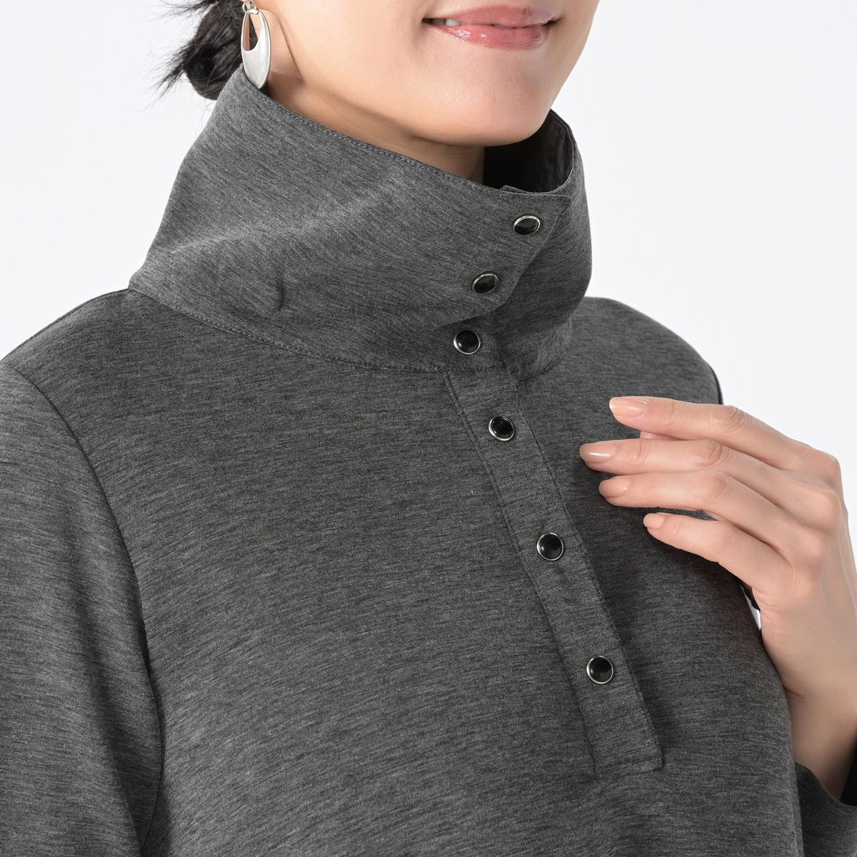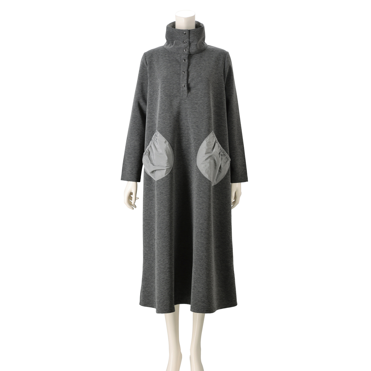 軽やかでハリ感のあるダンボール素材を使用した、異素材デザインのワンピース。シンプルながら美しいシルエットが魅力です。衿元はドットボタン仕様で、重ね着など幅広いスタイリングが楽しめます