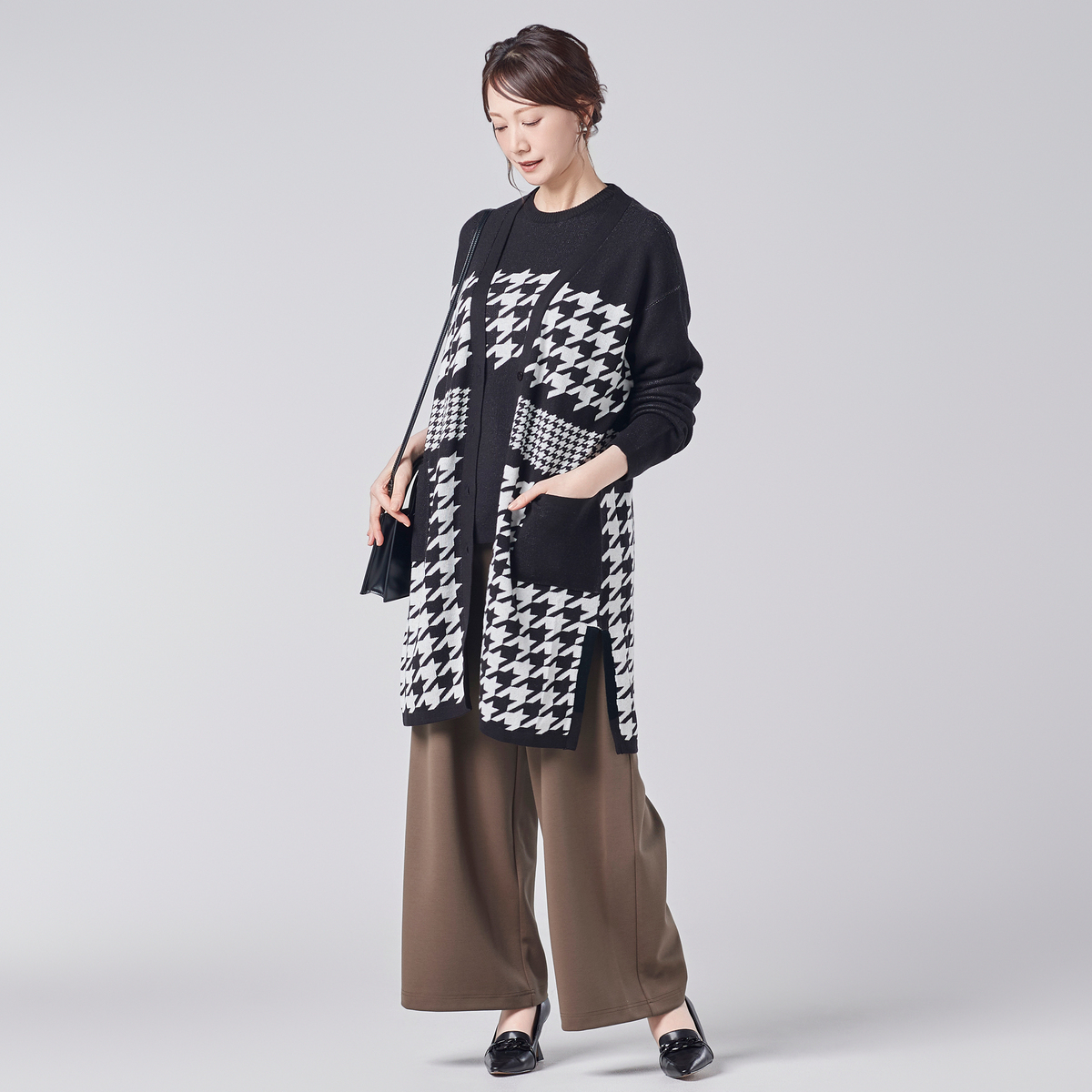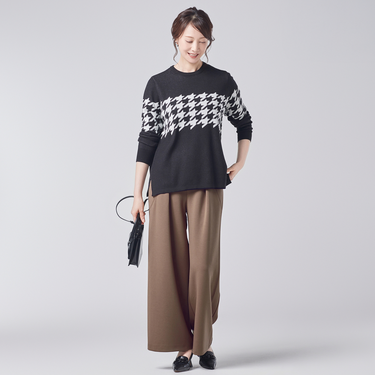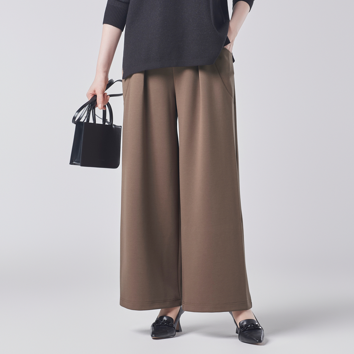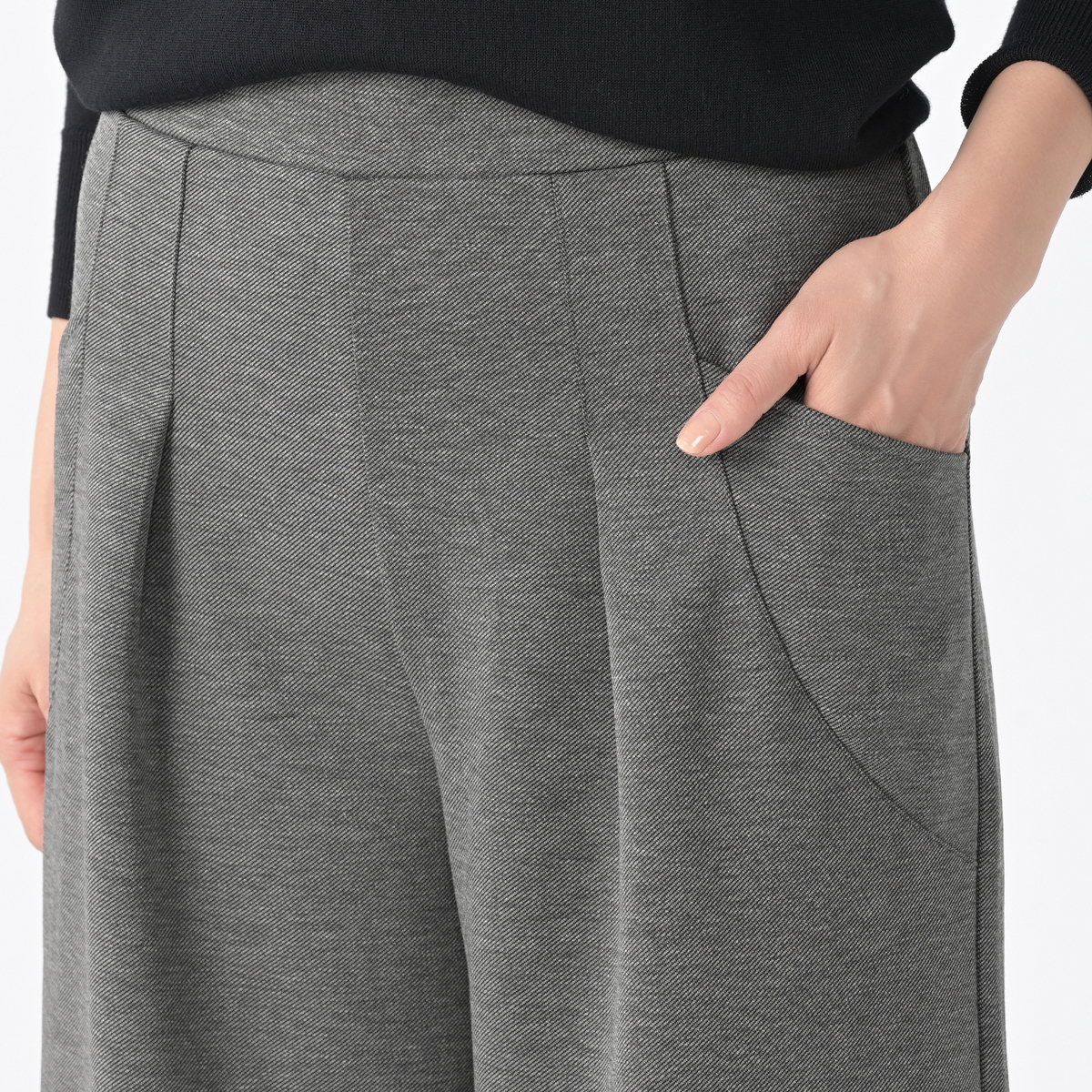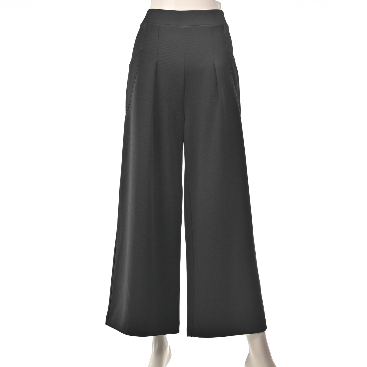 細見え効果も期待できるカーブデザインのポケットをあしらったワイドパンツ。エレガントなシルエットで、さまざまなコーディネートに組合せやすい一着です。程よい張りと落ち感のある素材が高級感を添えます