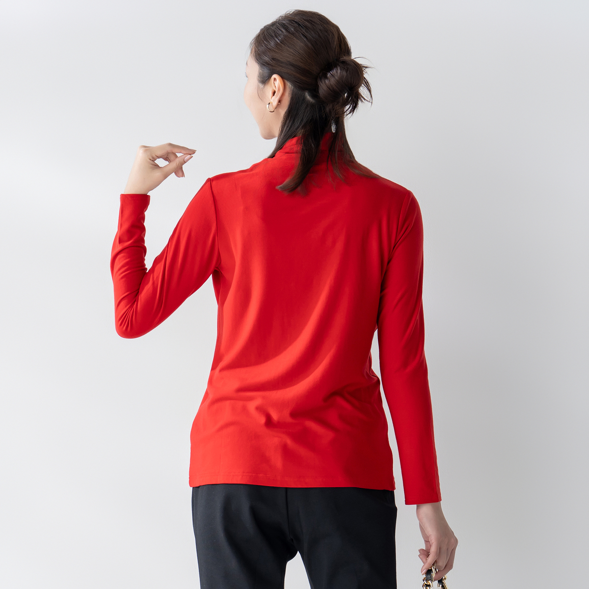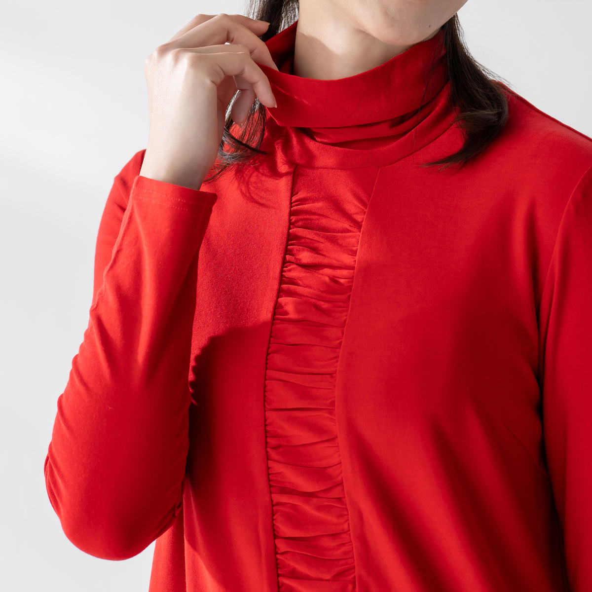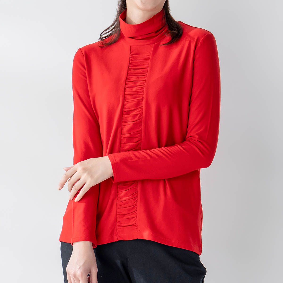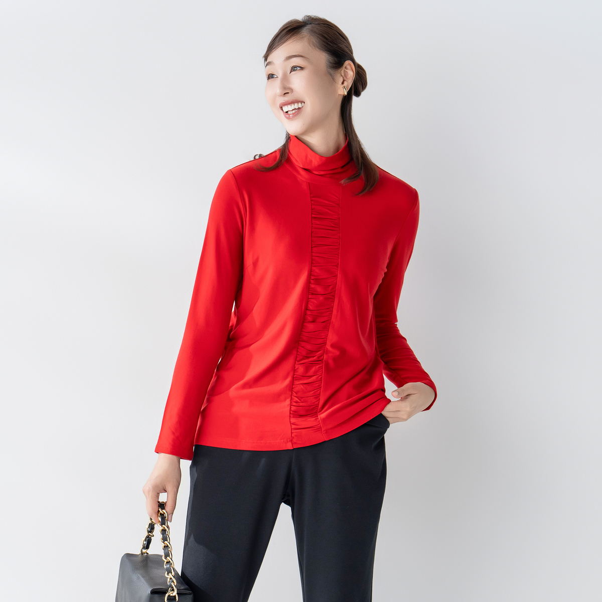 フロントに縦に施したギャザー切替がポイントのプルオーバー。吸湿発熱の機能性を備えた素材を使用しました