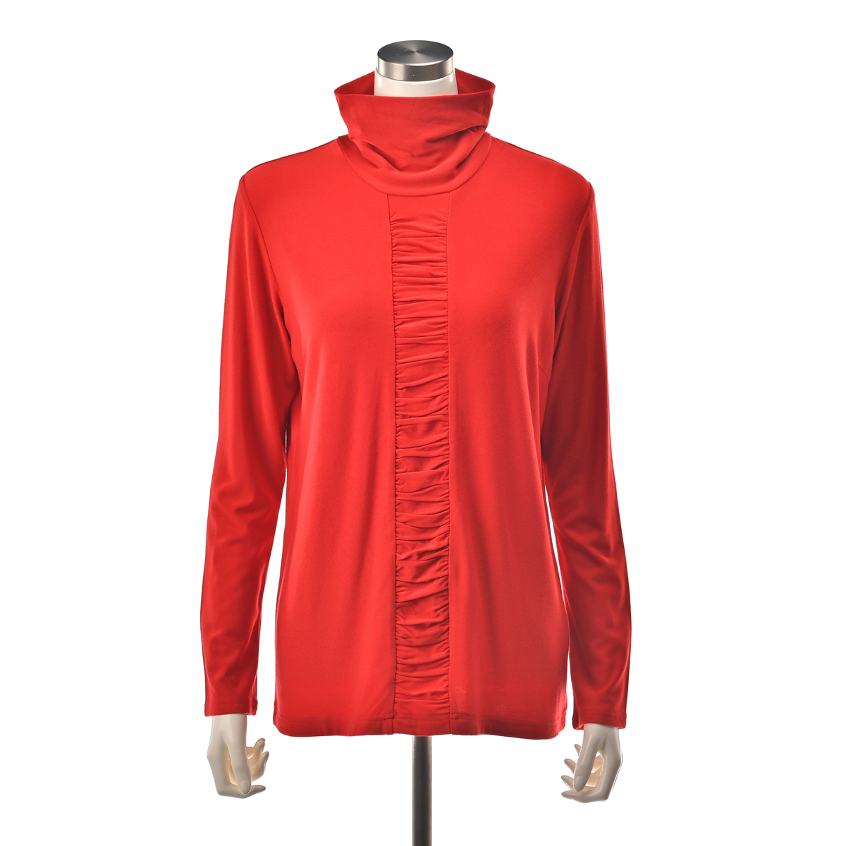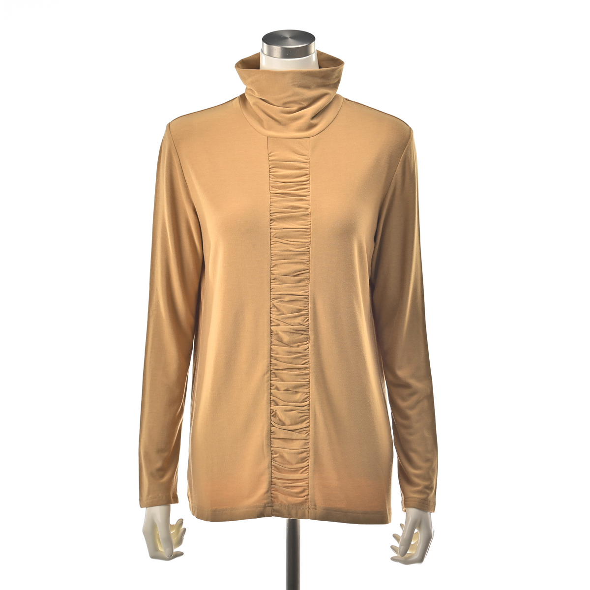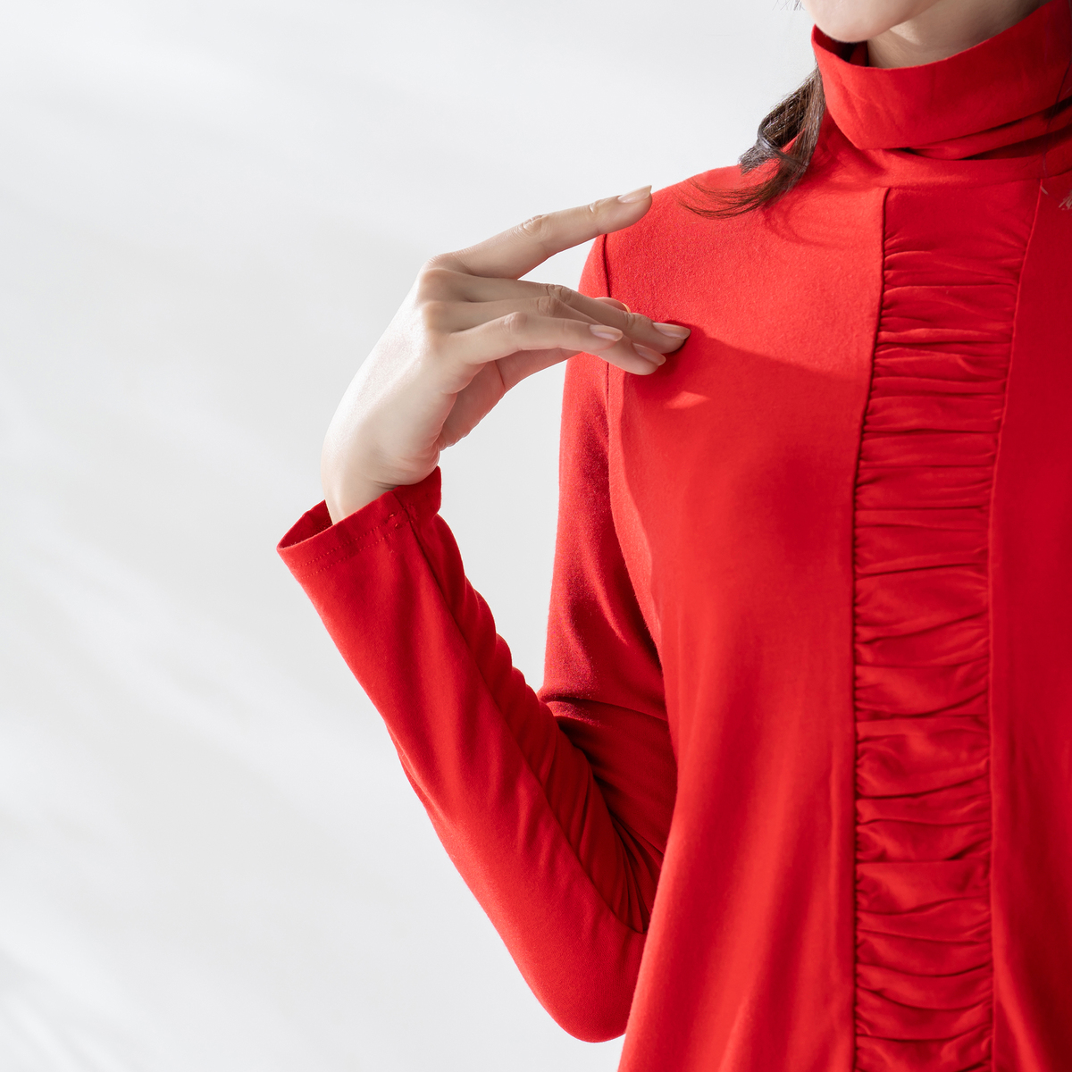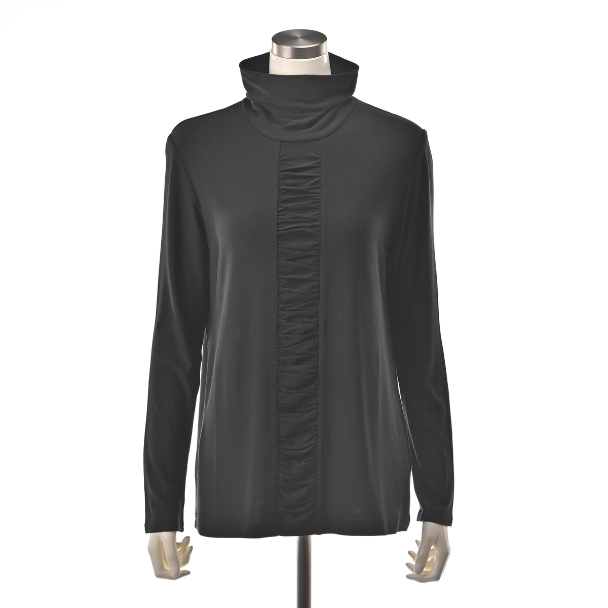 フロントに縦に施したギャザー切替がポイントのプルオーバー。吸湿発熱の機能性を備えた素材を使用しました