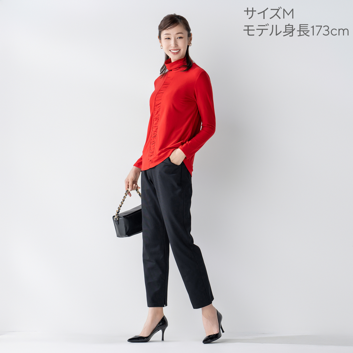 中心にギャザーがあるので羽織りアイテムと相性良く、縦のラインがスタイルをすっきり見せてくれます