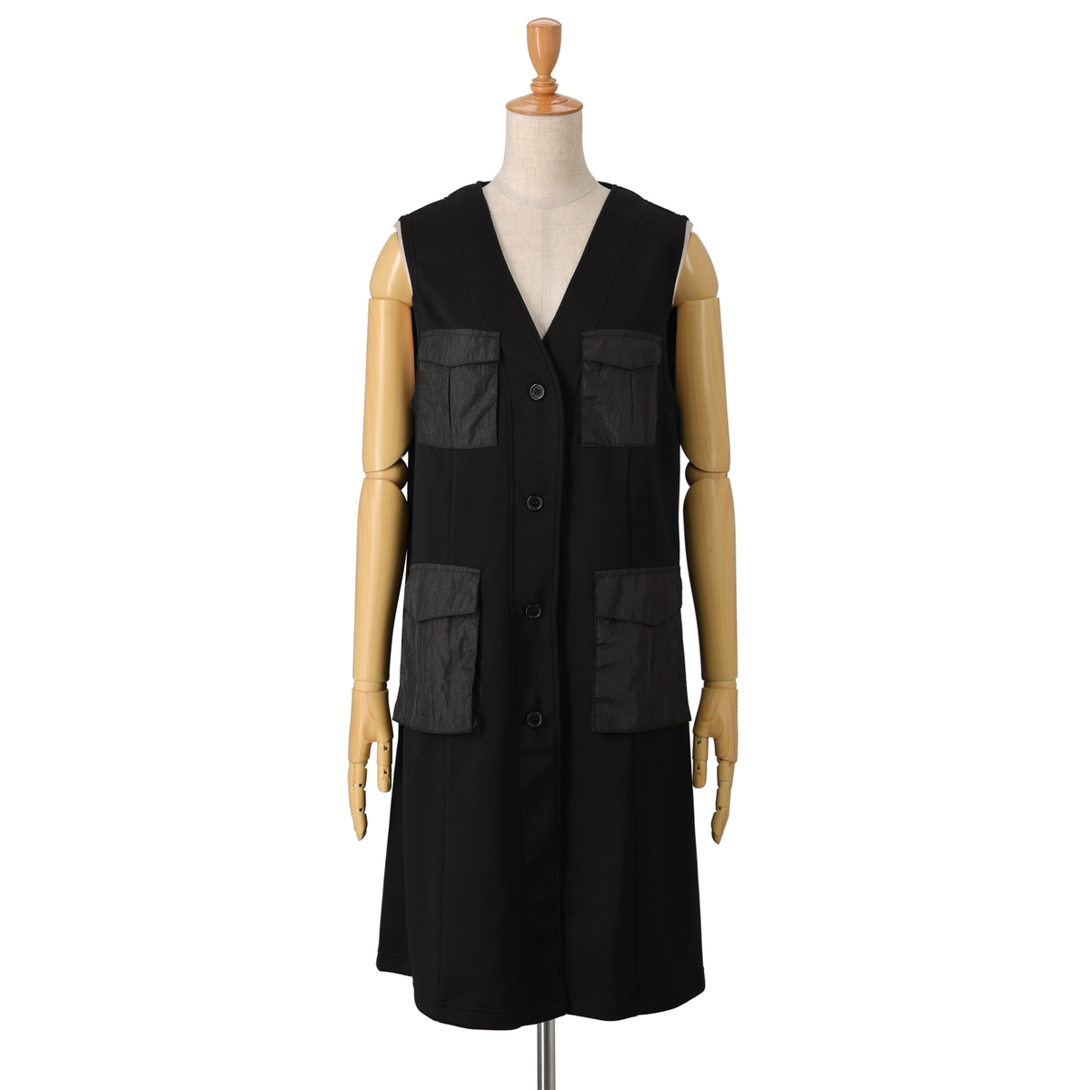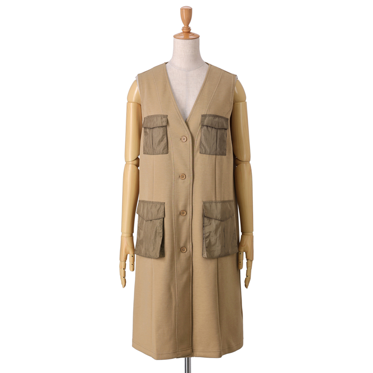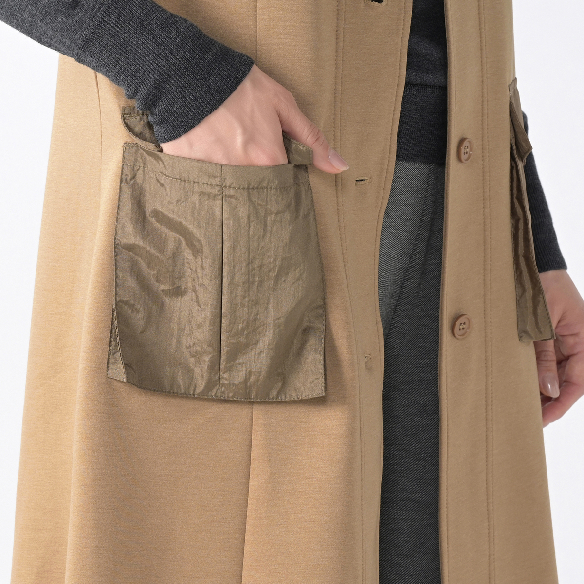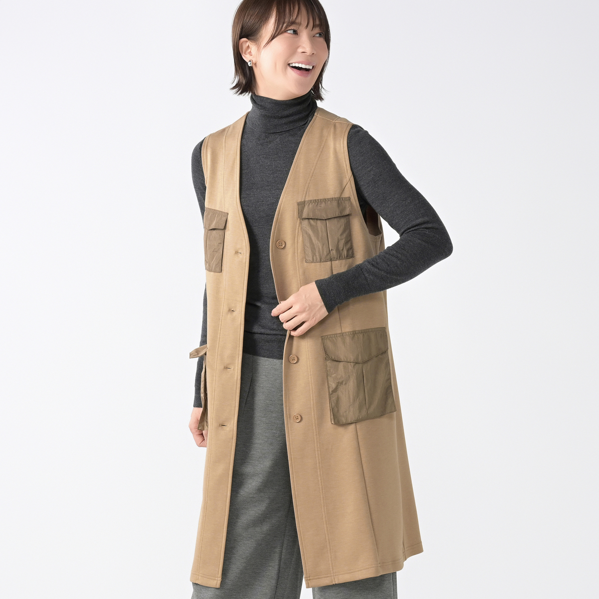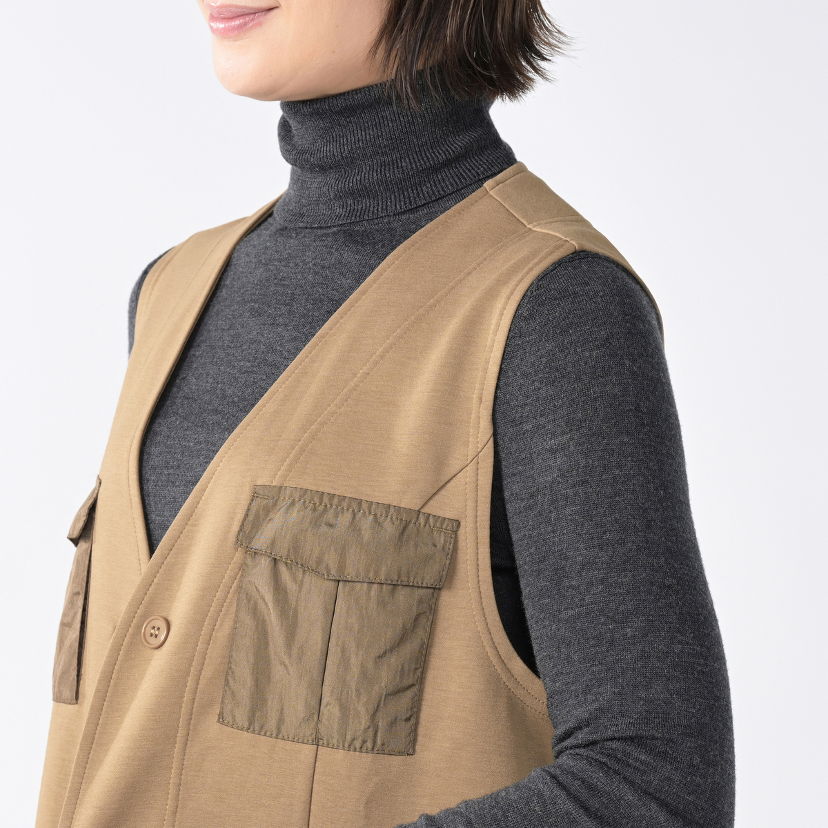 異素材の立体的なポケットが印象的なデザインジレ。軽やかで張りのある生地が、シルエットを美しく見せてくれます。カジュアルからきれいめまで幅広いスタイルに合わせやすく、洗練された着こなしを叶えます