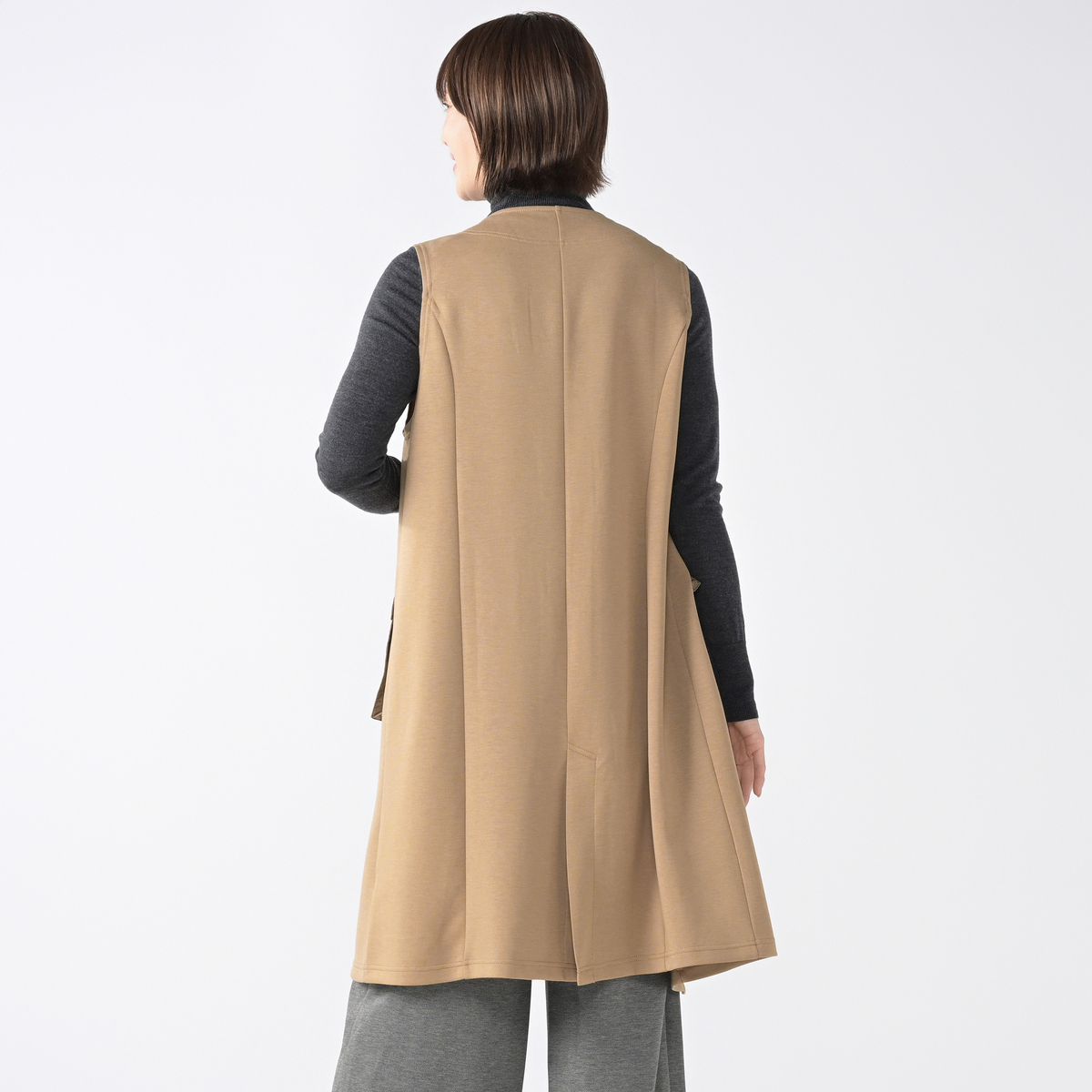 ポケットの生地が光沢があり、カジュアルな中にもセンスの良さを感じます。バックのデザインも素敵。ひろみ先生のジレはどれもデザインにポイントがあり、大ファンです。