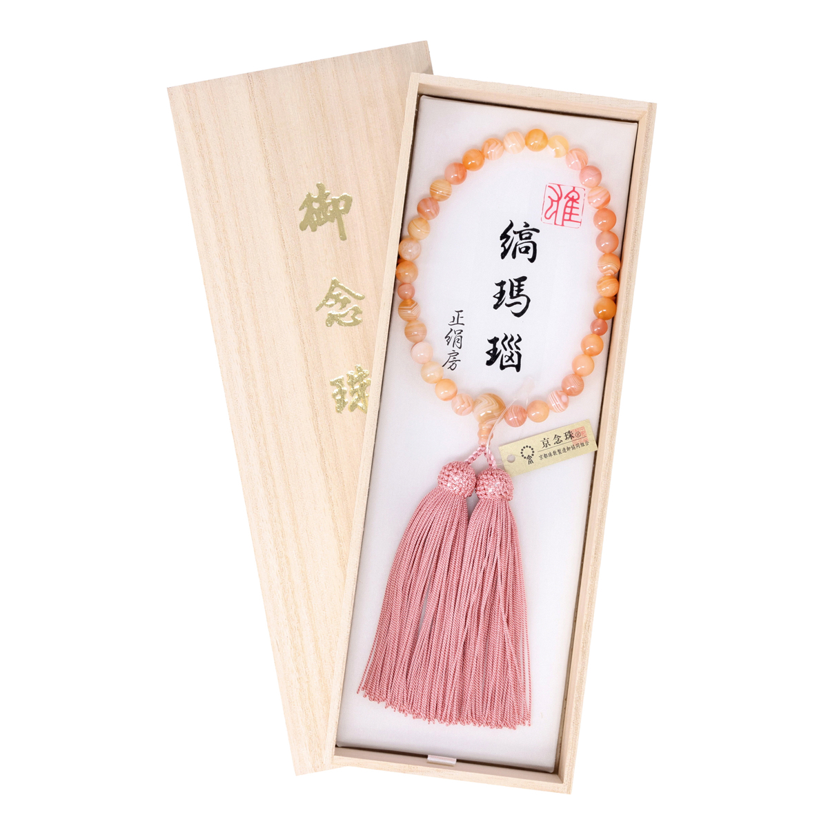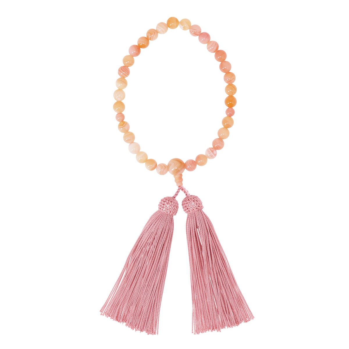 落ち着いたローズカラーの縞瑪瑙が美しい片手用の念珠。幅広い年代の方にお使いいただけるよう房の色も珊瑚のようなしっとりとした色合いのローズカラーで合わせています。専用ケースに入れてお届けします