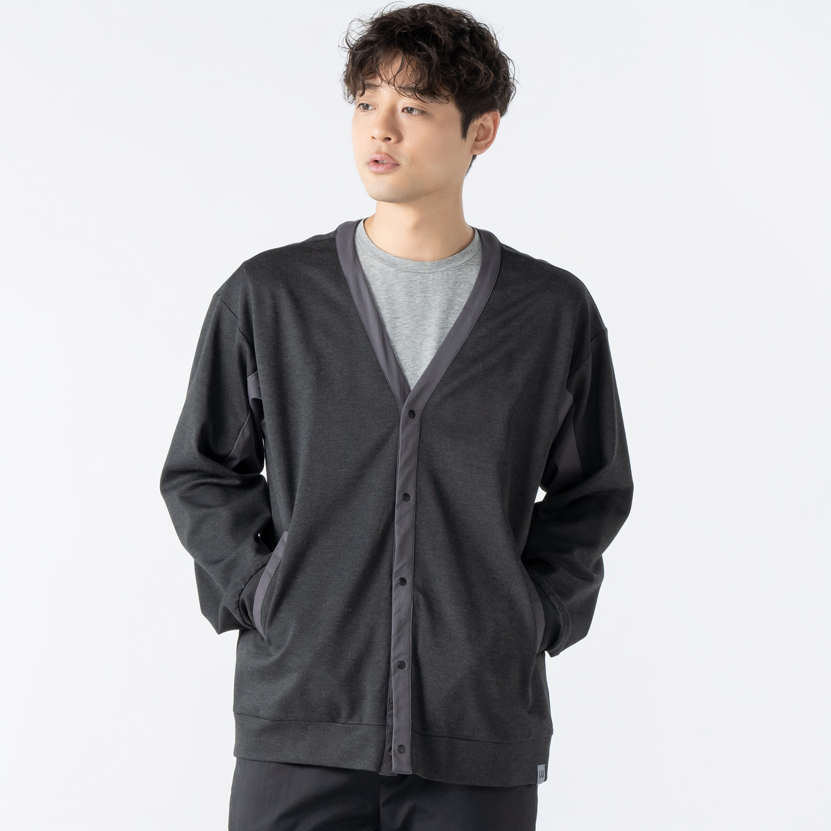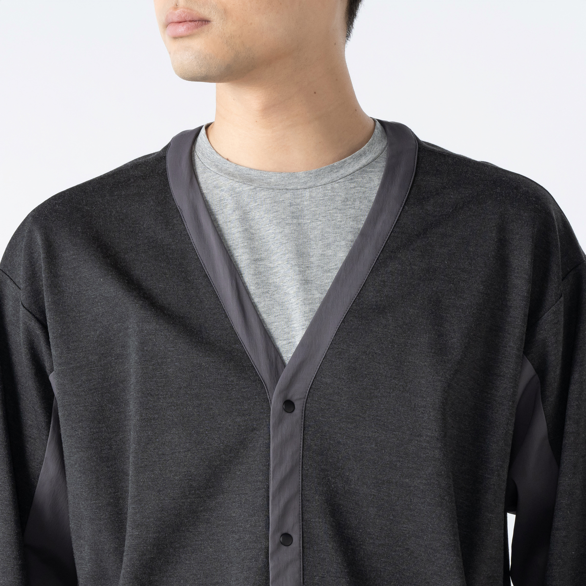 オリジナルベア天竺と布帛をドッキングした、軽やかなVネックカーディガン。さっと羽織りやすく、様々なコーデにロングシーズンで活躍してくれます